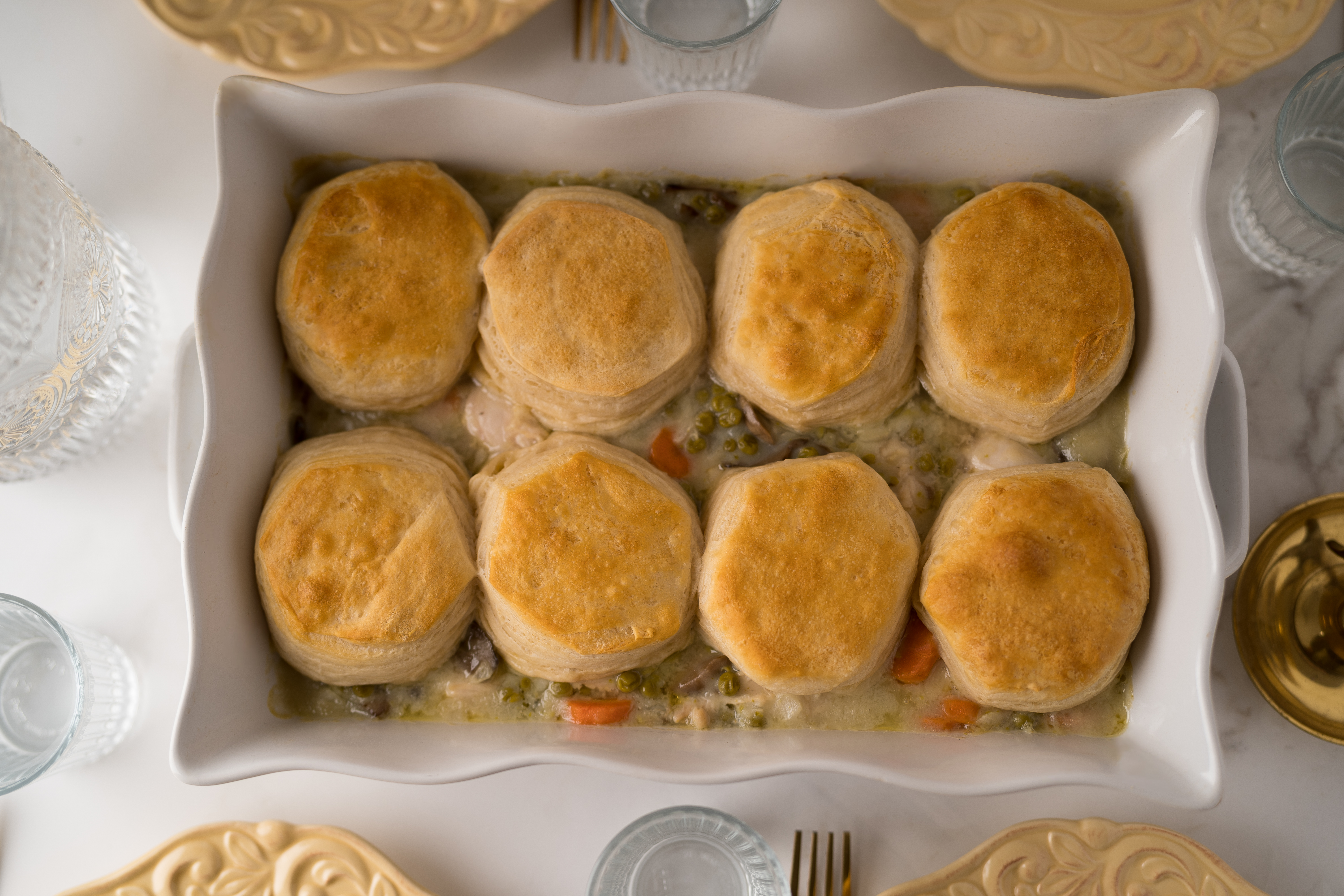 Step 8 -Place the biscuits evenly over the top of the chicken mixture.