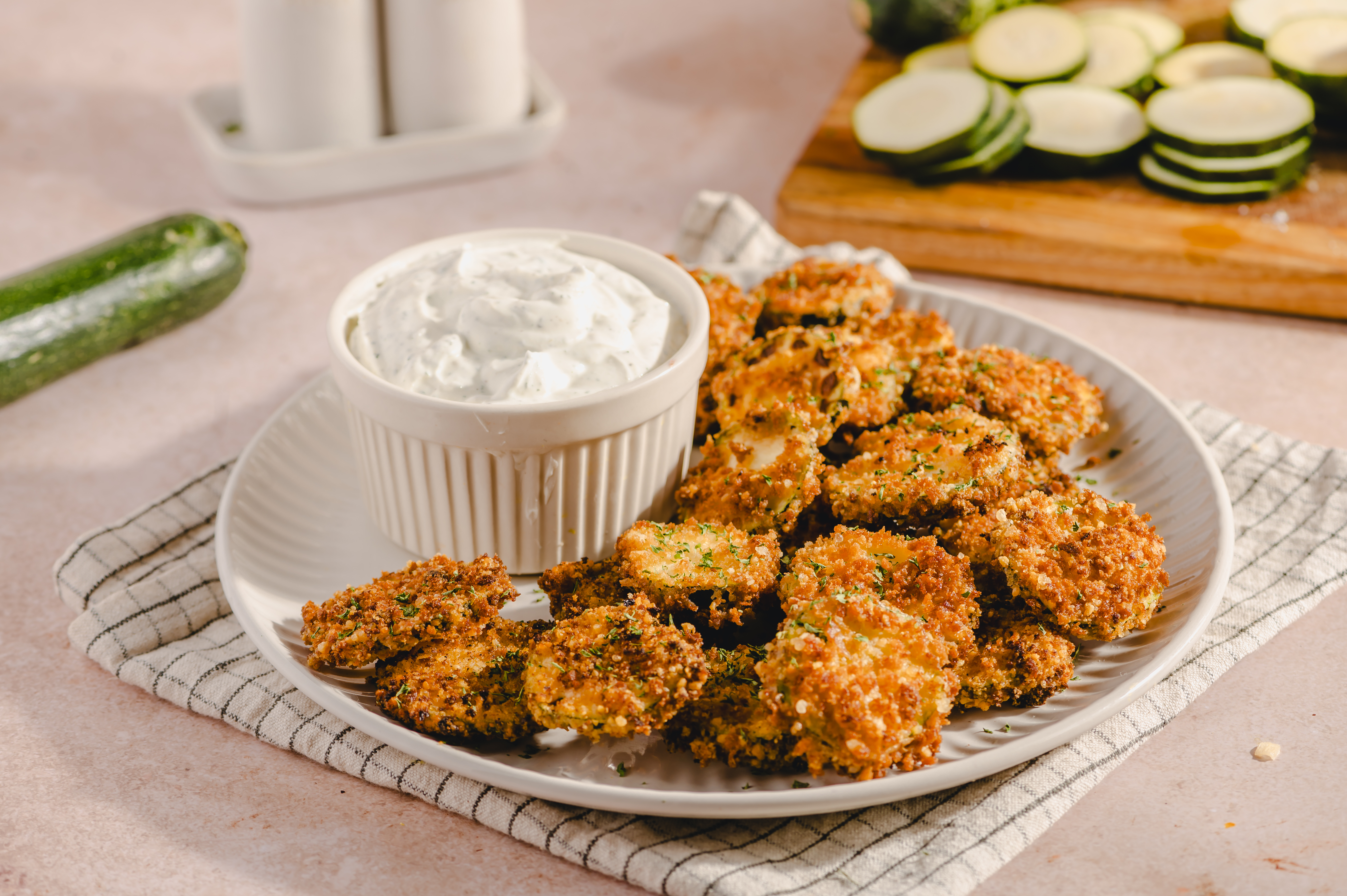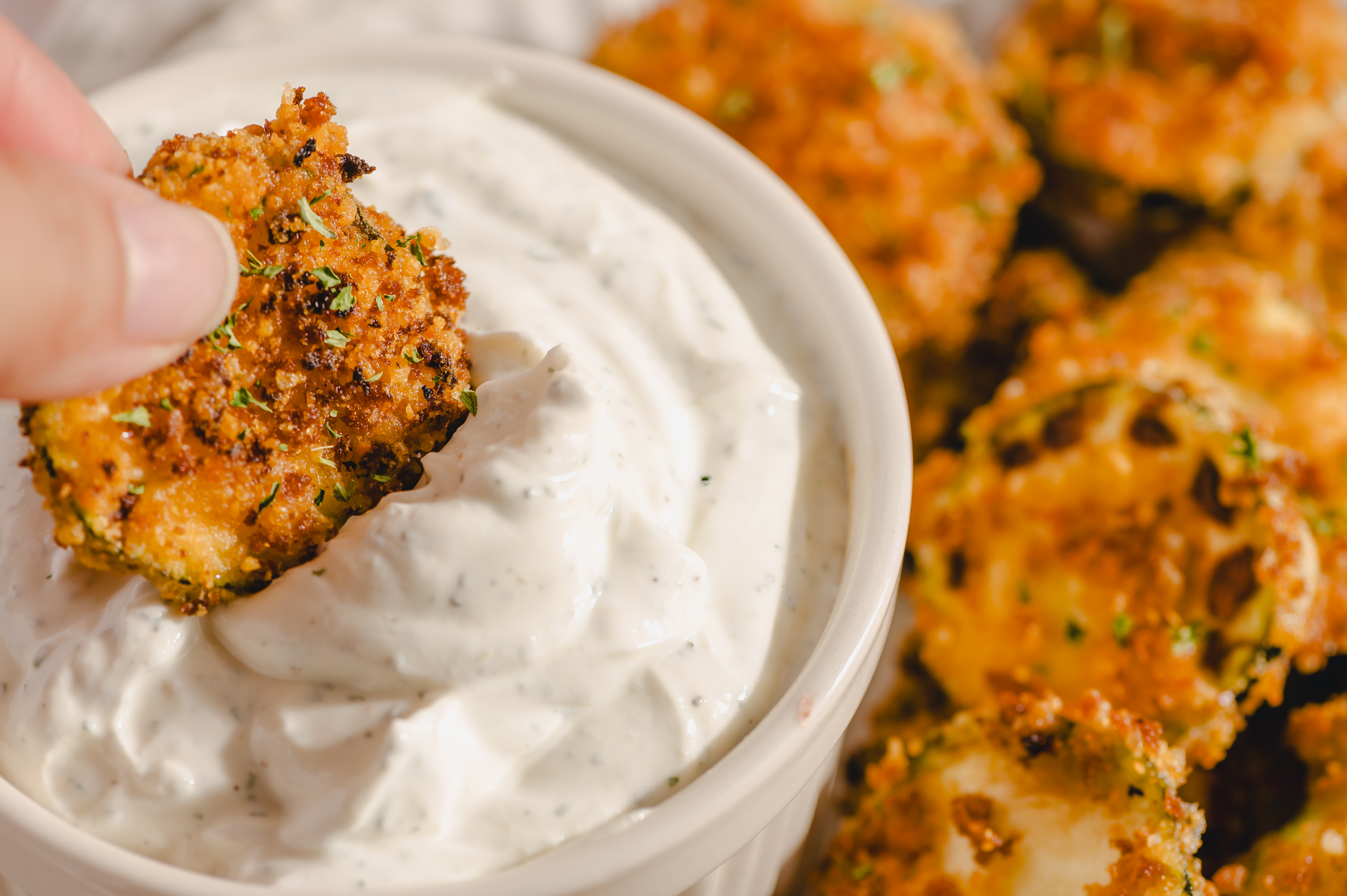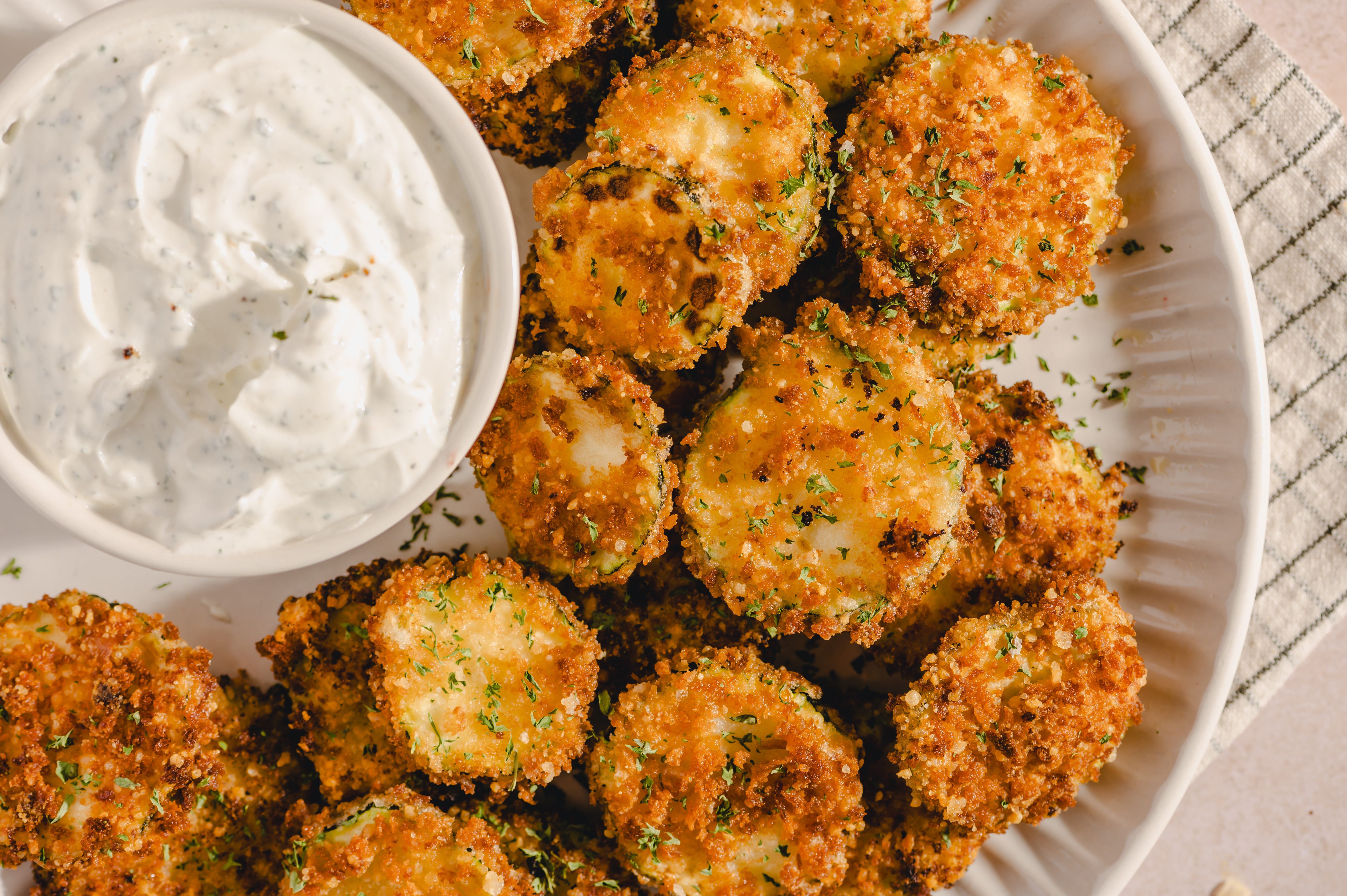 It's called A Slice Of Summer, but it's more like slices of summer! Because you're not just going to eat one! Juicy zucchini rounds, battered and breaded with sharp parmesan, are deep fried until crisp and golden-brown. That means that every part of A Slice Of Summer is crunchy, refreshing, and so delightfully summery! Dip them or eat them straight — there's no wrong answer when it comes to summer bliss!