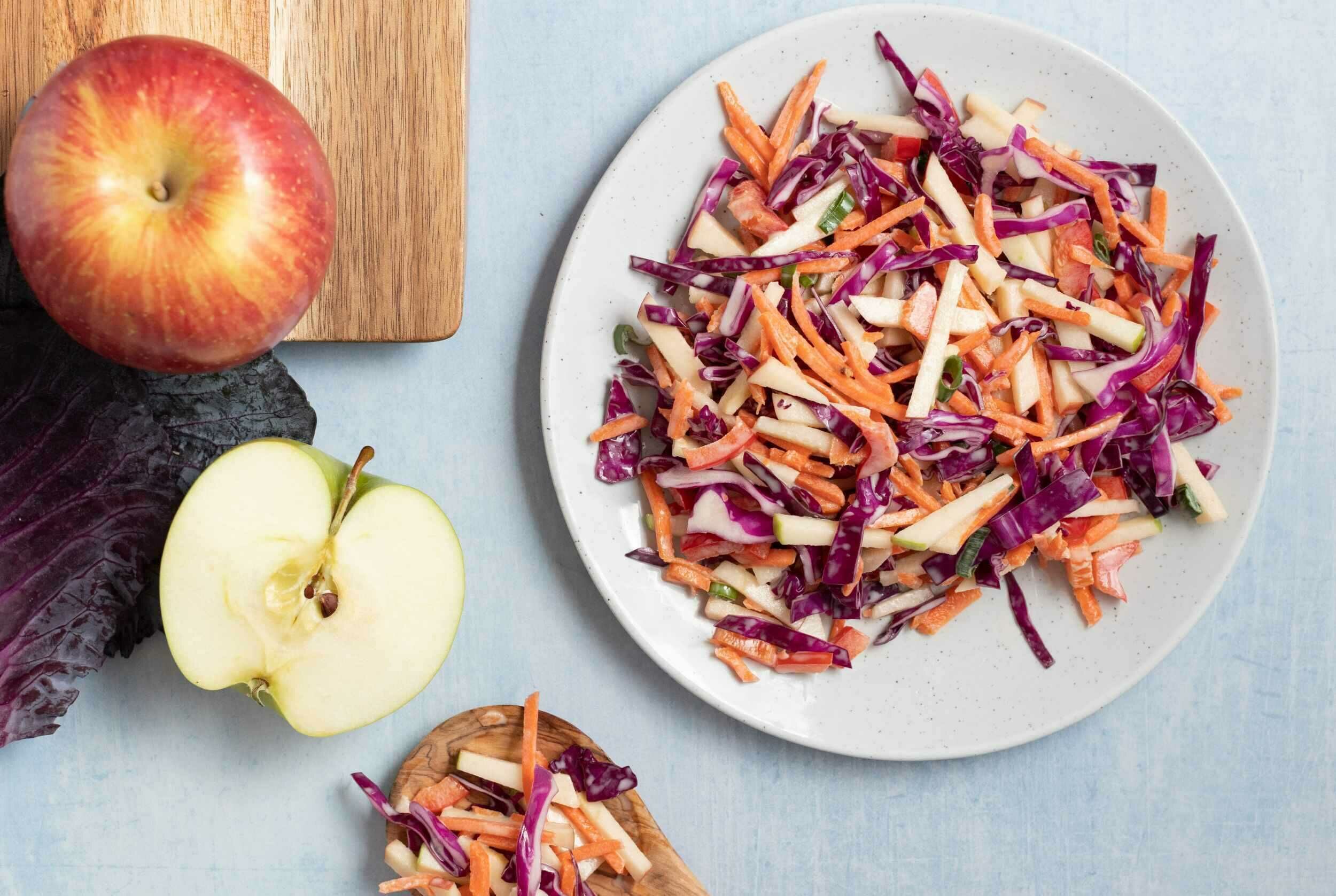 They say an apple a day keeps the doctor away, and once you crunch on some Apple Slaw, you'll be craving it on the daily–which is basically the same thing, right? It's technically even better for you, too, because there's nourishing cabbage, crunchy carrots, sweet red bell peppers, and fresh green onions mixed with the crispy red and Granny Smith apples. Covered in a creamy, sweet dressing, Apple Slaw will have you feeling fine and dandy!