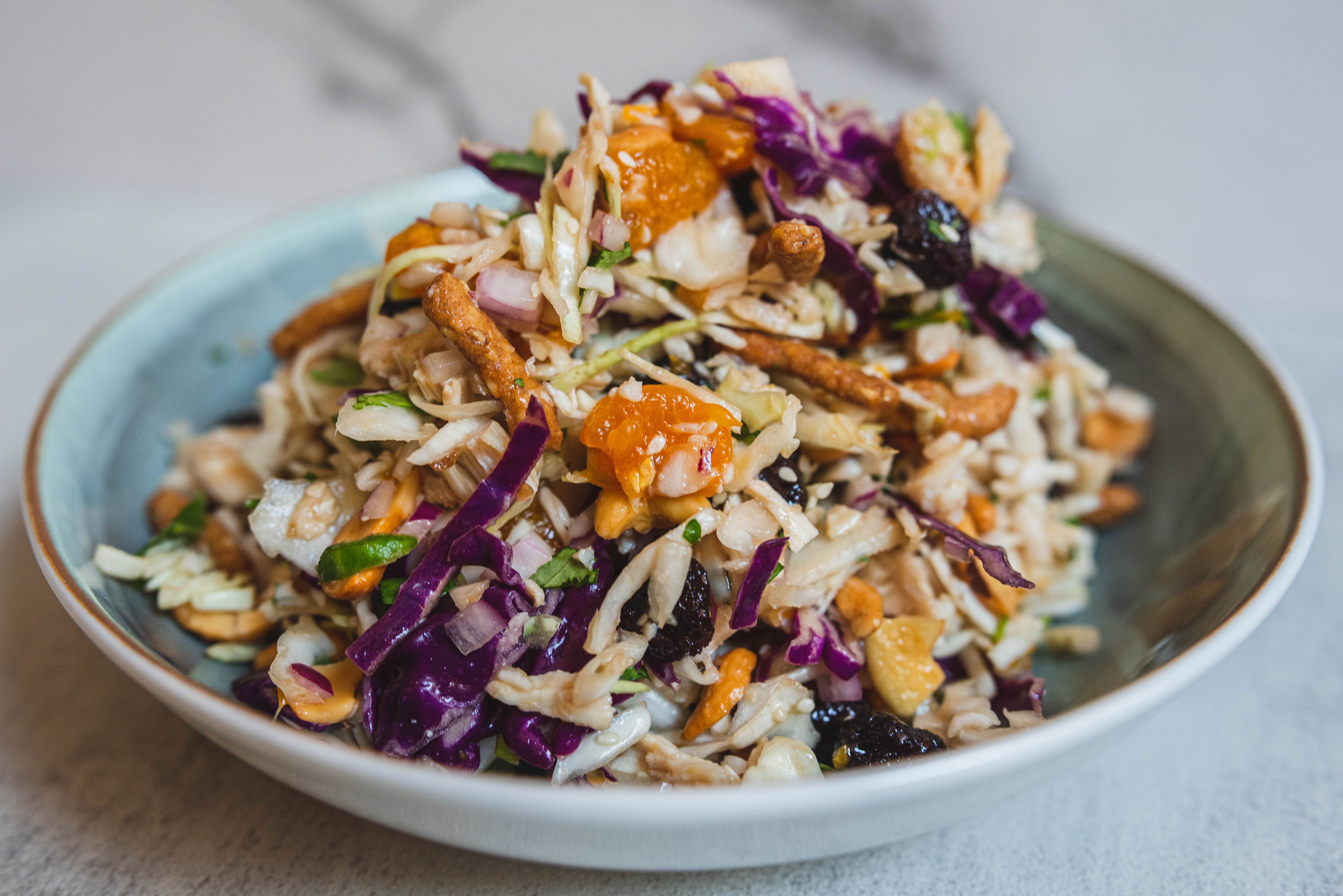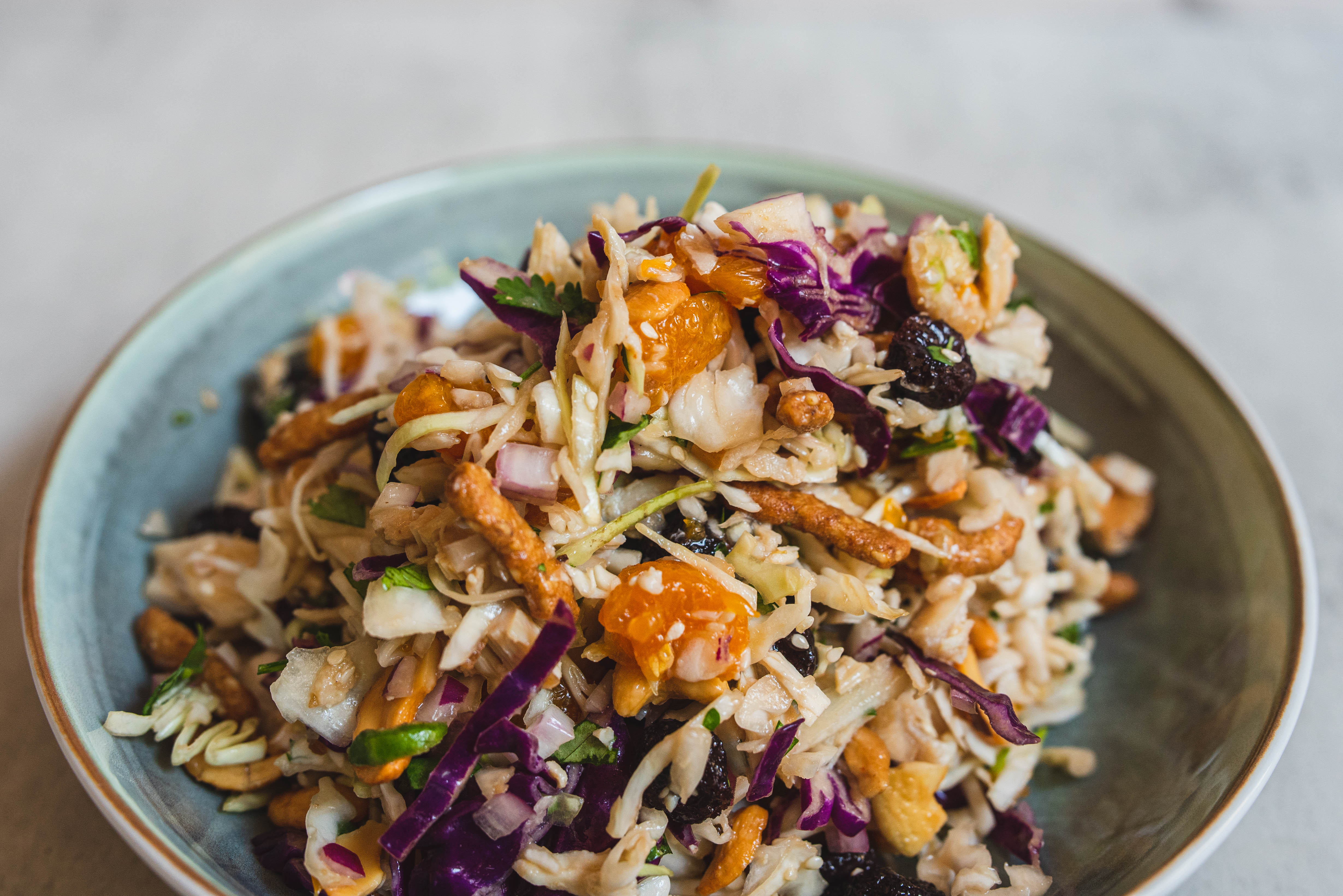There's a lot of crunch to go around when this Asian Chicken Salad is on the table! Coleslaw, toasted almonds, sesame sticks... you can hear this salad for miles, and it sounds good! But of course, that's not all there is to Asian Chicken Salad! Sunny oranges, savory chicken, and a sweet, soy-sauce-infused dressing really makes this a flavor feast all around! This can be made in a snap, which is good because you might just find yourself craving more of it after the first bite!