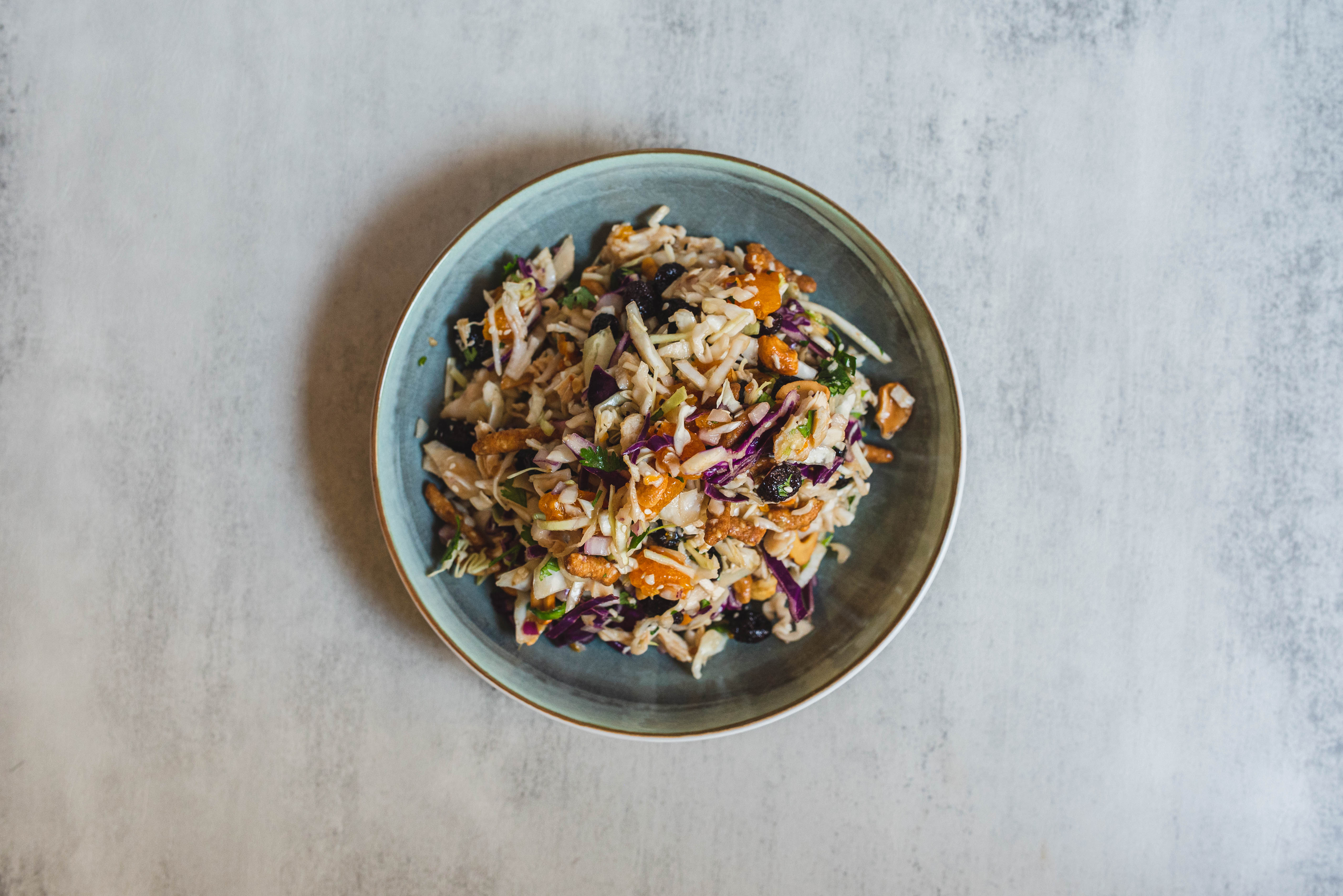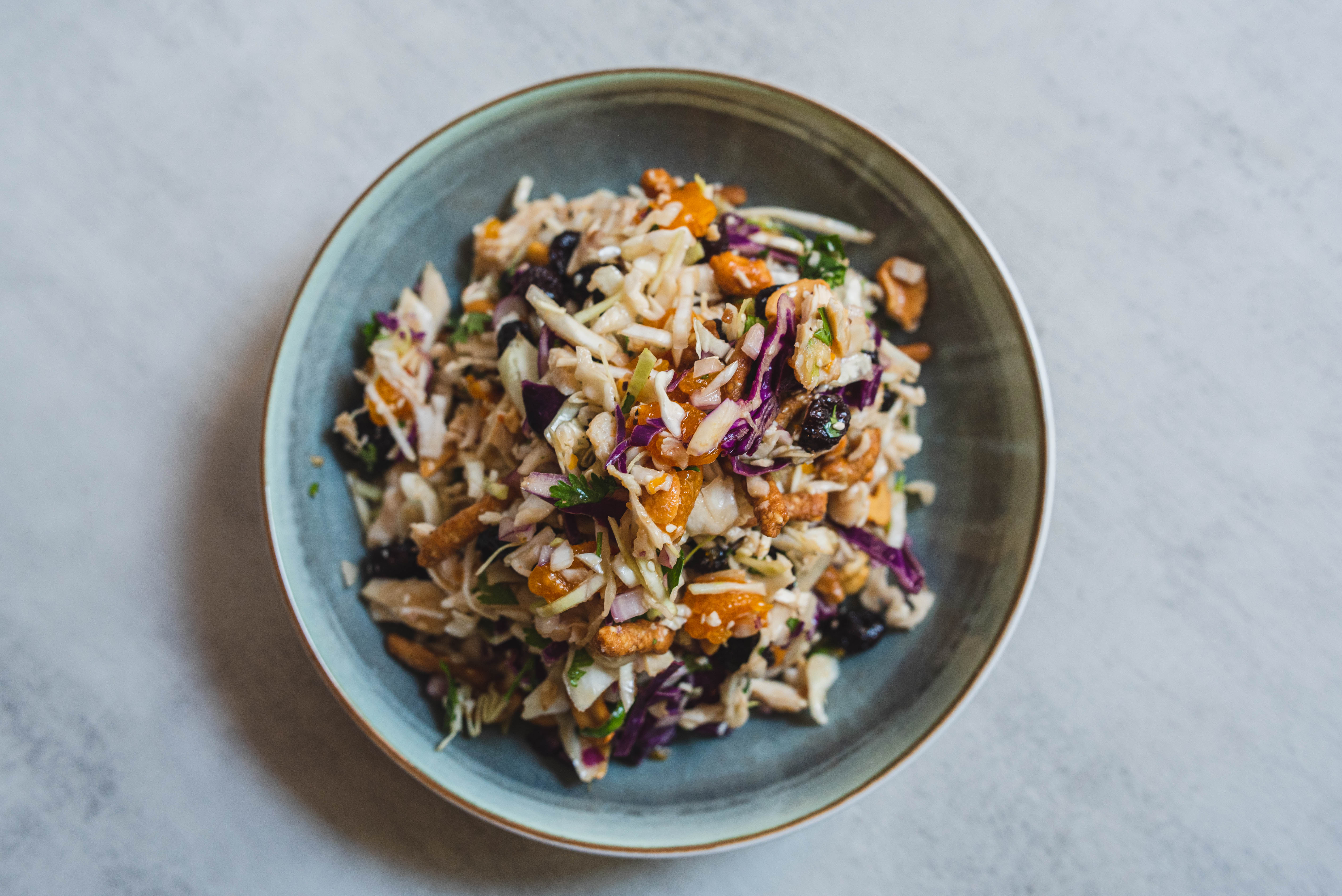 Step 1 -In a large bowl, layer the coleslaw mix, the chicken, the almonds, the cranberries, the red onion, the sesame seeds, the fresh cilantro, and the sesame sticks.