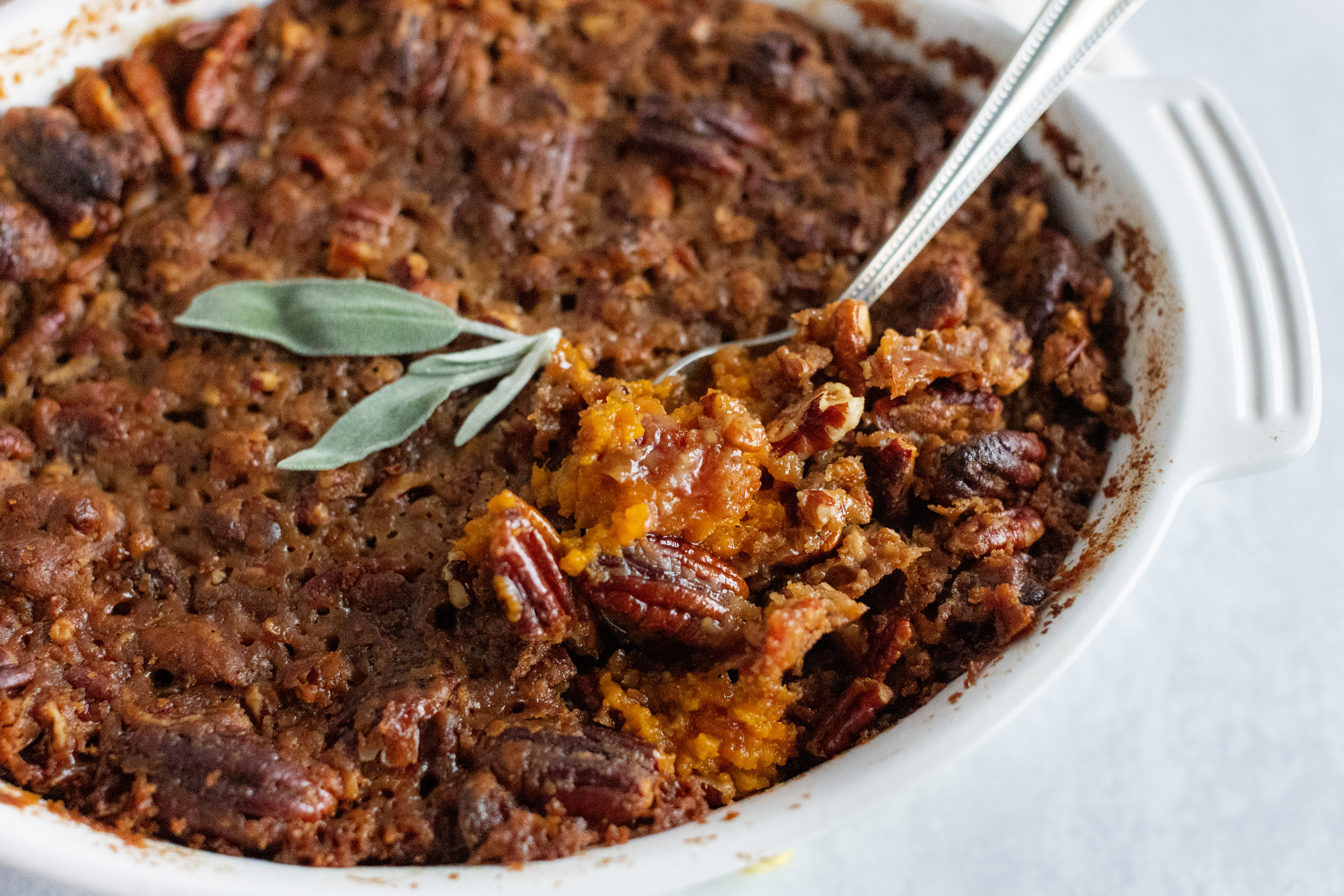 It's sweet! It's savory! It's incredible! Bacon Sweet Potato Casserole is all the best stuff in one baking dish, hot and eager to get scooped up! The topping is crunchy — toasted pecans and succulent bacon bites in an aromatic crumble — while the filling is a creamy sweet potato mash enhanced with brown sugar and even a little bourbon for extra smoky flavor! Bacon Sweet Potato Casserole really brings home the bacon!