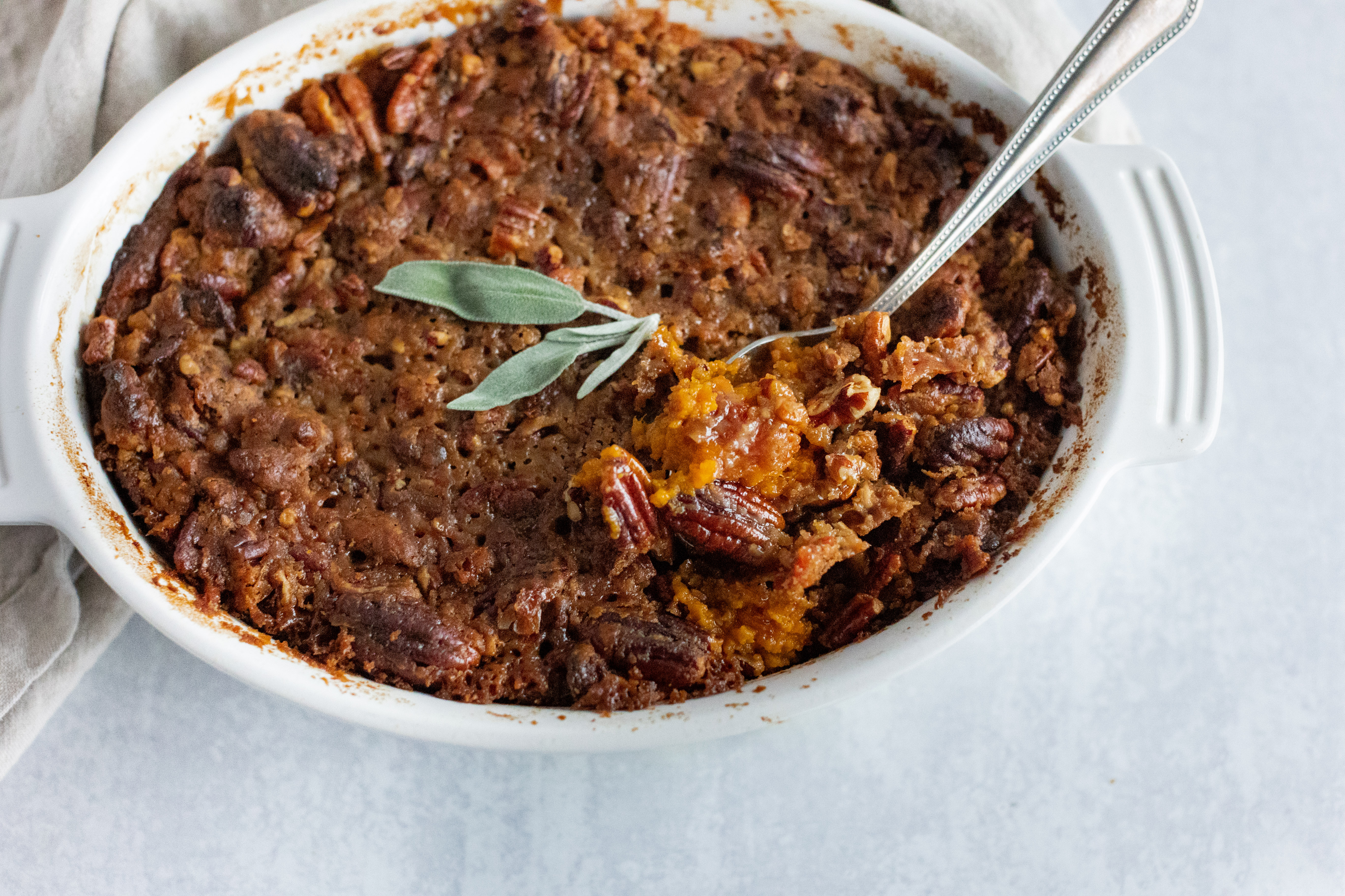 Step 17 -Sprinkle the pecan mixture evenly over top of the sweet potato mixture.