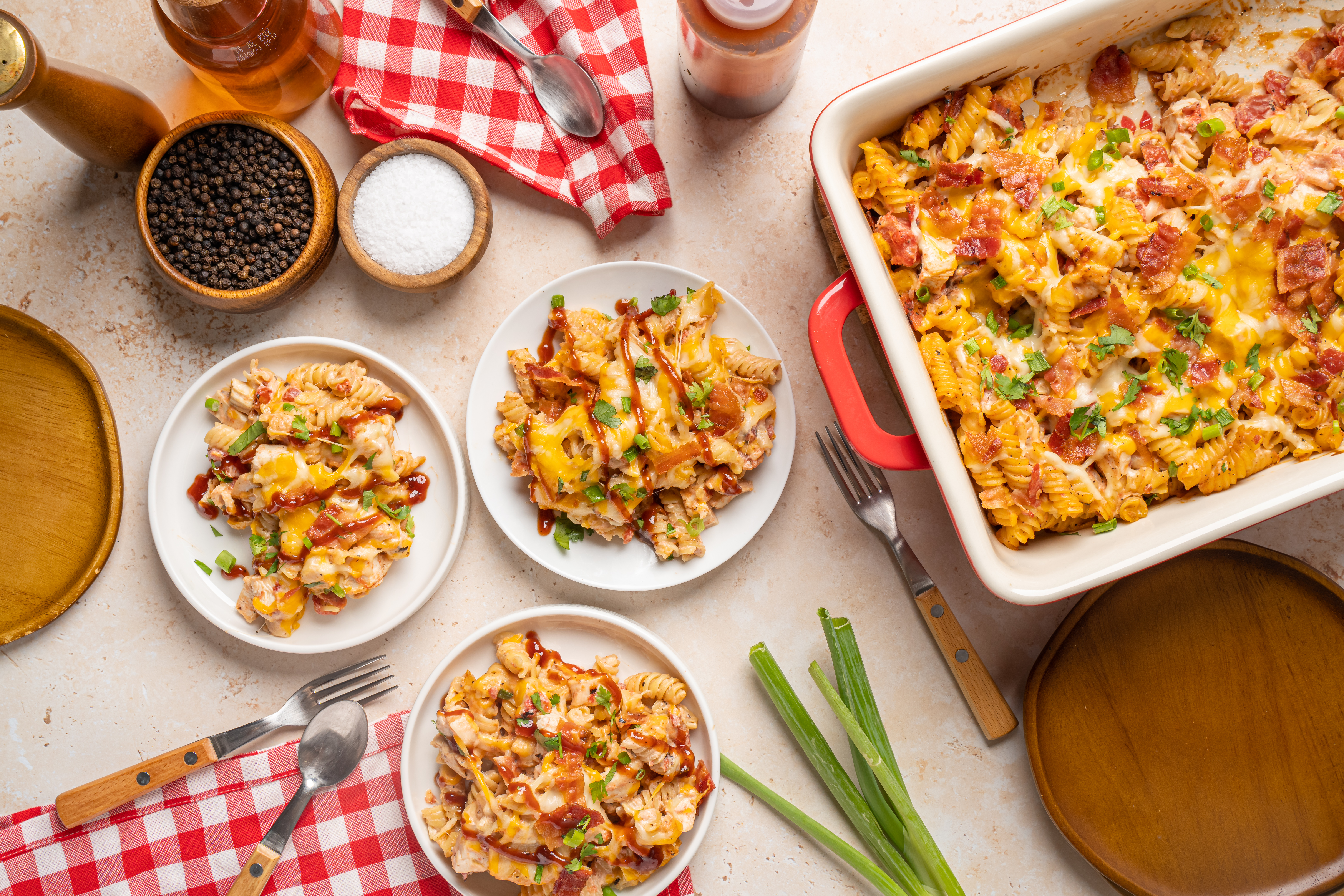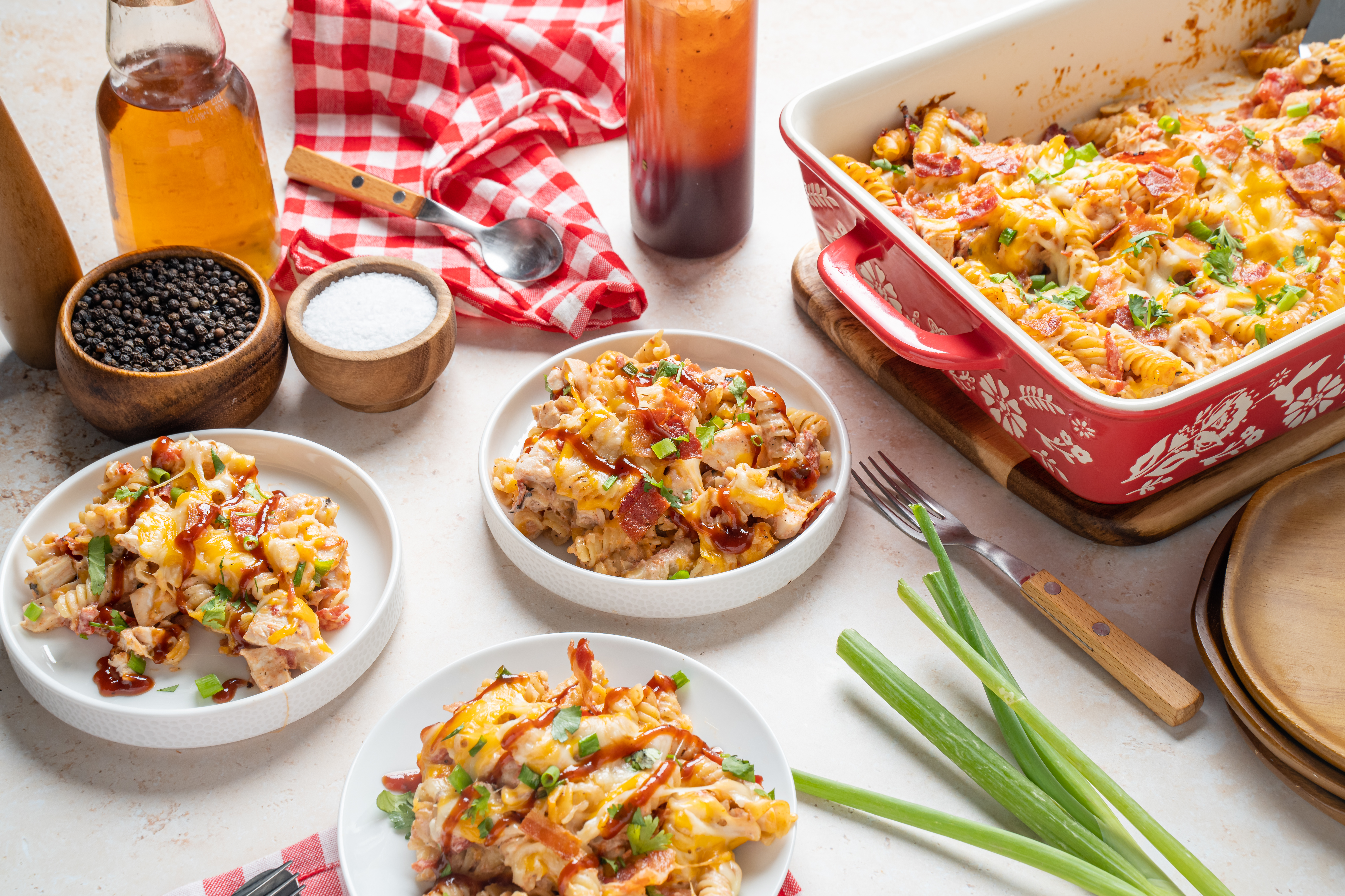 You can always bring the barbeque indoors with this BBQ Chicken Bake, and you're going to want to! Bouncy pasta is the foundation of a delicious mix of savory chicken bathed in sweet-and-smoky barbeque sauce, with succulent bacon bits and bright tomatoes! Tangy sour cream and melty cheese add richness and creamy goodness! It's all great news, and it's getting better with each bite! BBQ Chicken Bake allows to achieve that cook-out, grilling vibe, without even going outside!