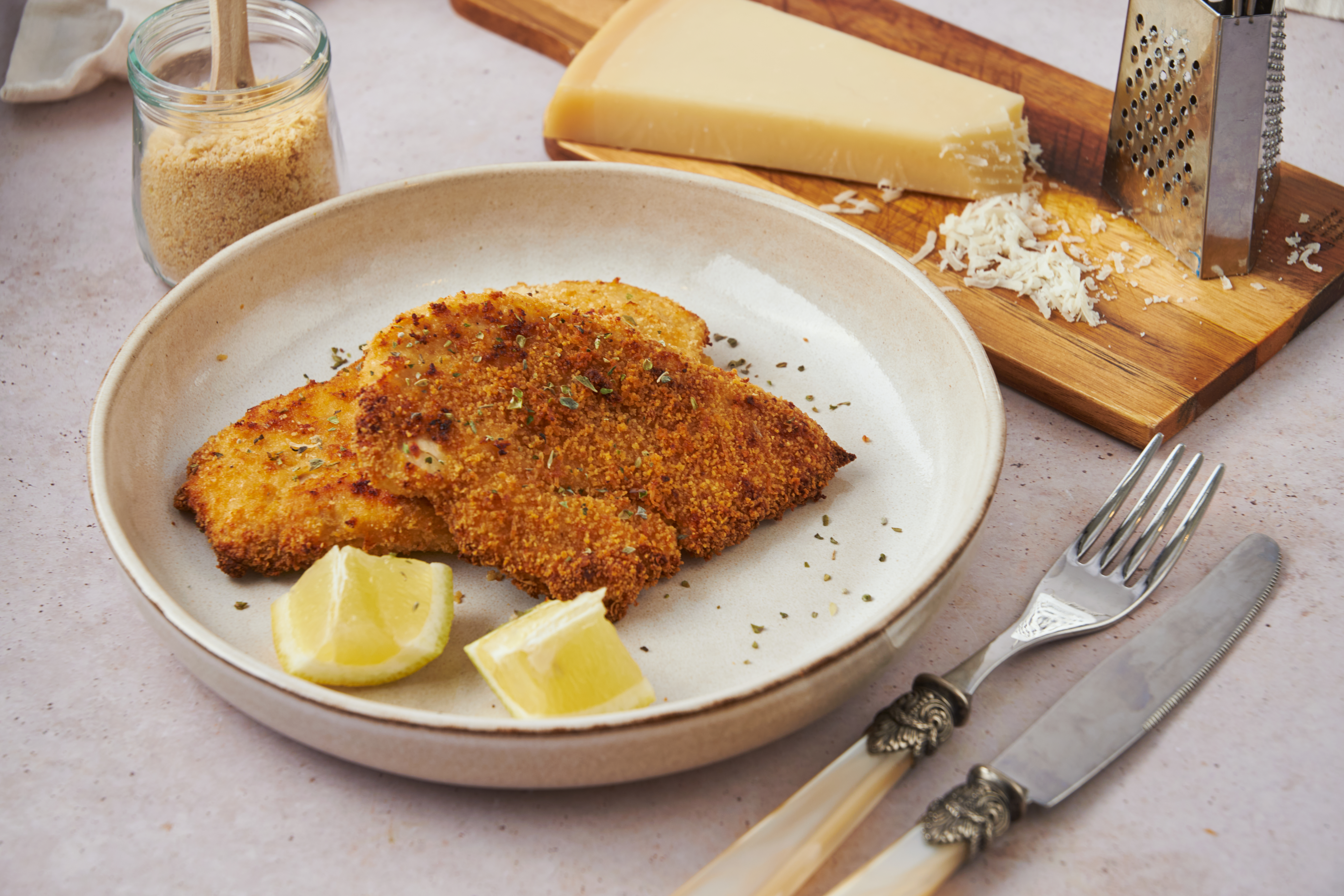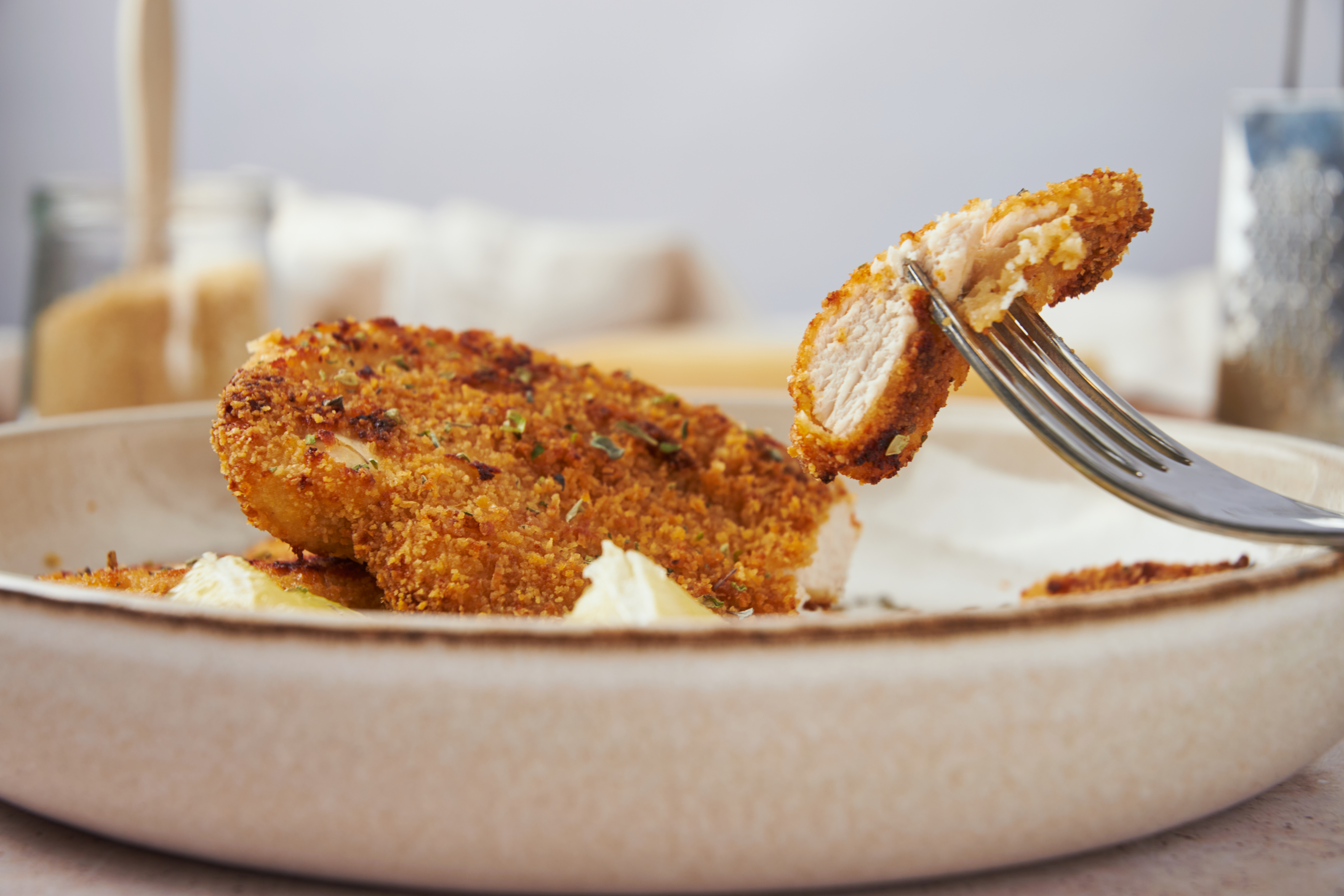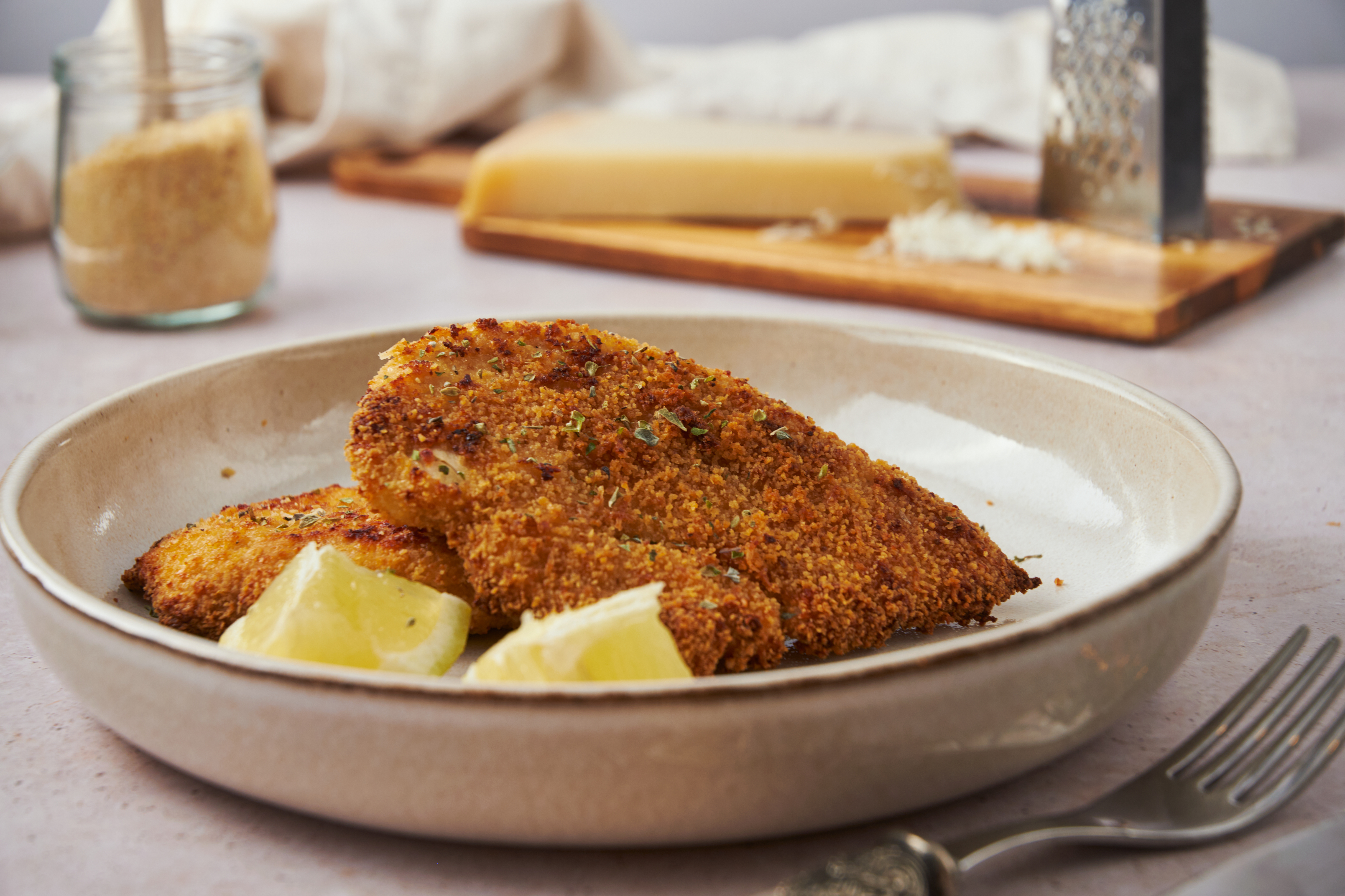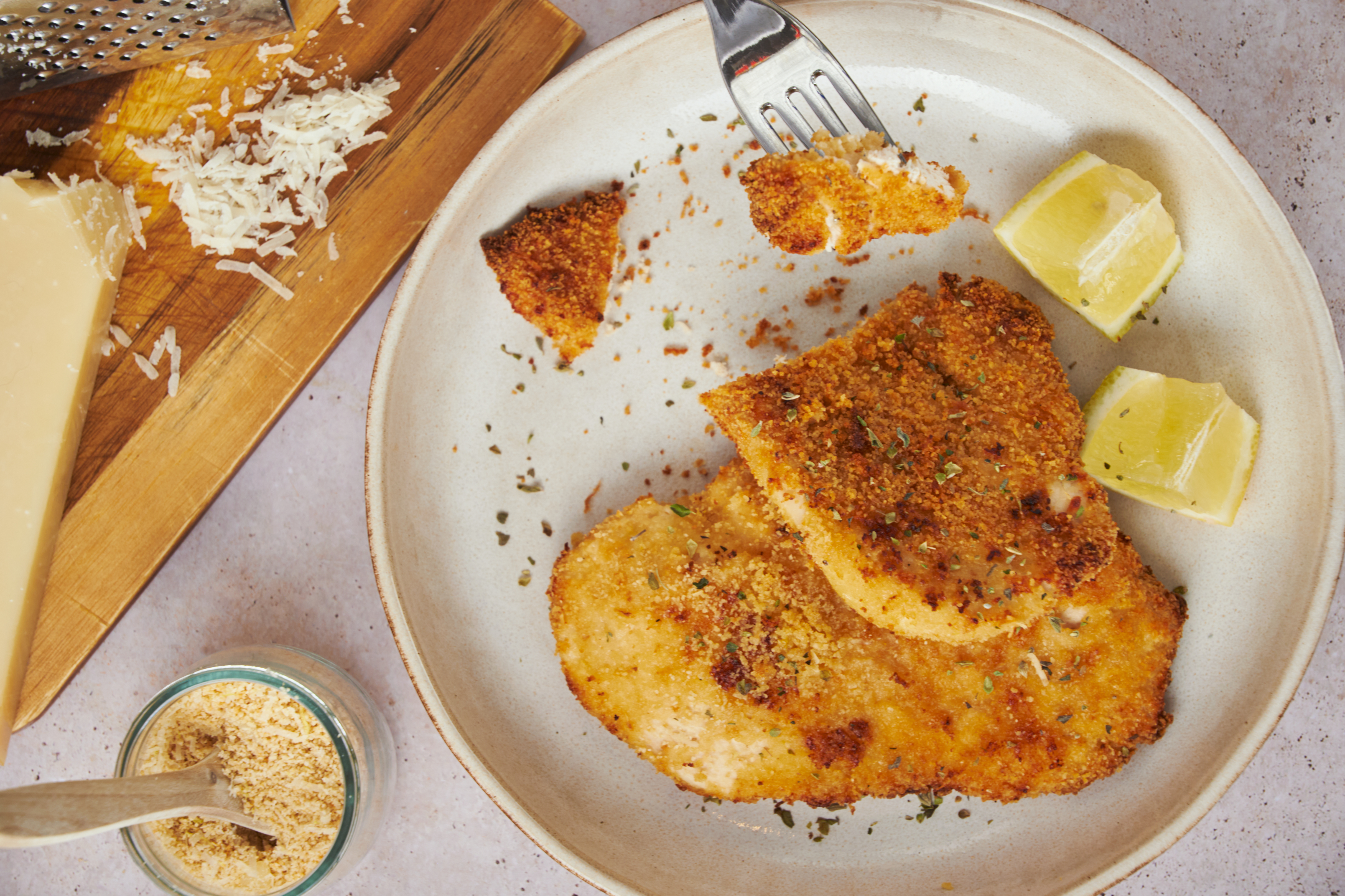 Cheesy Crusted Chicken! It doesn't need much explanation because it's as straightforward as its name! The chicken is crusted in a crunchy parmesan and breadcrumb coating with notes of zesty lemon and aromatic garlic, and then baked so the chicken remains juicy and savory. You don't even need a sauce with Cheesy Crusted Chicken; they're so flavorful, they'll blow your mind all on their own!
