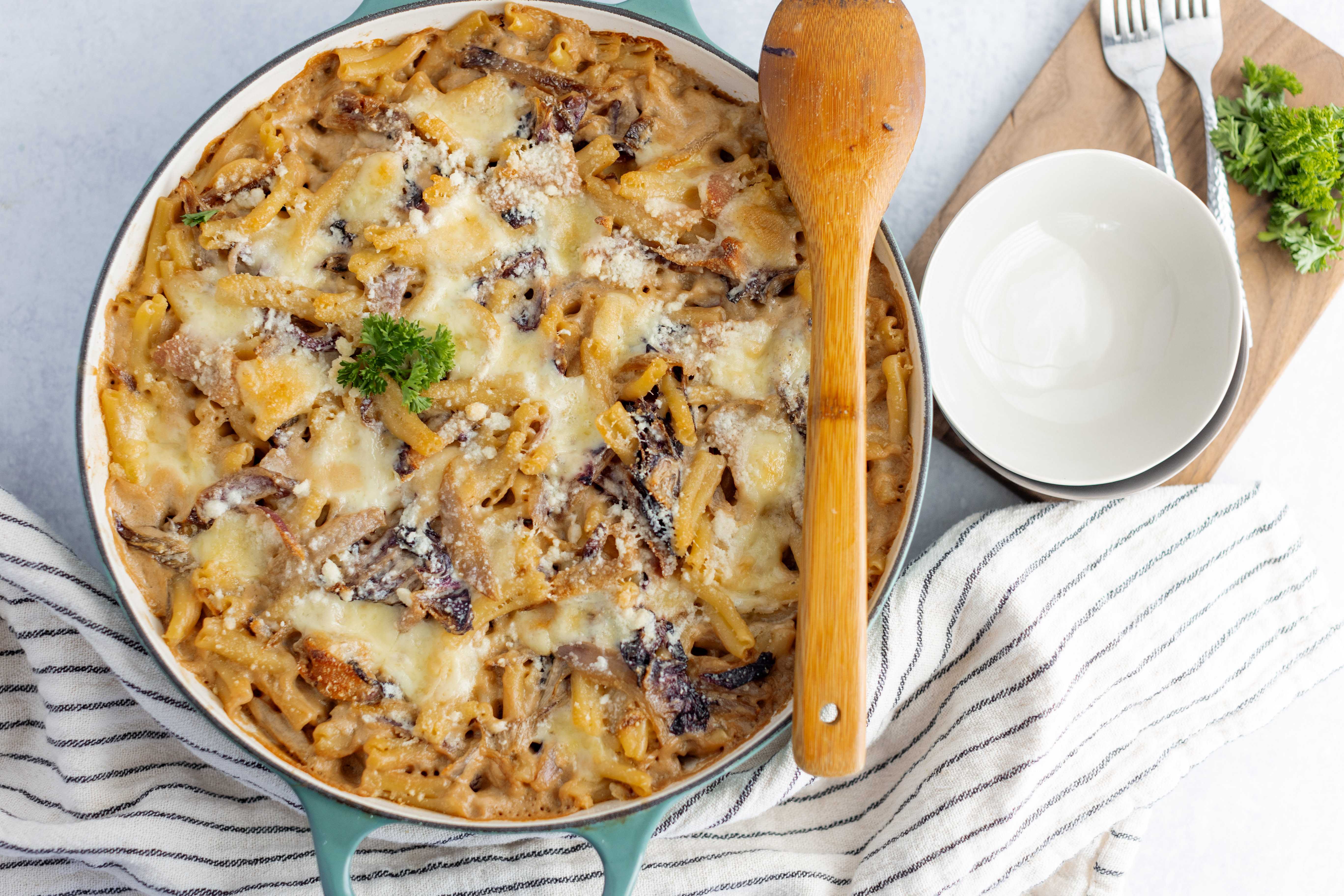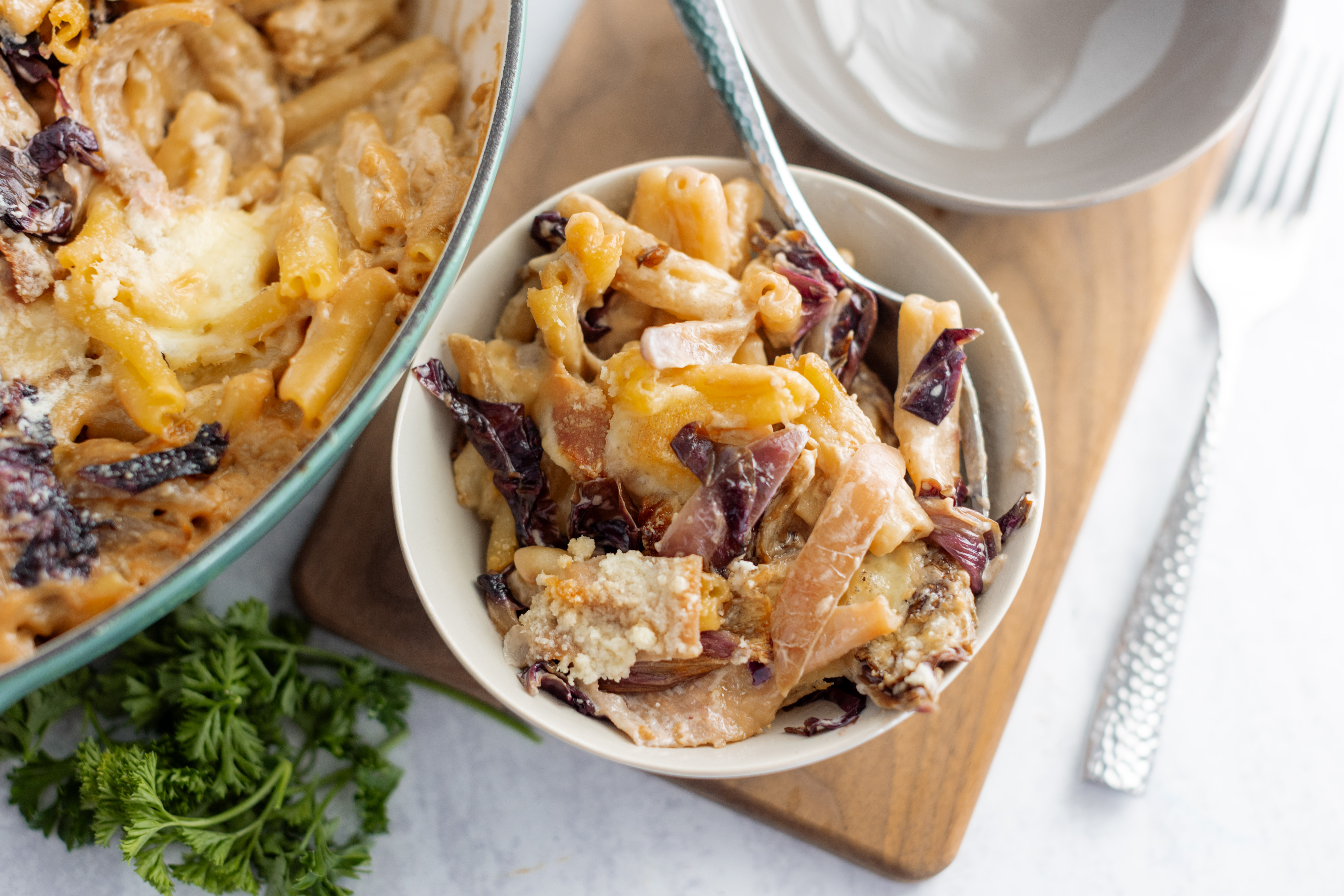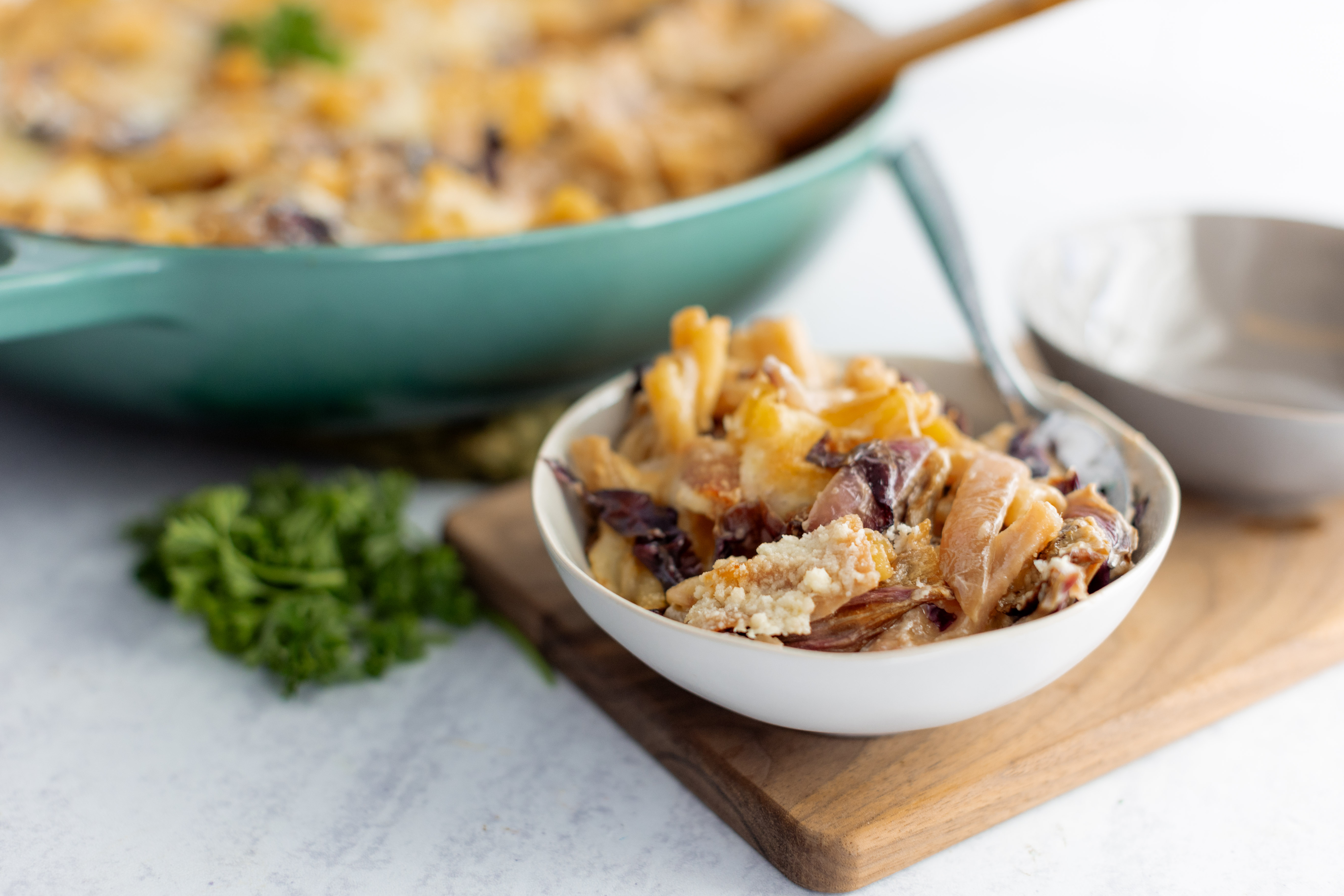 If you are curious what radicchio is, this Cheesy Radicchio Bake is an interesting and delicious way to explore something new! Mixed with some tender pasta, a lot of rich, creamy cheeses, and pieces of salty prosciutto, this vibrant, leafy veggie gets sweeter when cooked, making it the perfect touch to this powerful dish. Trying new things is always fun, and this Cheesy Radicchio Bake makes it a delicious experience for all!