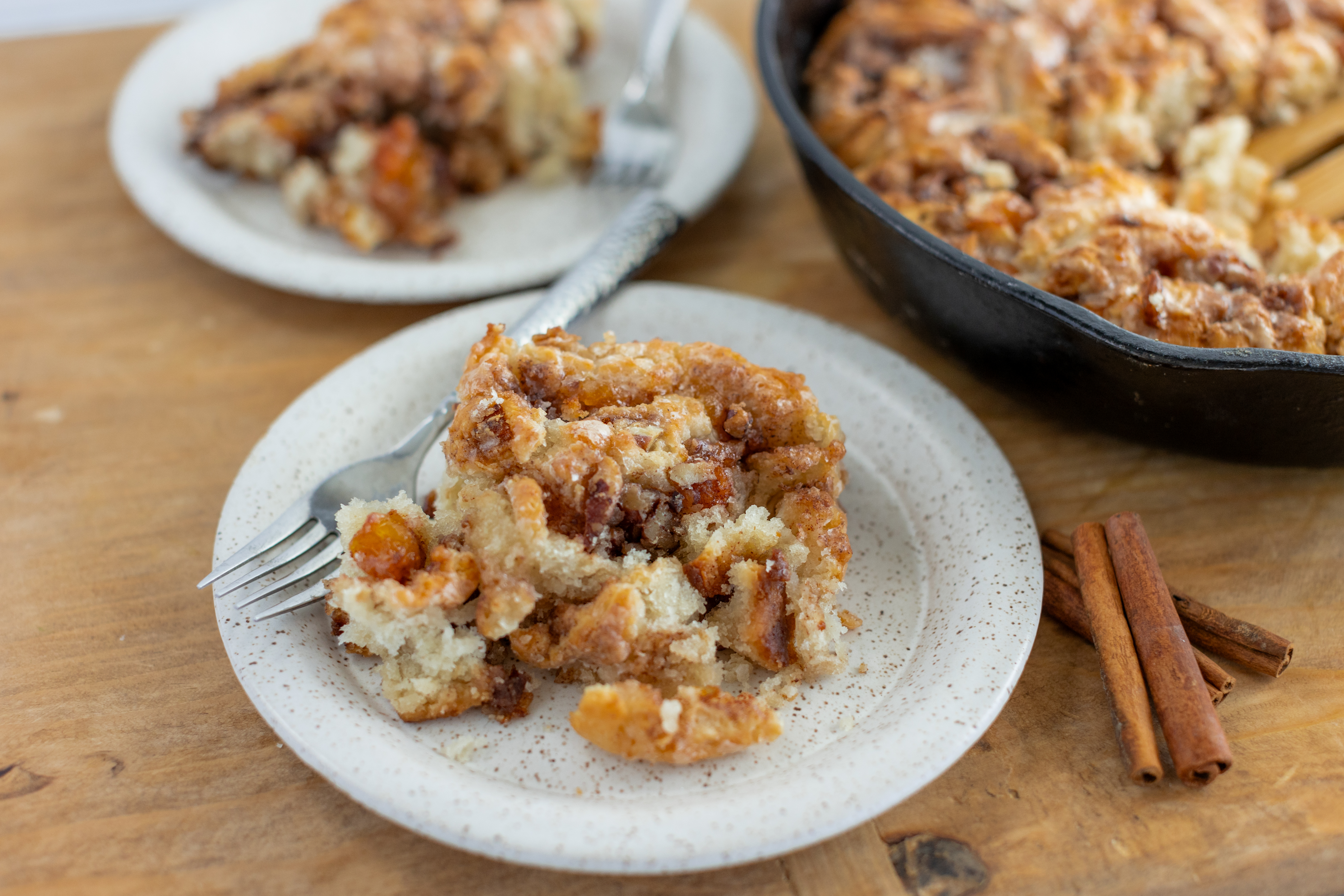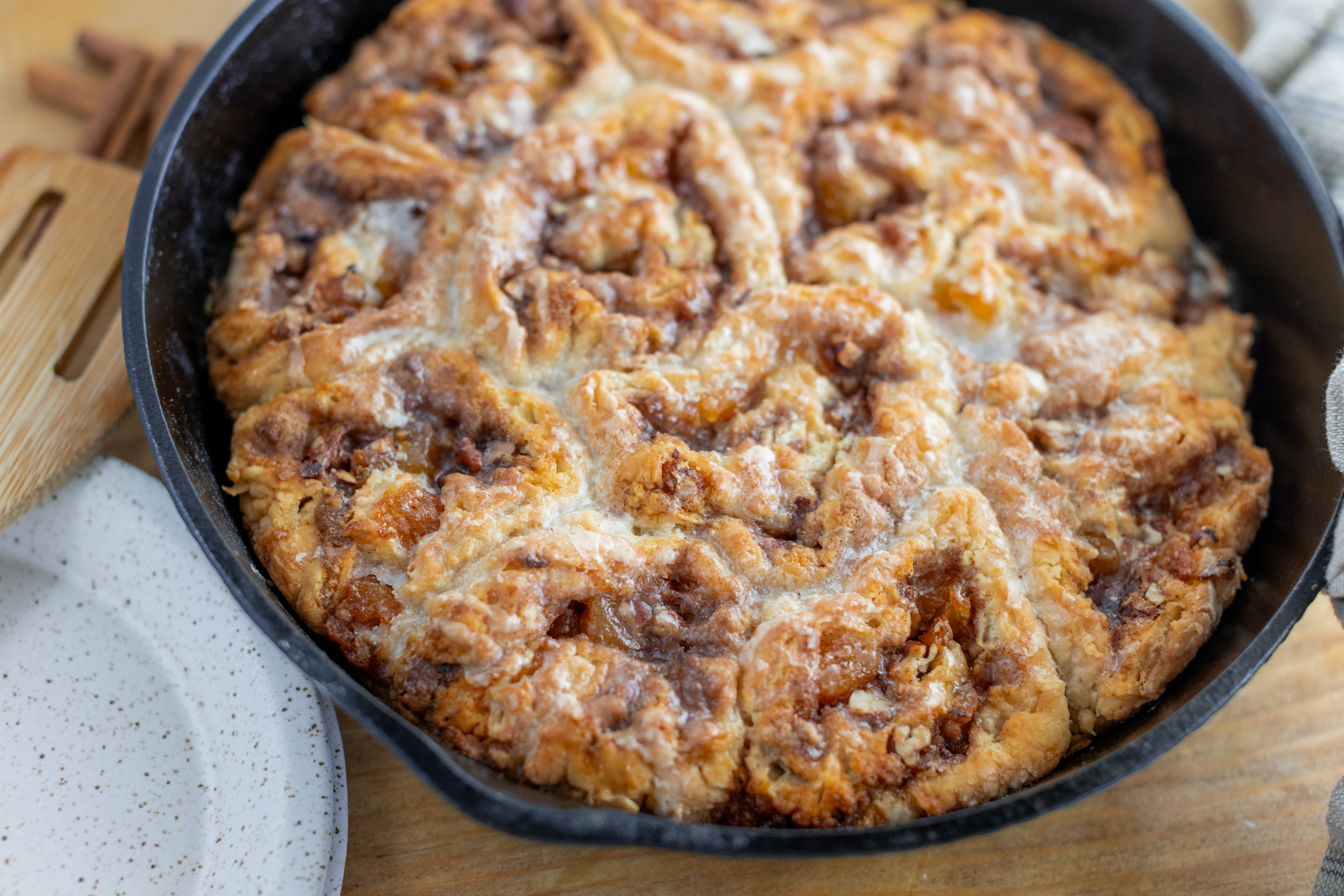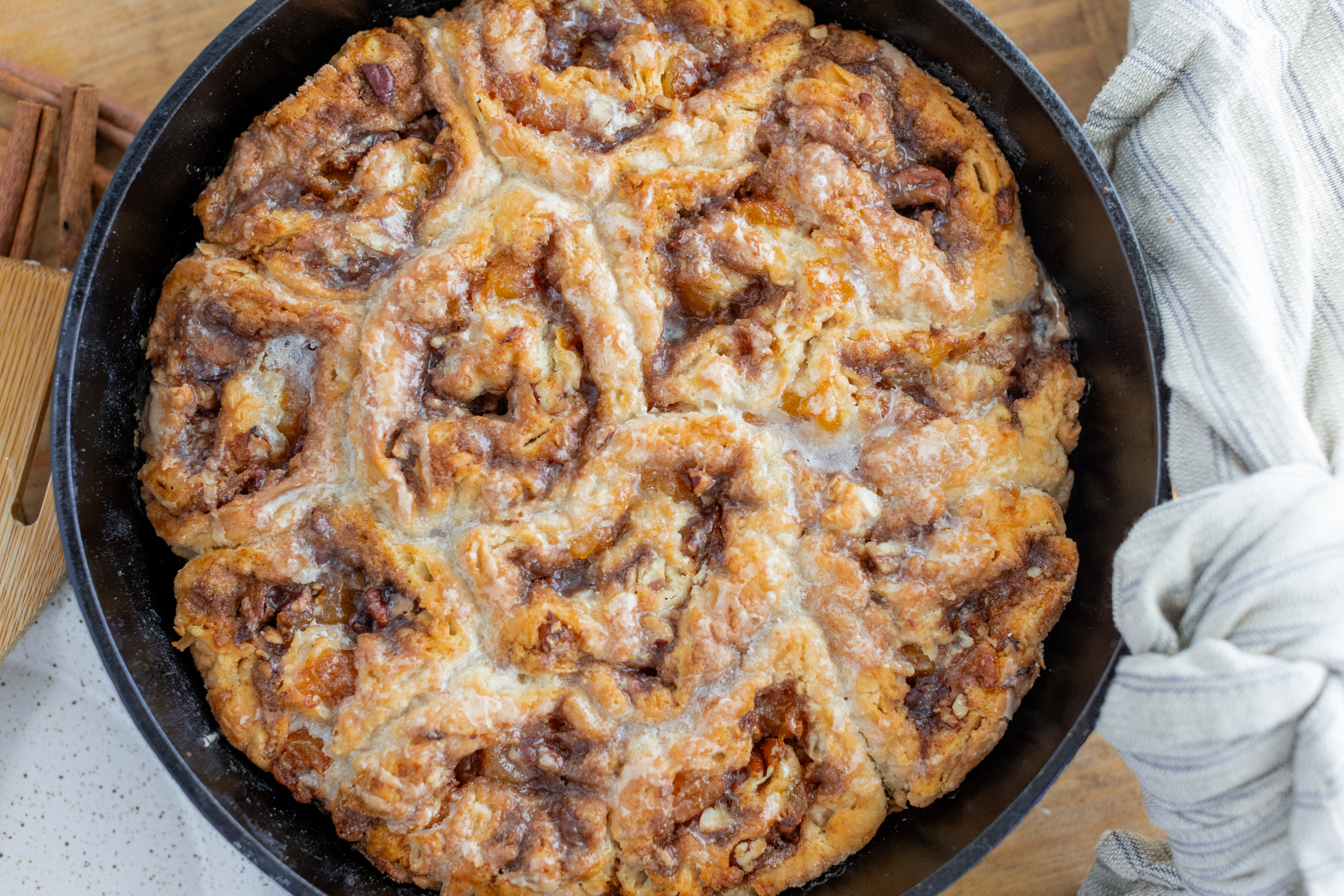 Step 17 -Arrange the dough slices in the prepared cast-iron skillet with one of the swirl-sides up, and bake until the rolls are golden and cooked through, about 35-40 minutes.
