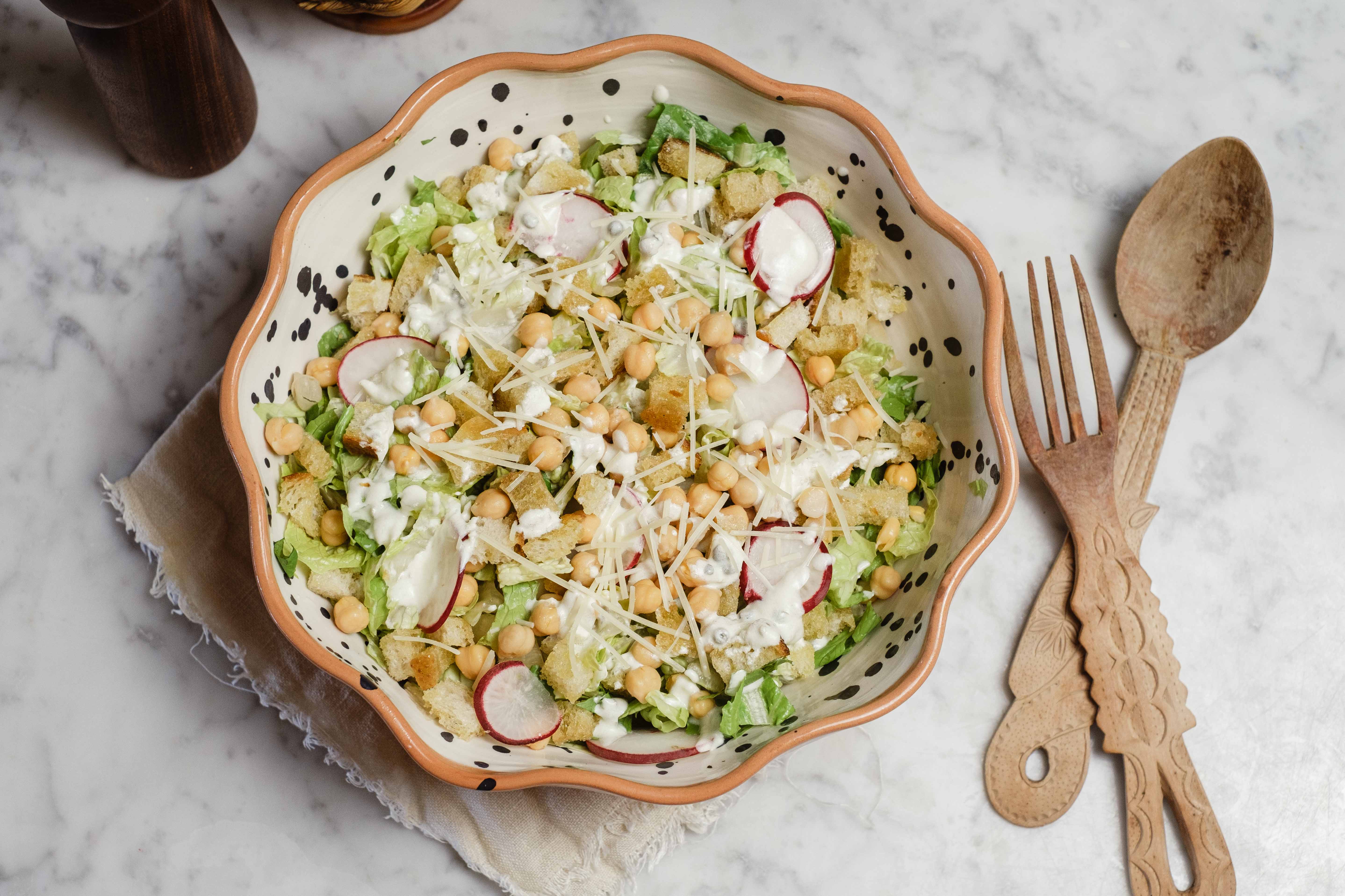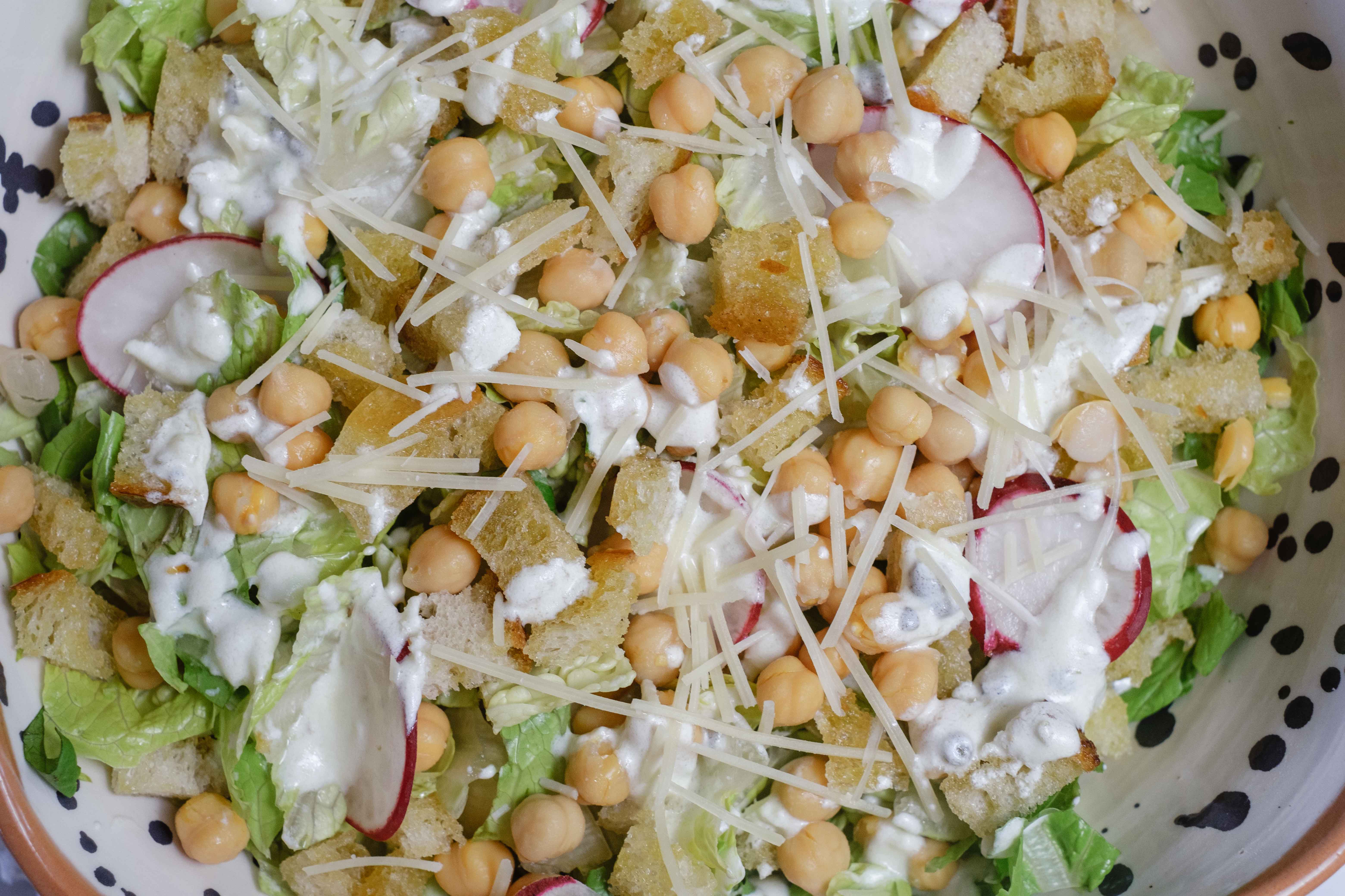 Nothing is better than a fresh salad on a bright sunny day, and you can't get any fresher than Classic Caesar Salad! Layered with crisp romaine lettuce, spry and spicy radishes, roasted chickpeas, a dusting of sharp pecorino cheese, and a sprinkling of toasted pine nuts, everything comes together beautifully thanks to the iconically creamy homemade Caesar dressing. "Refreshing" doesn't begin to do this Classic Caesar Salad justice!