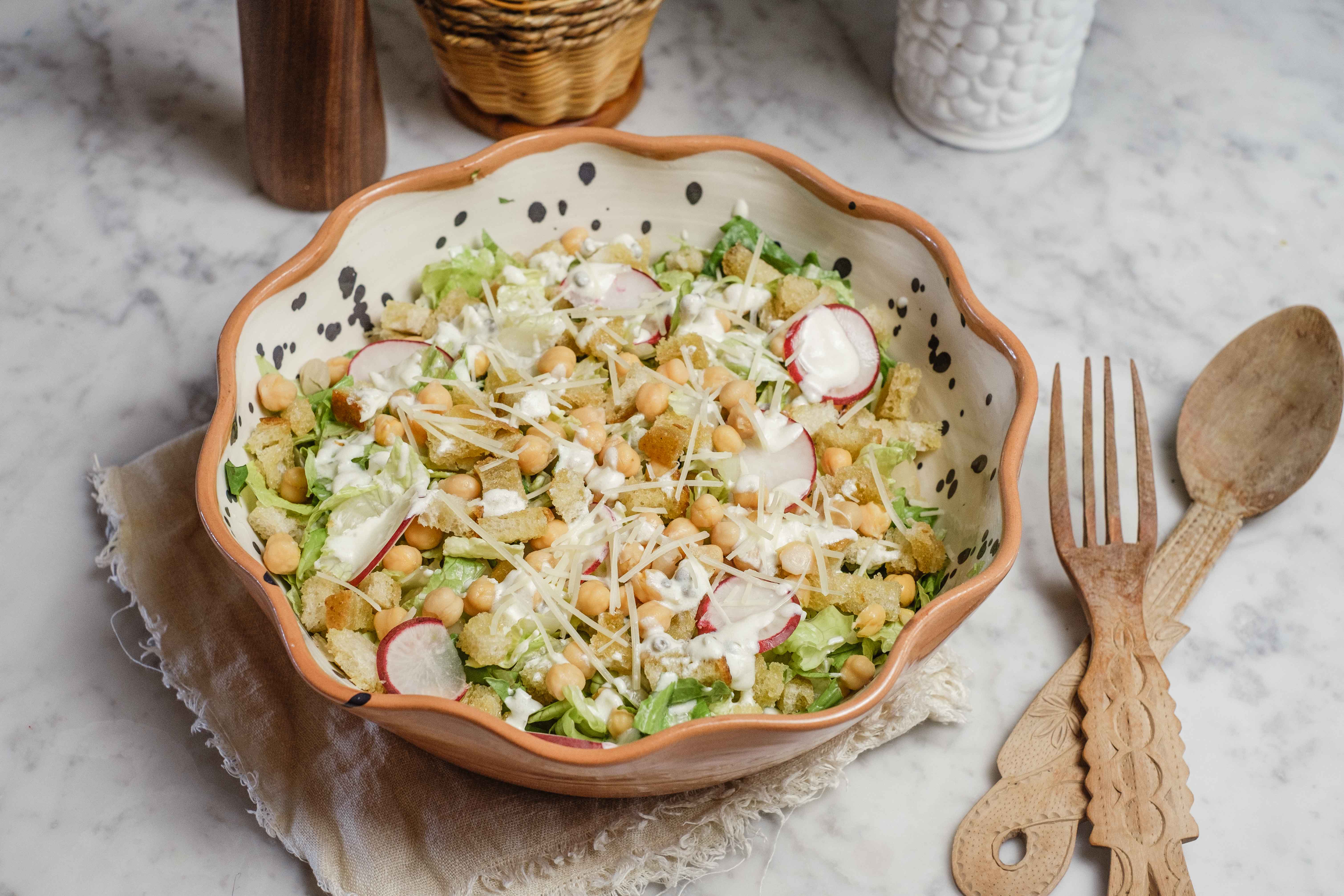 Step 9 -Evenly sprinkle the radishes, the homemade croutons, and the roasted chickpeas over the salad mixture.