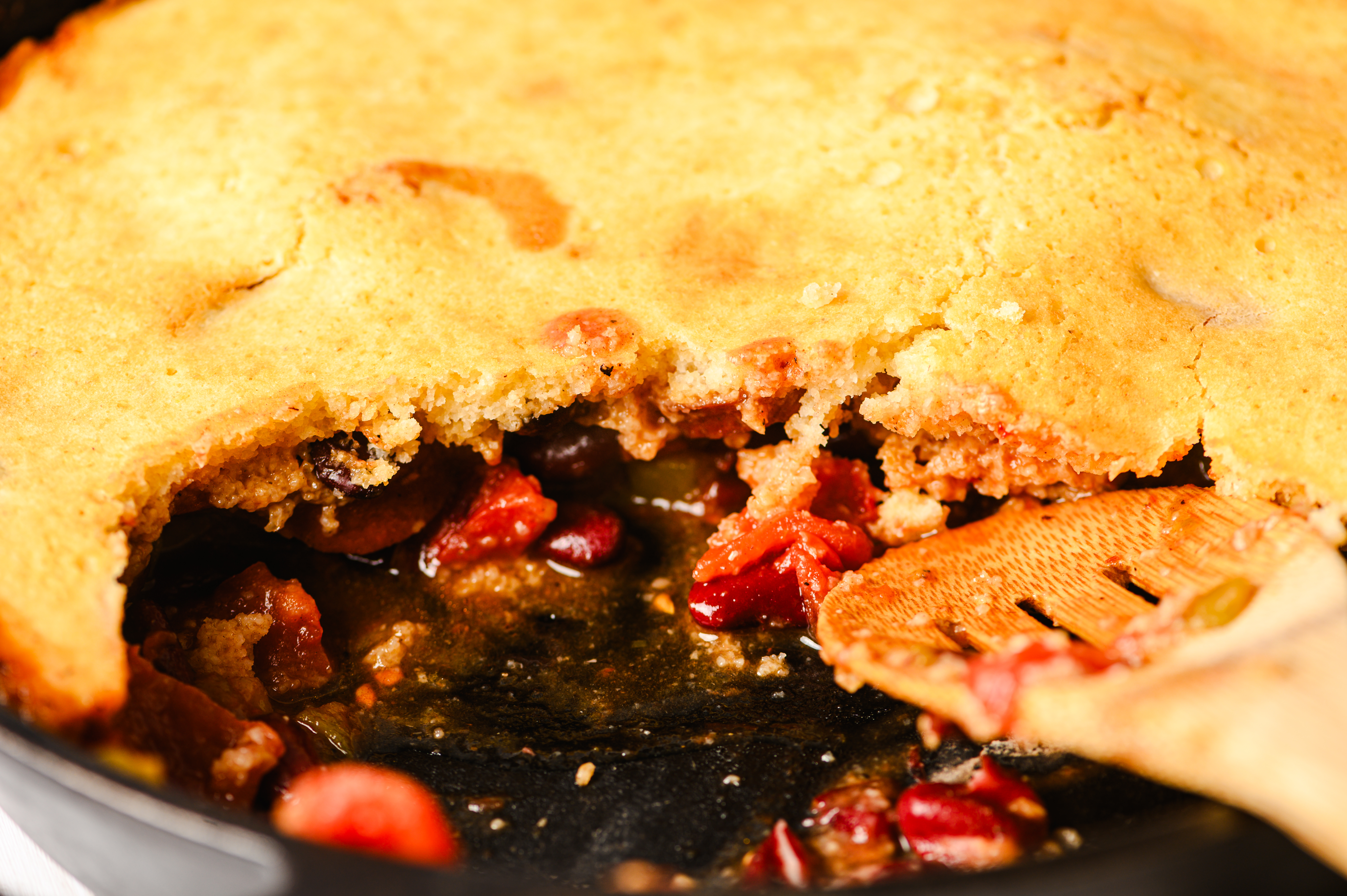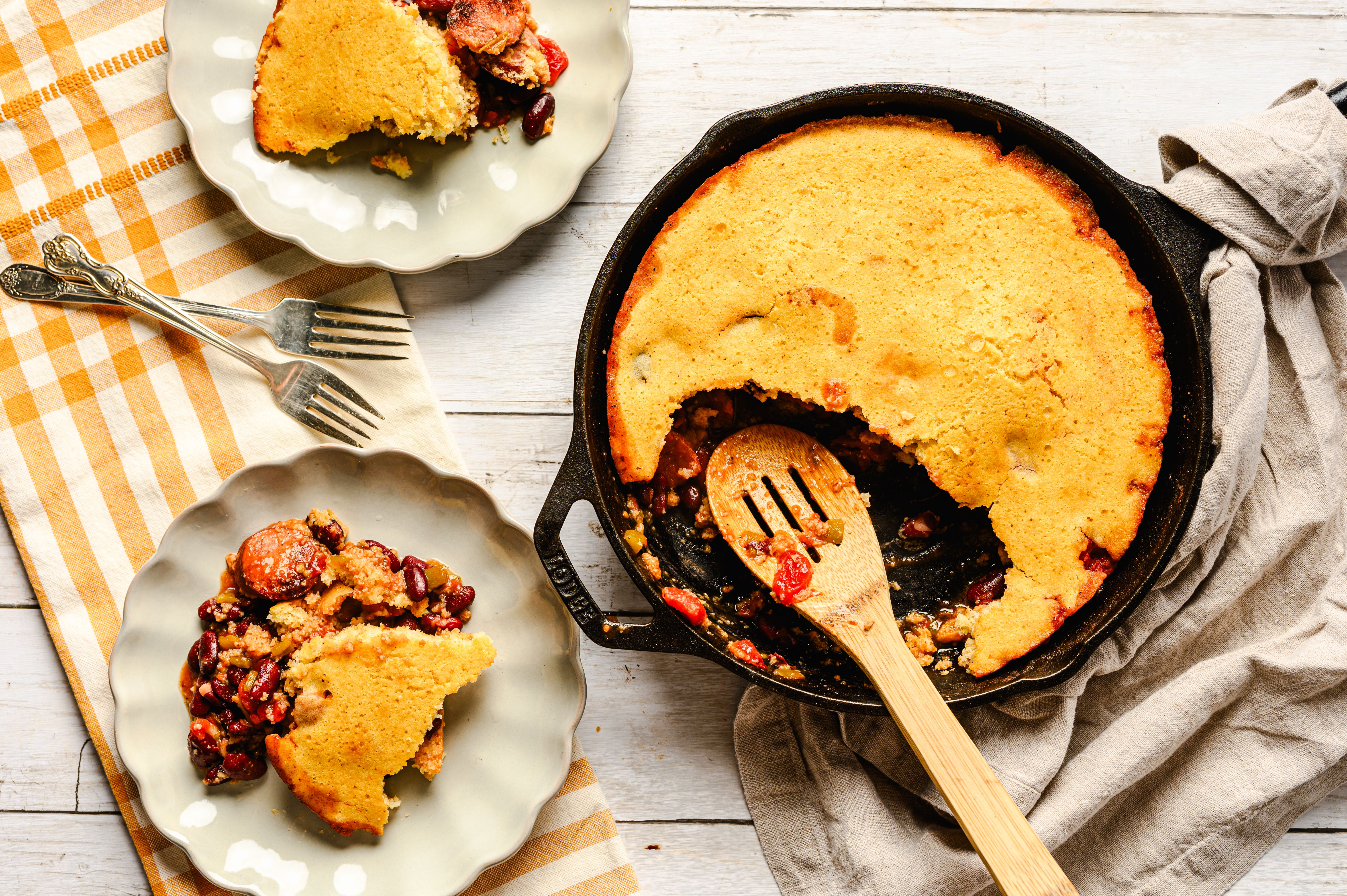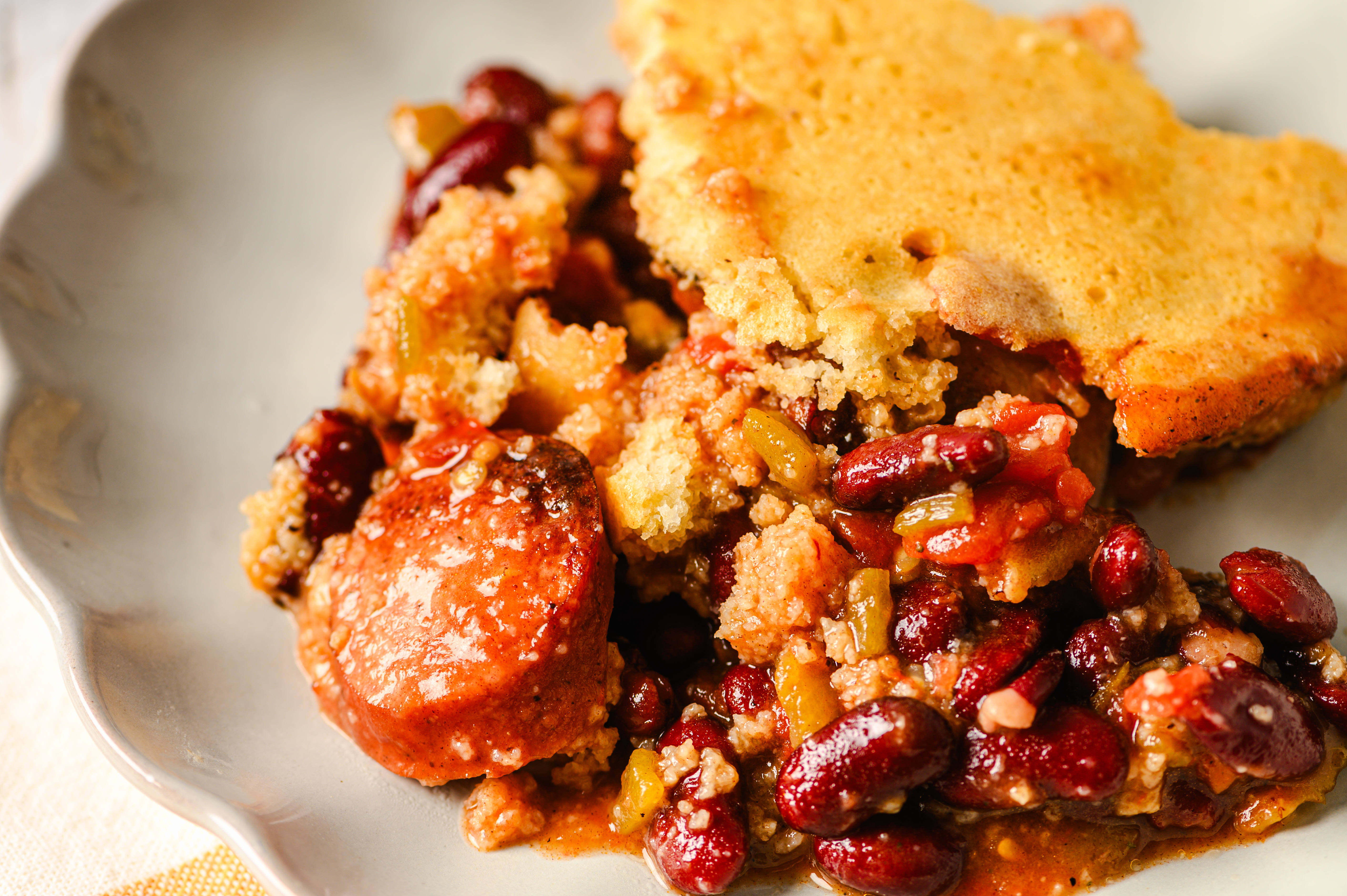 Can we get a "yee-haw" for this Cowboy Supper? It'd be hard not to shout with joy for this campfire of amazing Tex-Mex flavors, with classic red beans and tomatoes mingling and trailblazing with spicy chiles and savory sausage. The topping is the cowboy flavor focal point: sweet, sunny, tender cornbread! Cowboy Supper has it all, except the hat... which might be a good thing, since you might just be tempted to throw your hat in the air in pure delight after the first bite!