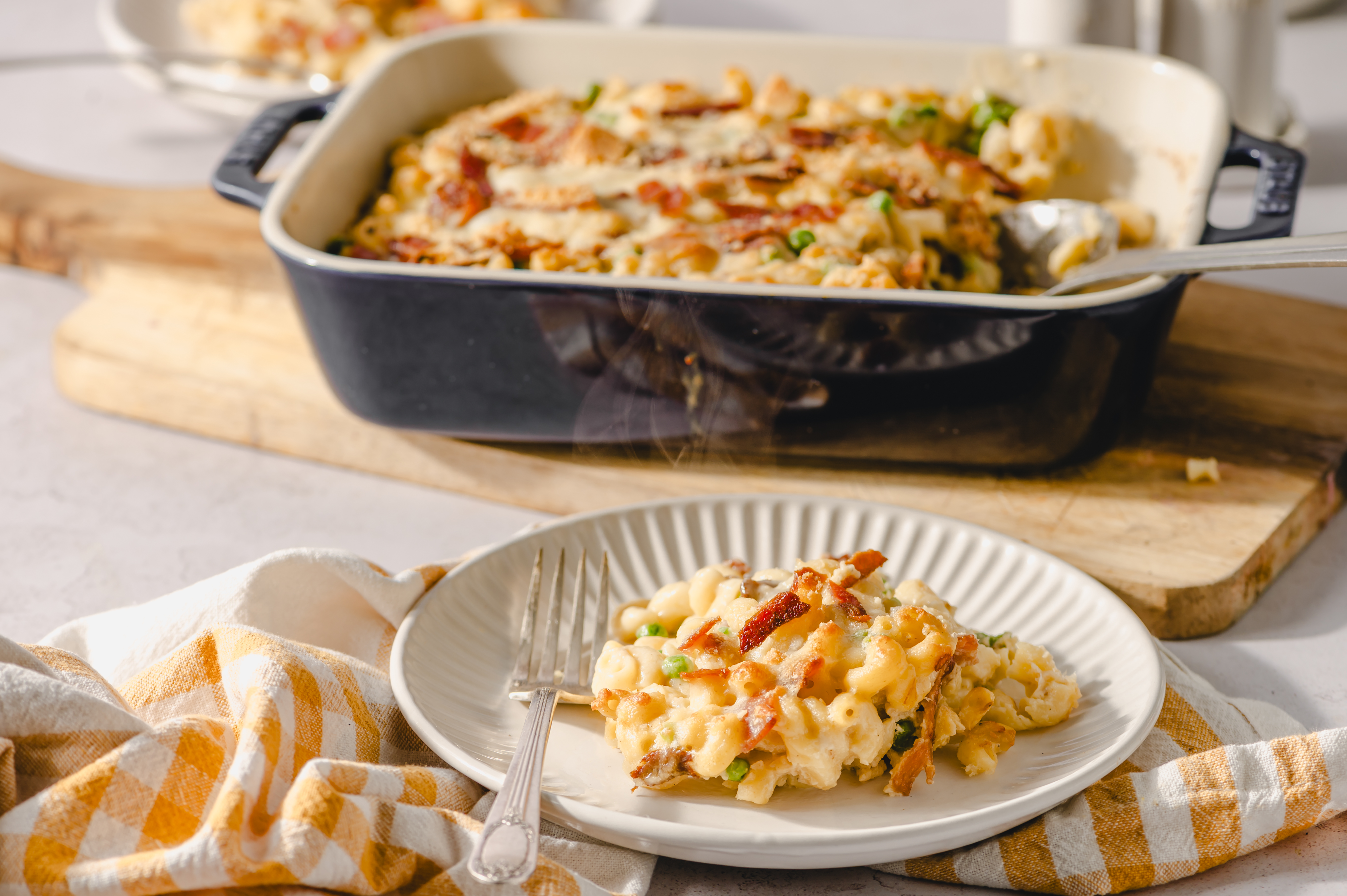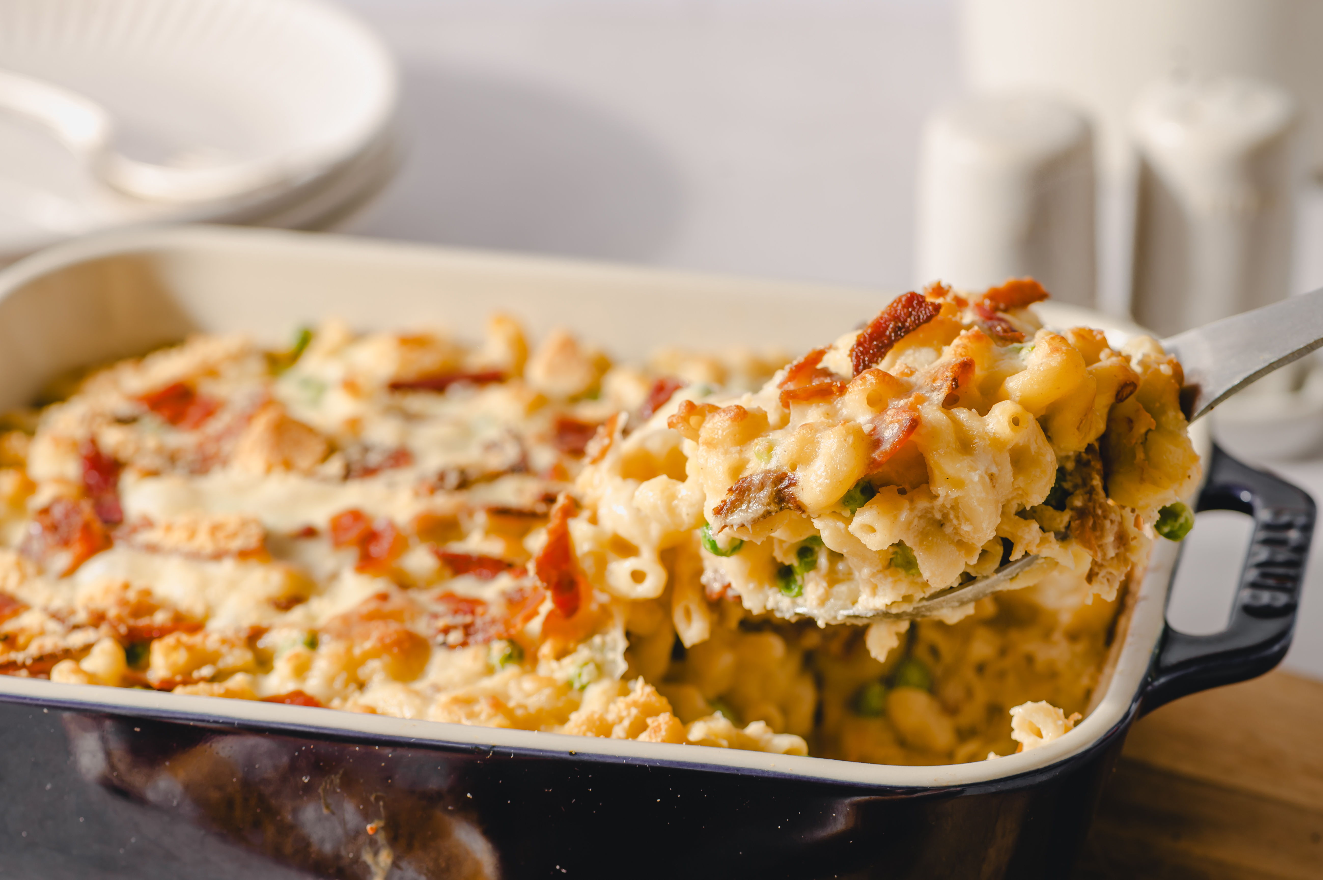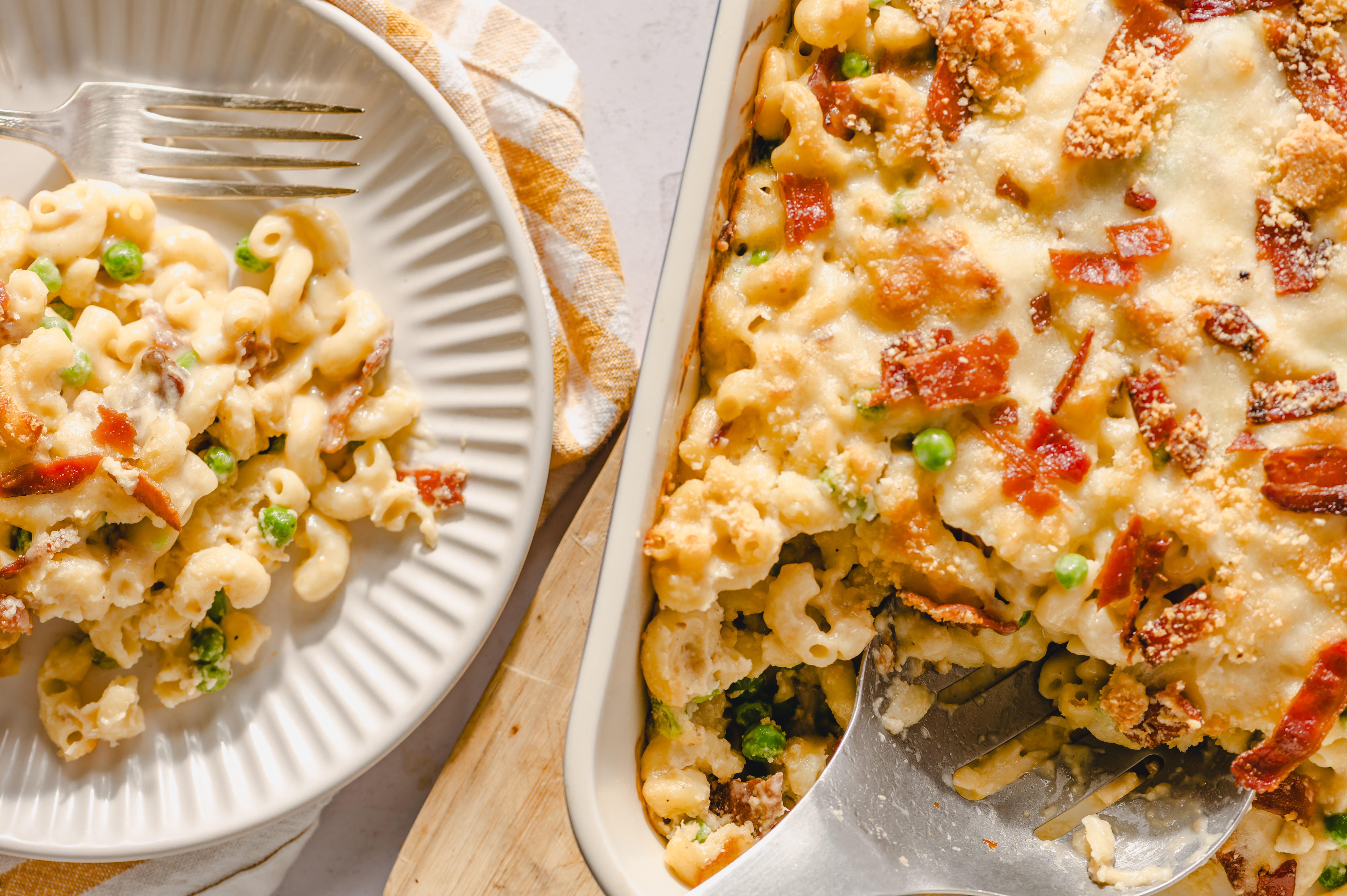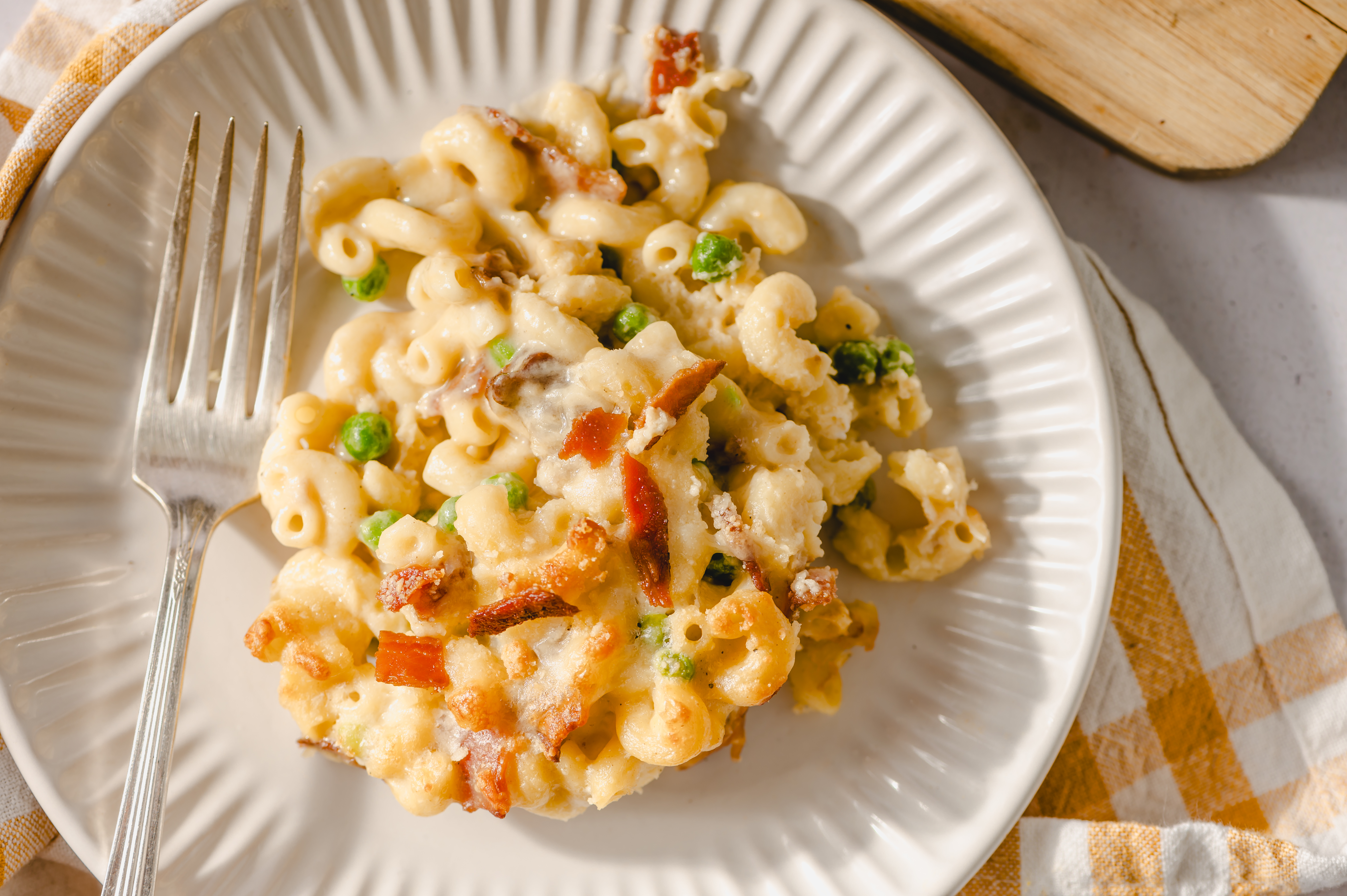 If you're looking for a more upscale way to serve your favorite, traditional, nostalgic macaroni and cheese, then this Creamy Carbona Mac is the way to go. The blend of melted, rich cheeses covering tender noodles really make for an exciting side dish. Add the addition of perfect peas and beloved bacon give it that grown-up flare. You're sure to fancy this Creamy Carbonara Mac! It might just be the new way you make your fave!