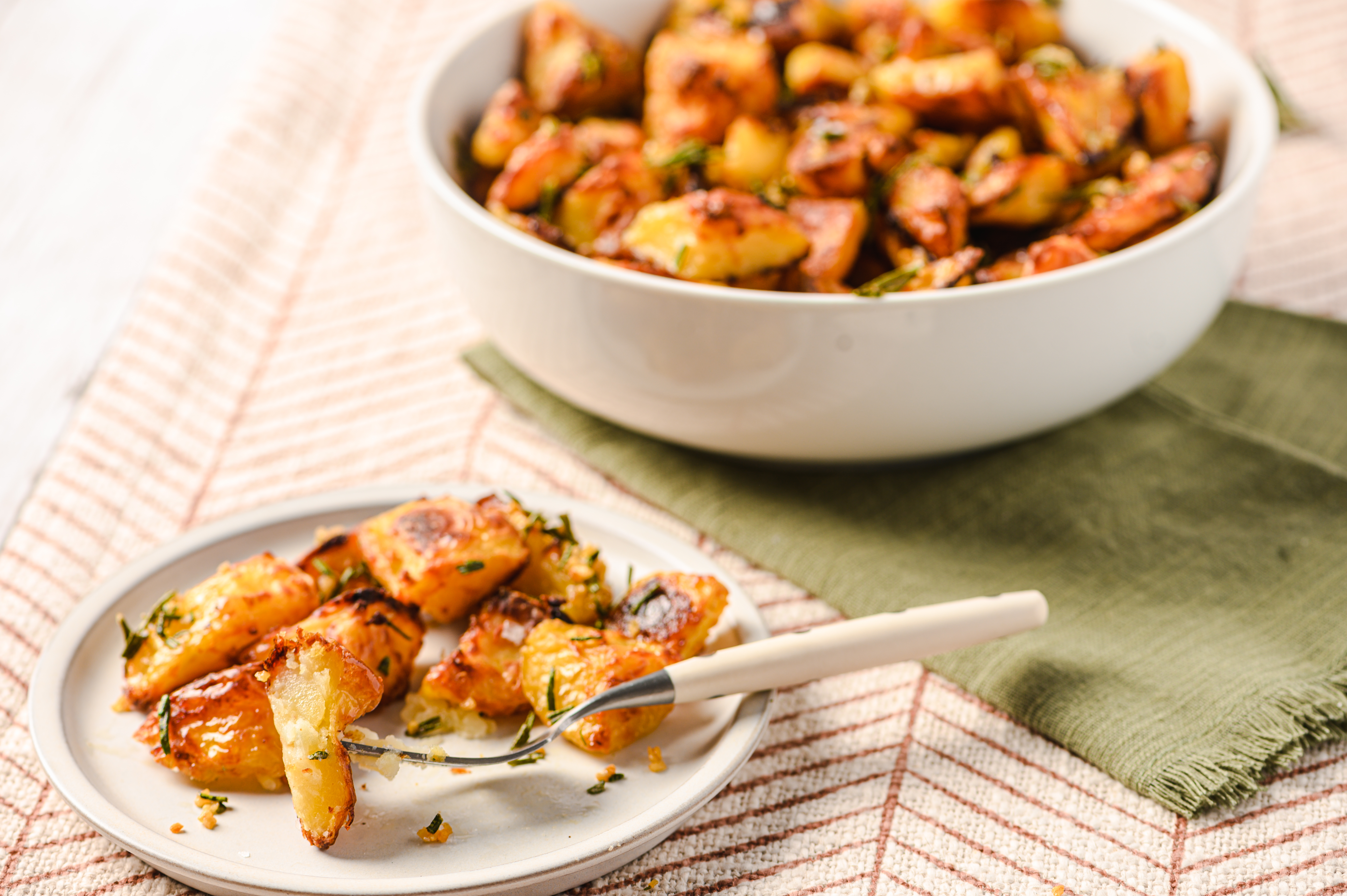 You can never have too many ways to serve the world's most versatile starchy veggie. These Crispy & Roasty Potatoes just add to your list of delicious methods to choose from! As their name suggests, they are in fact crispy. And also, roasted, which is where the roasty comes from. But there's more! They're coated in a savory garlic oil, which makes them really tasty alongside whatever main you're serving up. Don't settle for just a dinner when you have so many options; be sure to choose the always-satisfying and always-available Crispy & Roasty Potatoes when you're on the hunt for the best way to spice up your spuds!