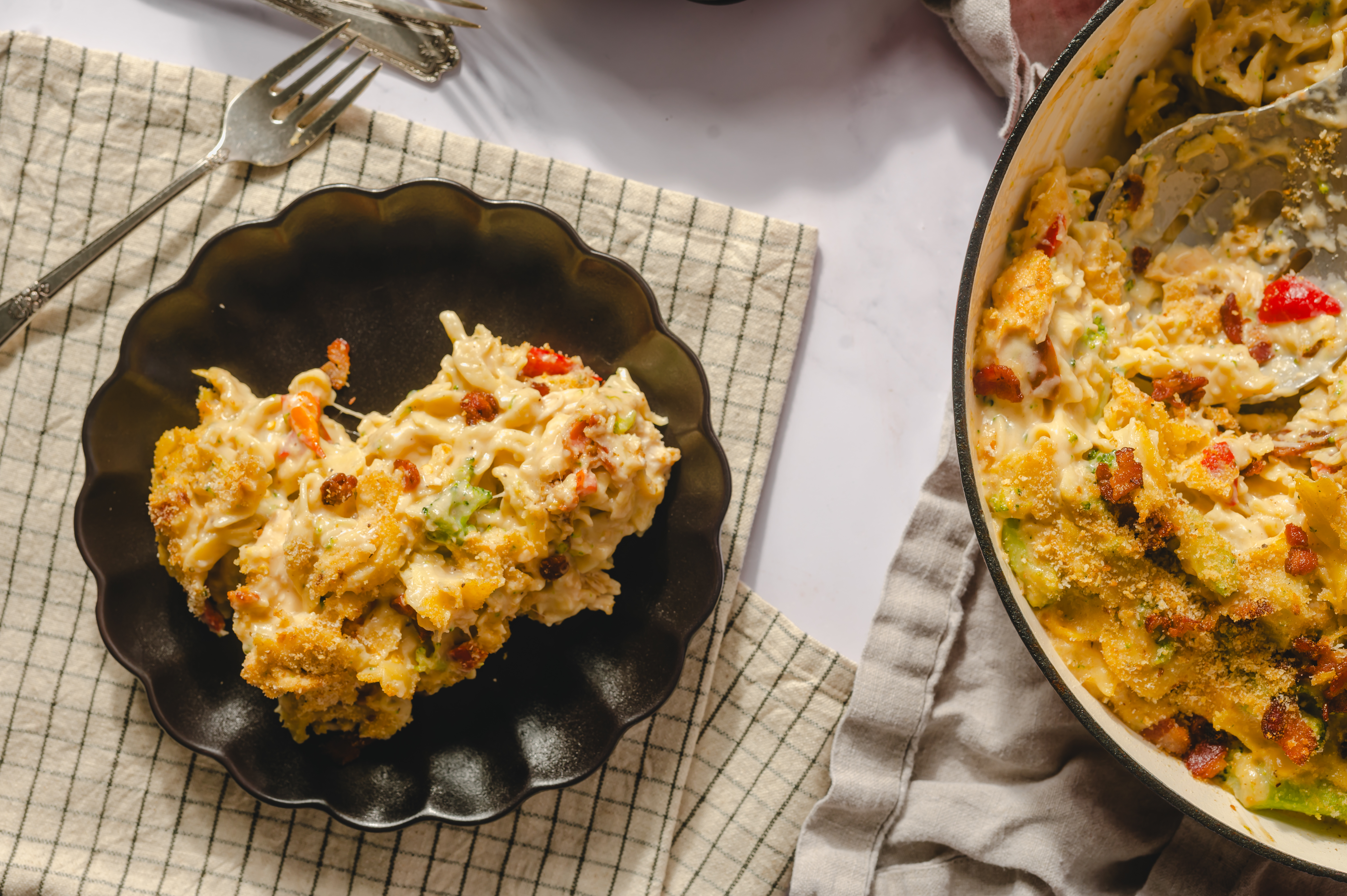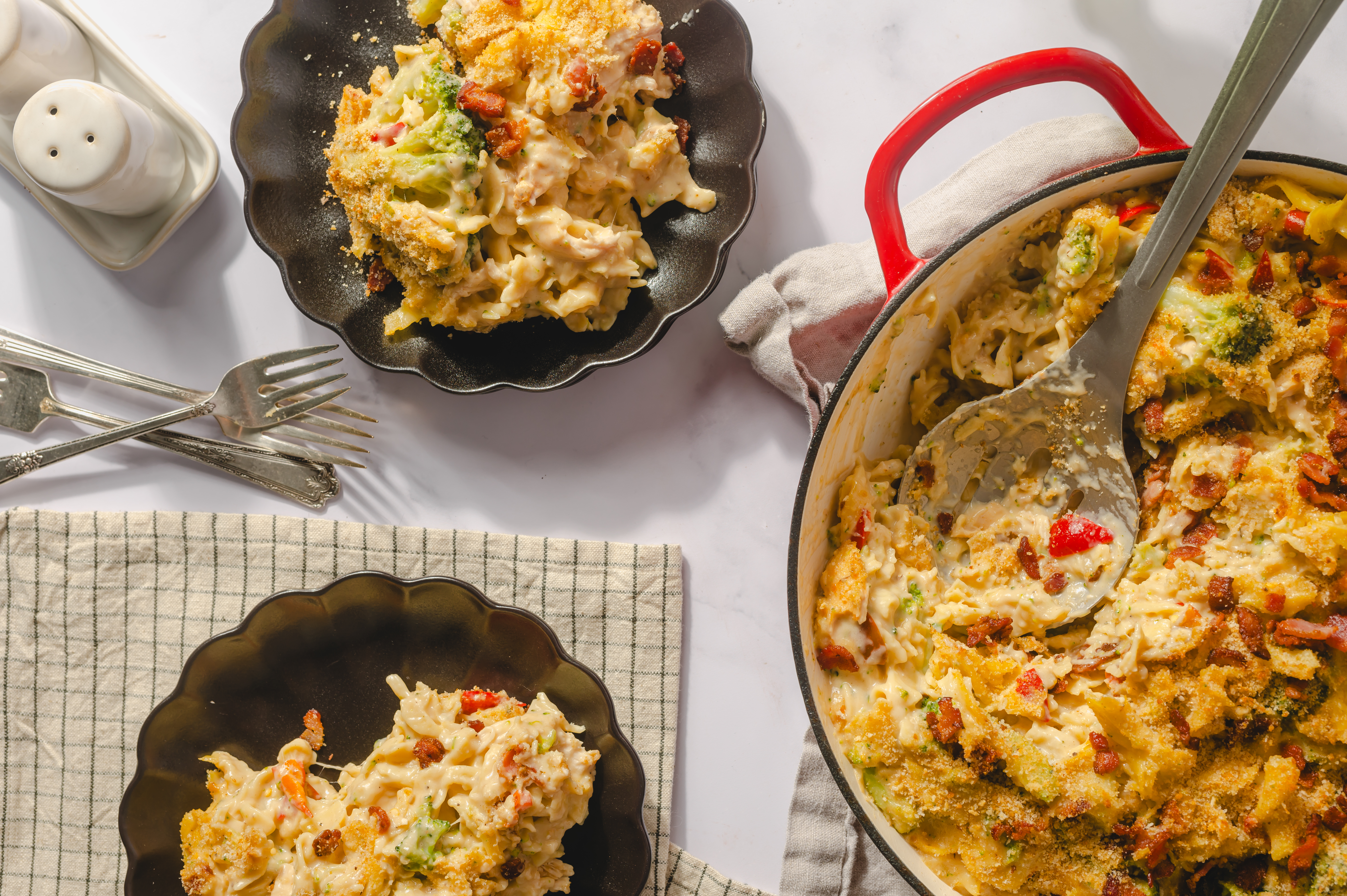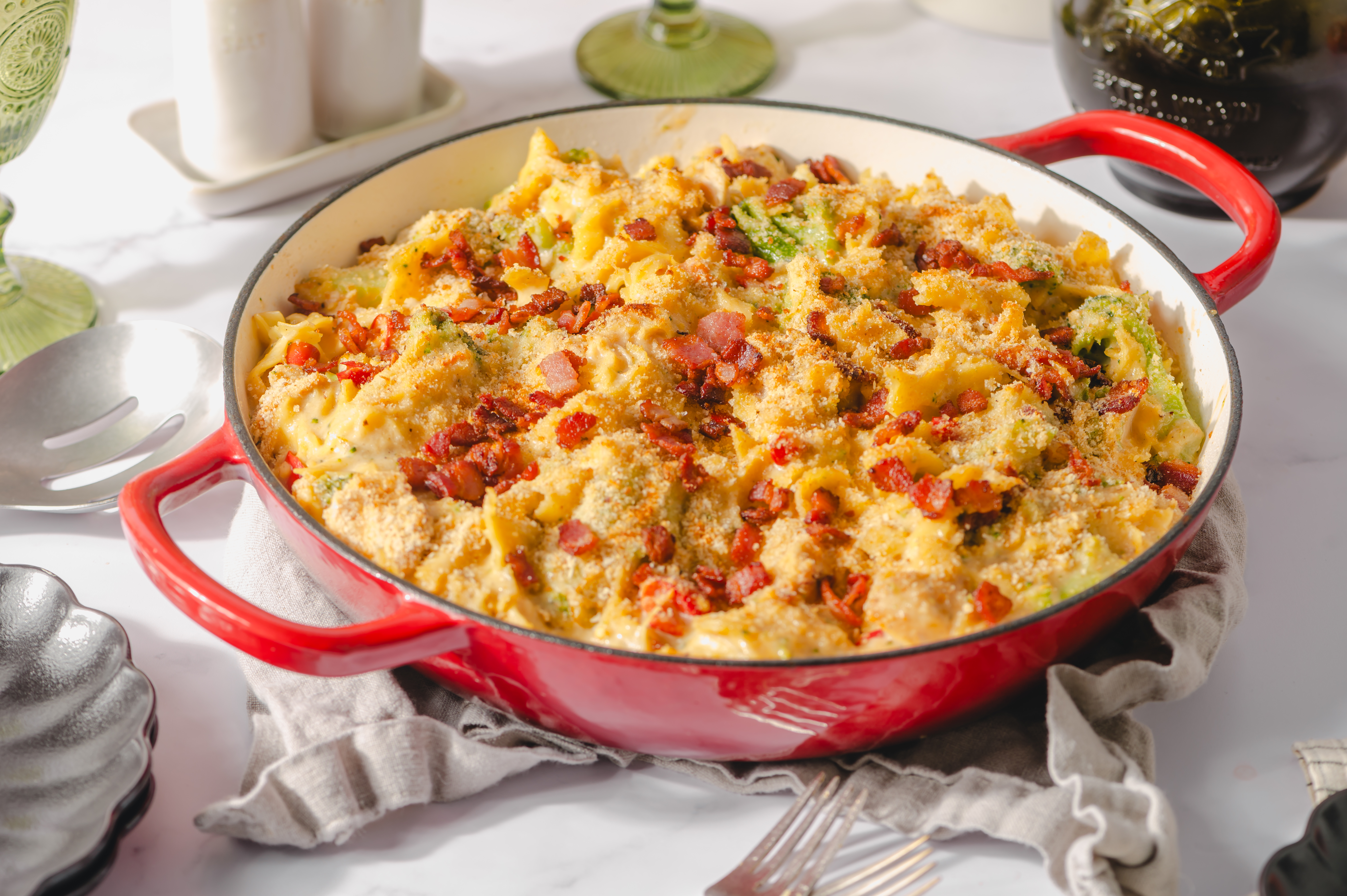 A heavenly and hearty meal that should arrive on your table like a sunbeam! The sauce of the Divine Dinner Skillet is enough for it to earn its wings; creamy, fragrant, and wonderfully savory! The succulent shredded chicken, bright peppers, and crisp bacon bits all add to the harp melody of flavor. And it's all served on buttery egg noodles? Well, that settles it; Divine Dinner Skillet is an angelic meal that's ready in just half an hour! Hallelujah!