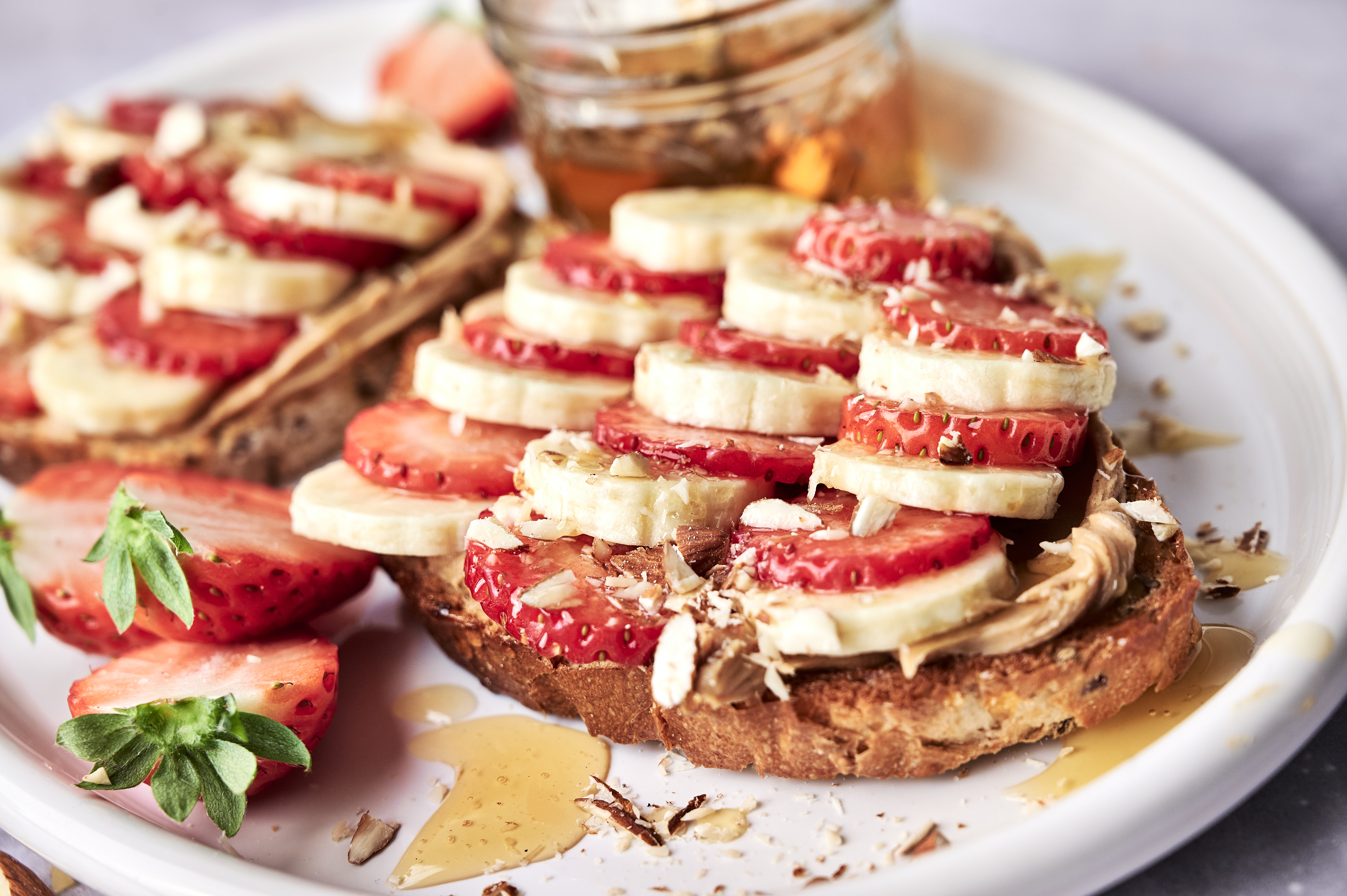 Step 3 -Evenly add the banana slices and the strawberry slices, alternating the two, on top of each of the peanut butter-honey layers.