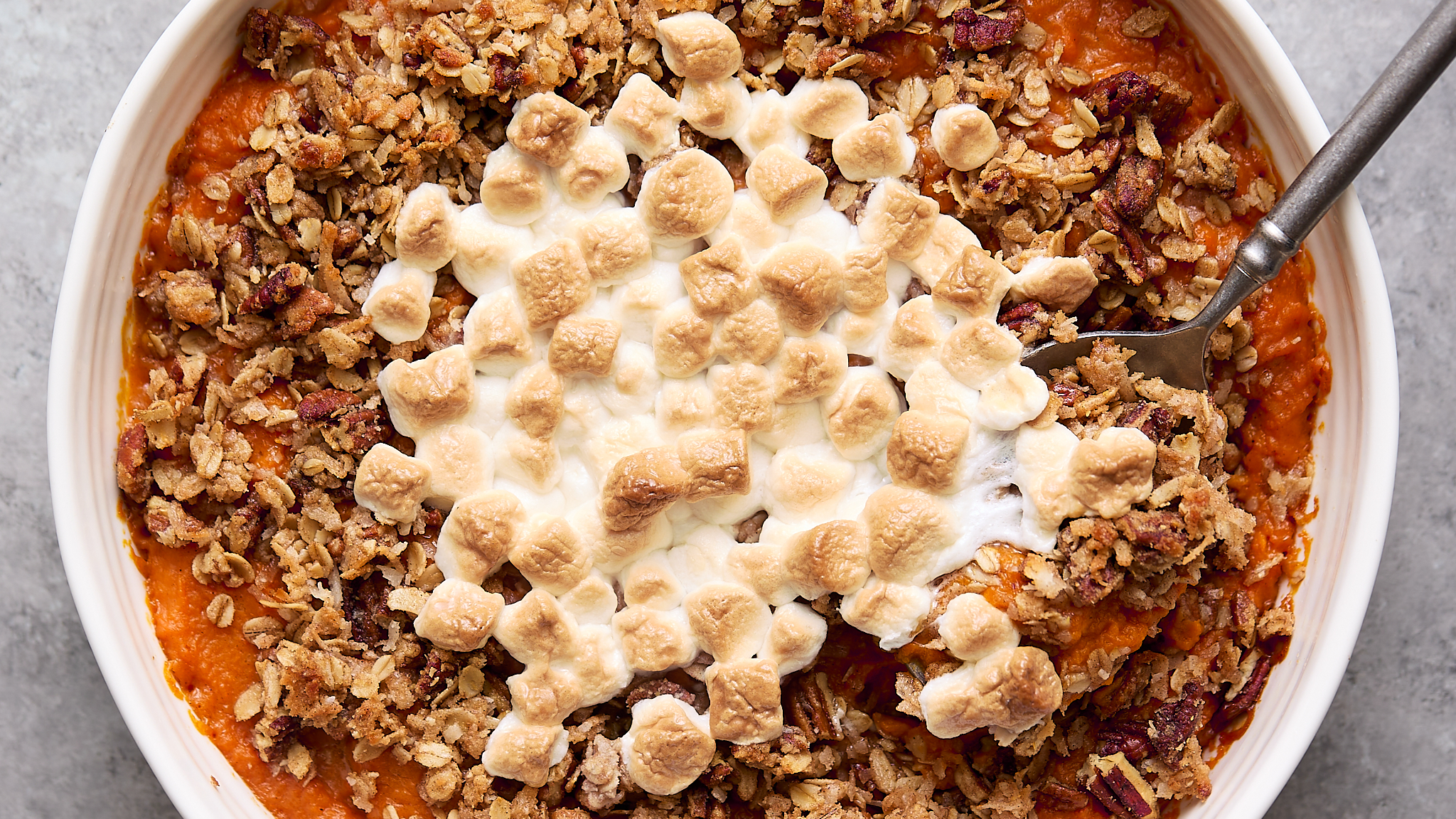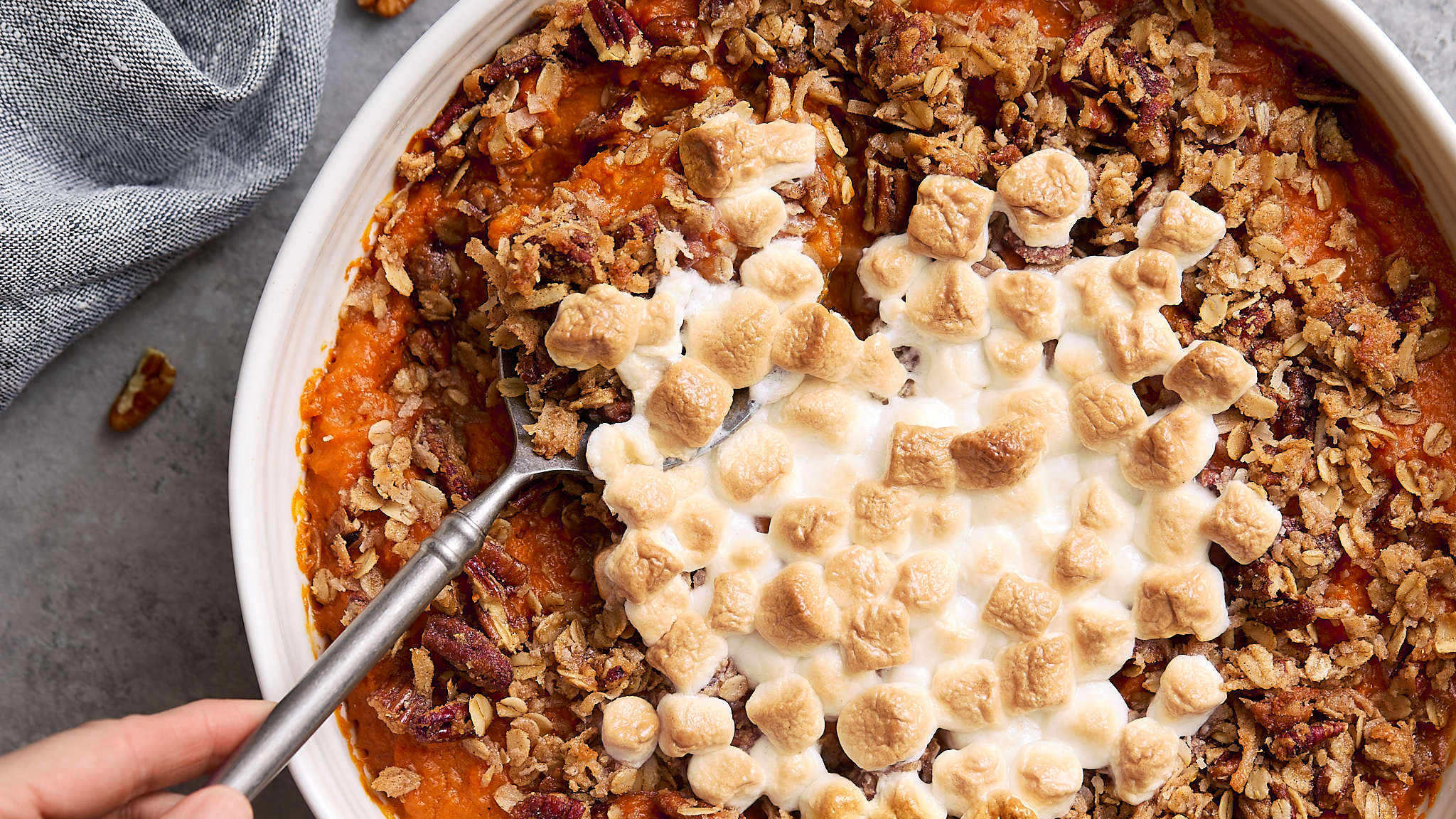 Easy Sweet Potato Casserole is a must-have for your holiday feast when you need something delicious that can be made without stress. Made with sweet potatoes that are elevated with brown sugar, maple syrup, and warm spices, everything is topped with an incredible, crunchy pecan crumble. Better yet, for those who can't resist, gooey marshmallows are melted on top. With that addition, how does this not count as a dessert? Whether you go for the marshmallow topping or not, the Easy Sweet Potato Casserole is a hot, crowd-pleasing dish!