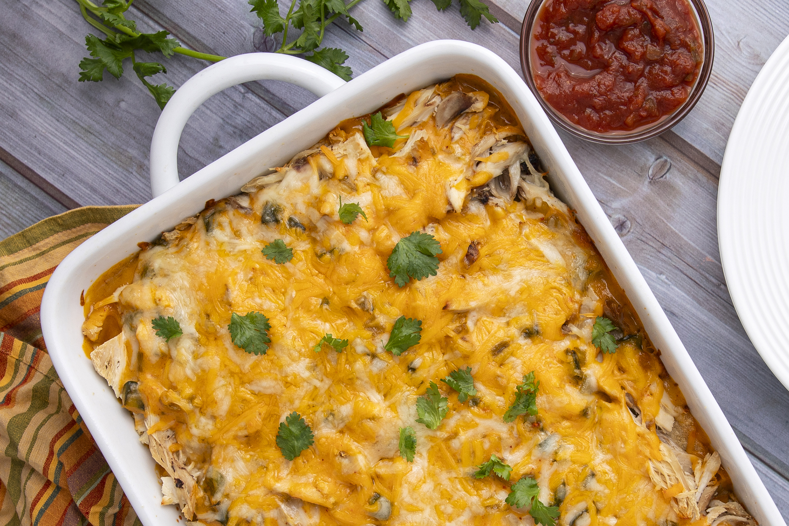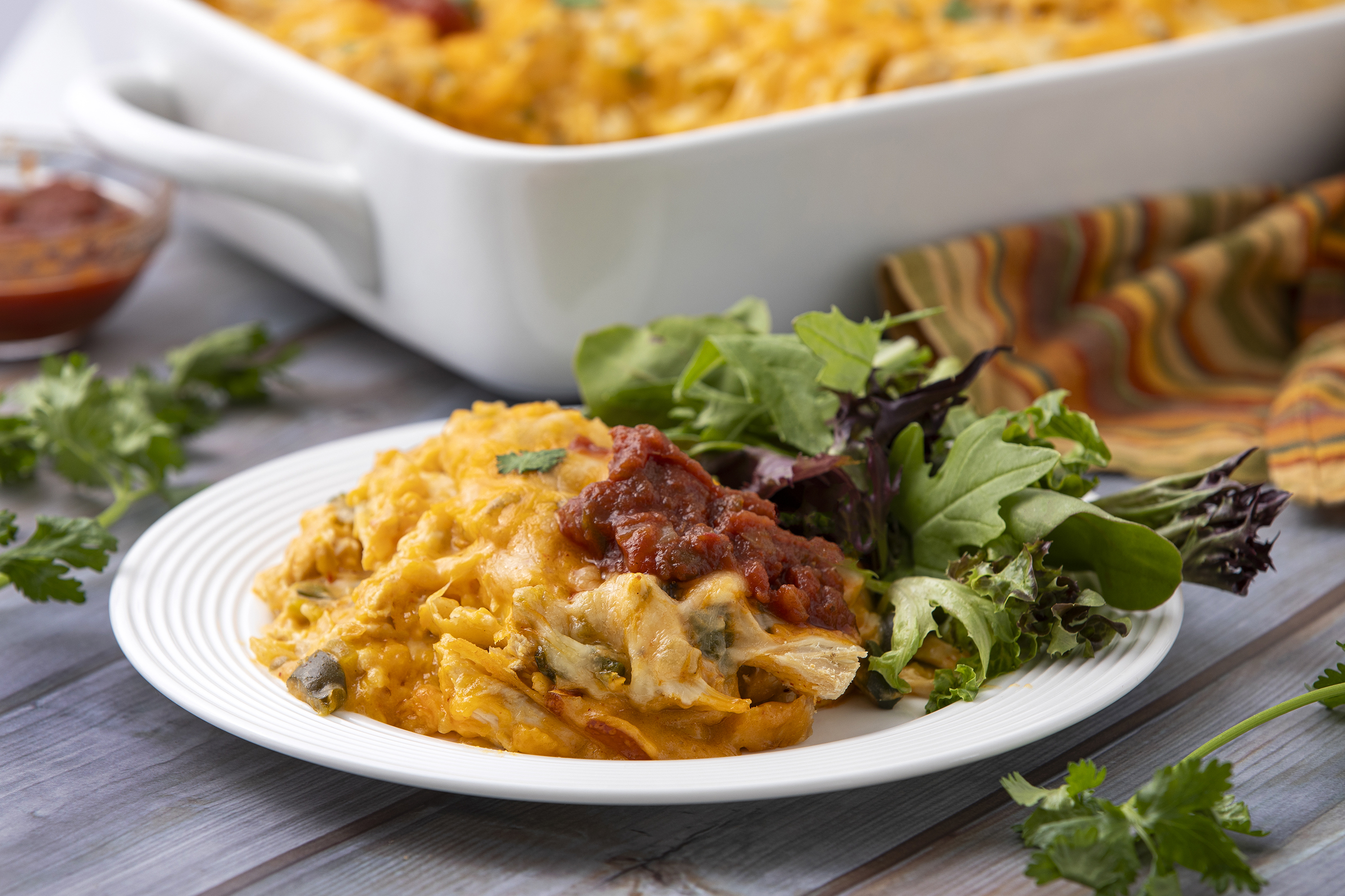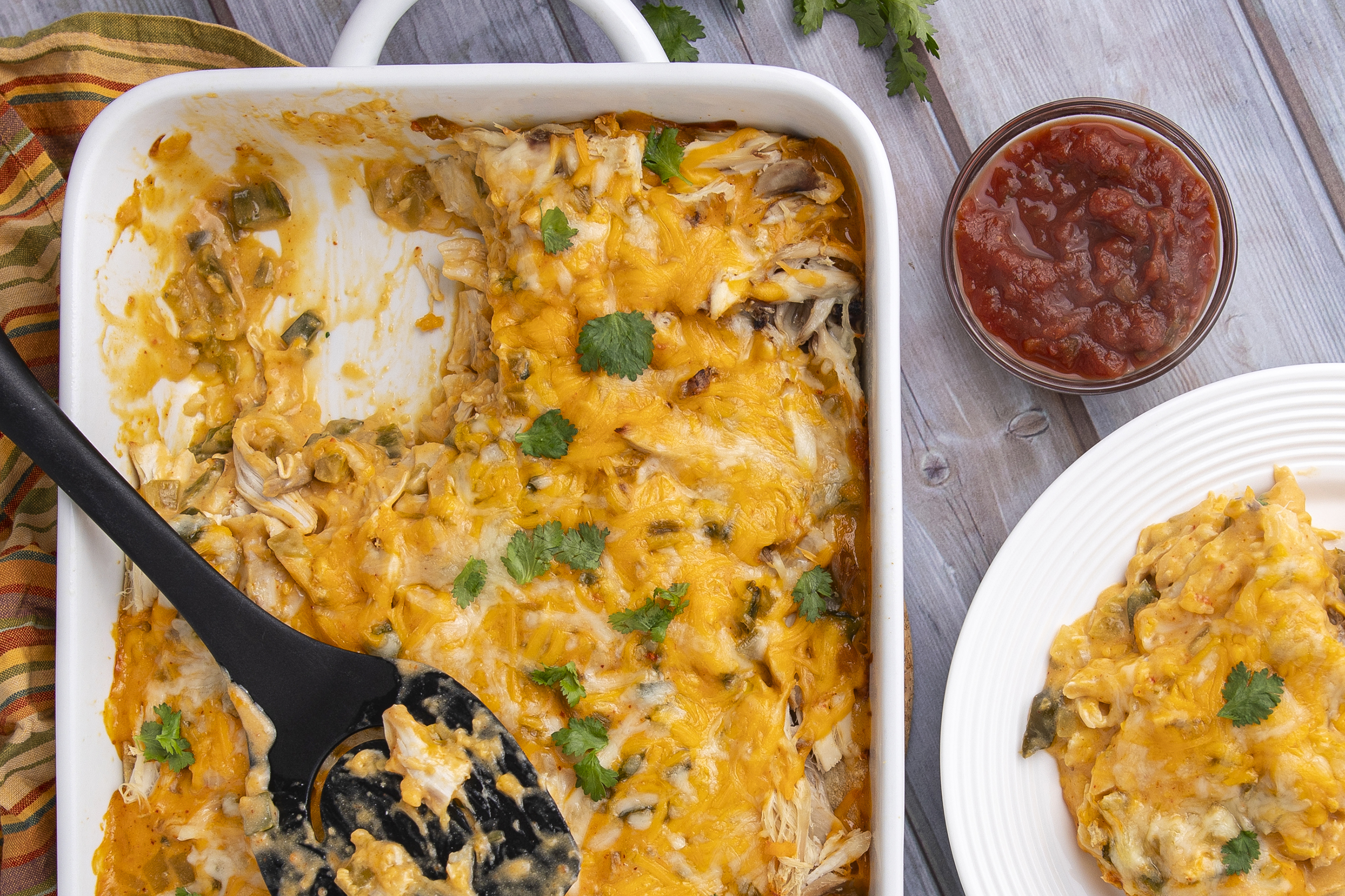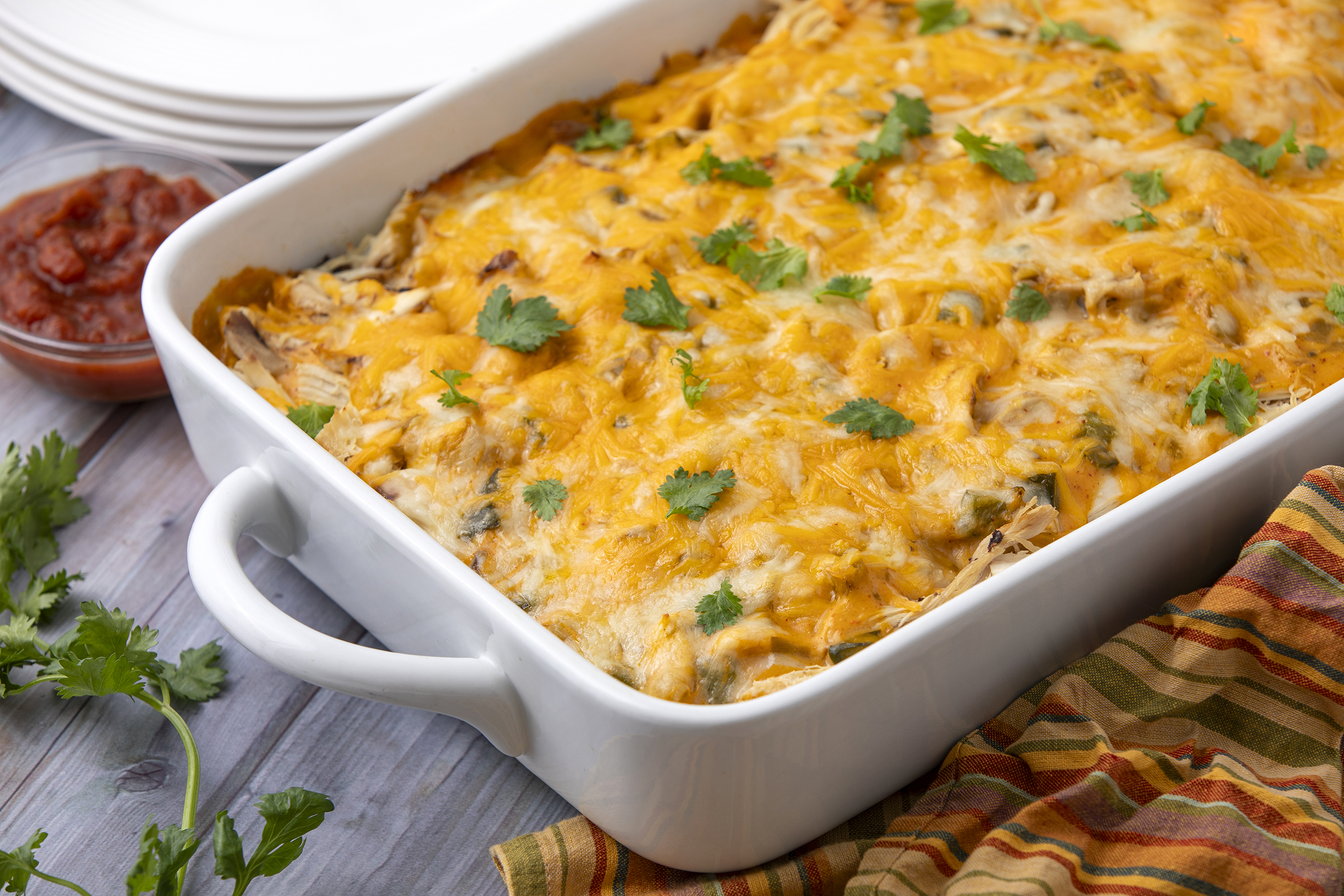 What are some of the most delightful things in your life? Is it spending time with the ones you love most? Or maybe you enjoy a night alone in the peace and quiet? Well, whichever is your ideal scenario, add an extra taste of joy with some Enchilada Delight Bake. It's creamy, cheesy, and loaded with all the chicken and veggies you could ever dream of. And it's got those savory, spicy Tex-Med flavors you love so much. Oh, and a bonus point. There is no need to make a mess rolling up tortillas with this one. It's all baked in for some tender, gooey goodness. So, let's make the most of this special time with Enchilada Delight Bake!
