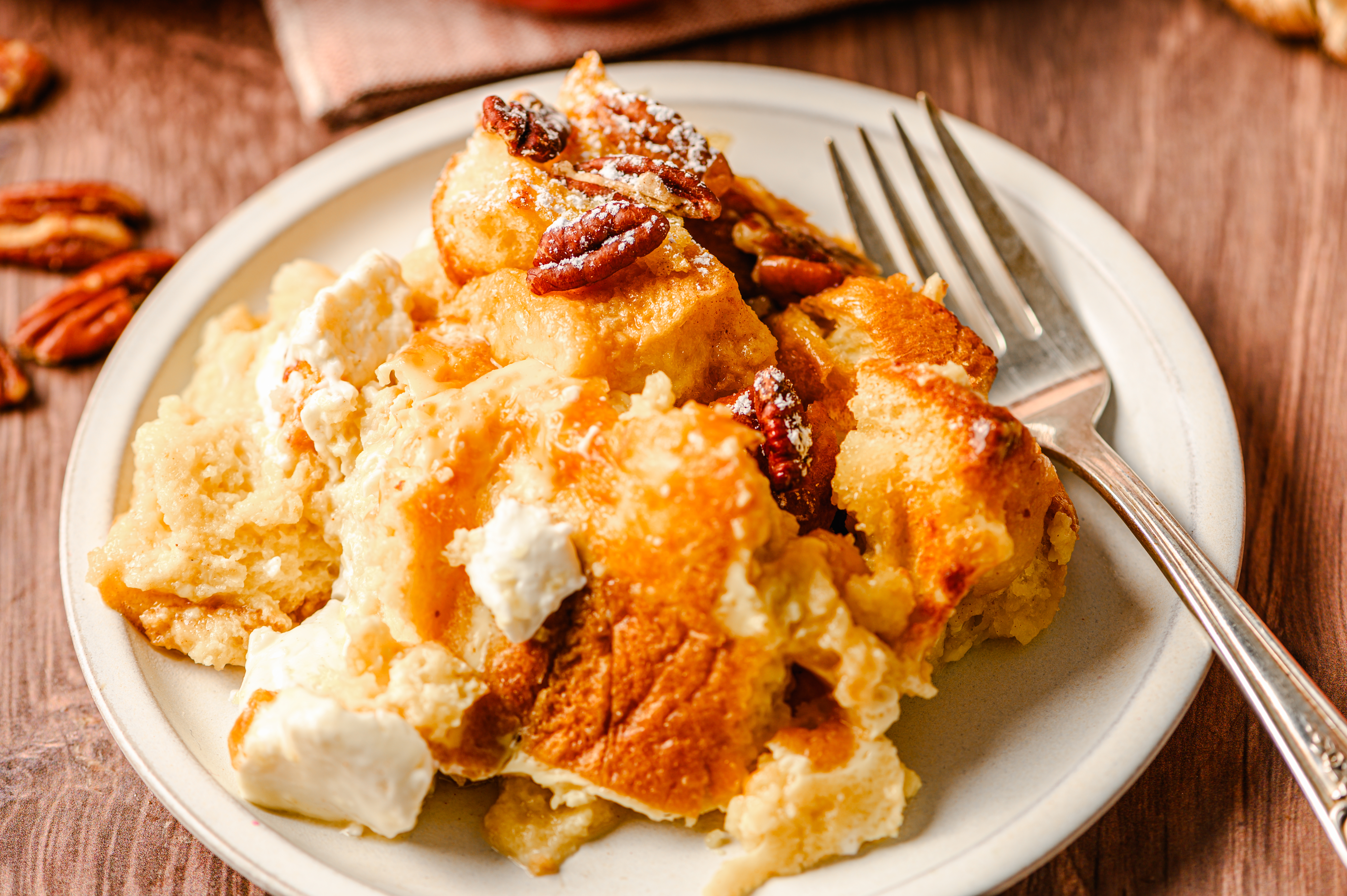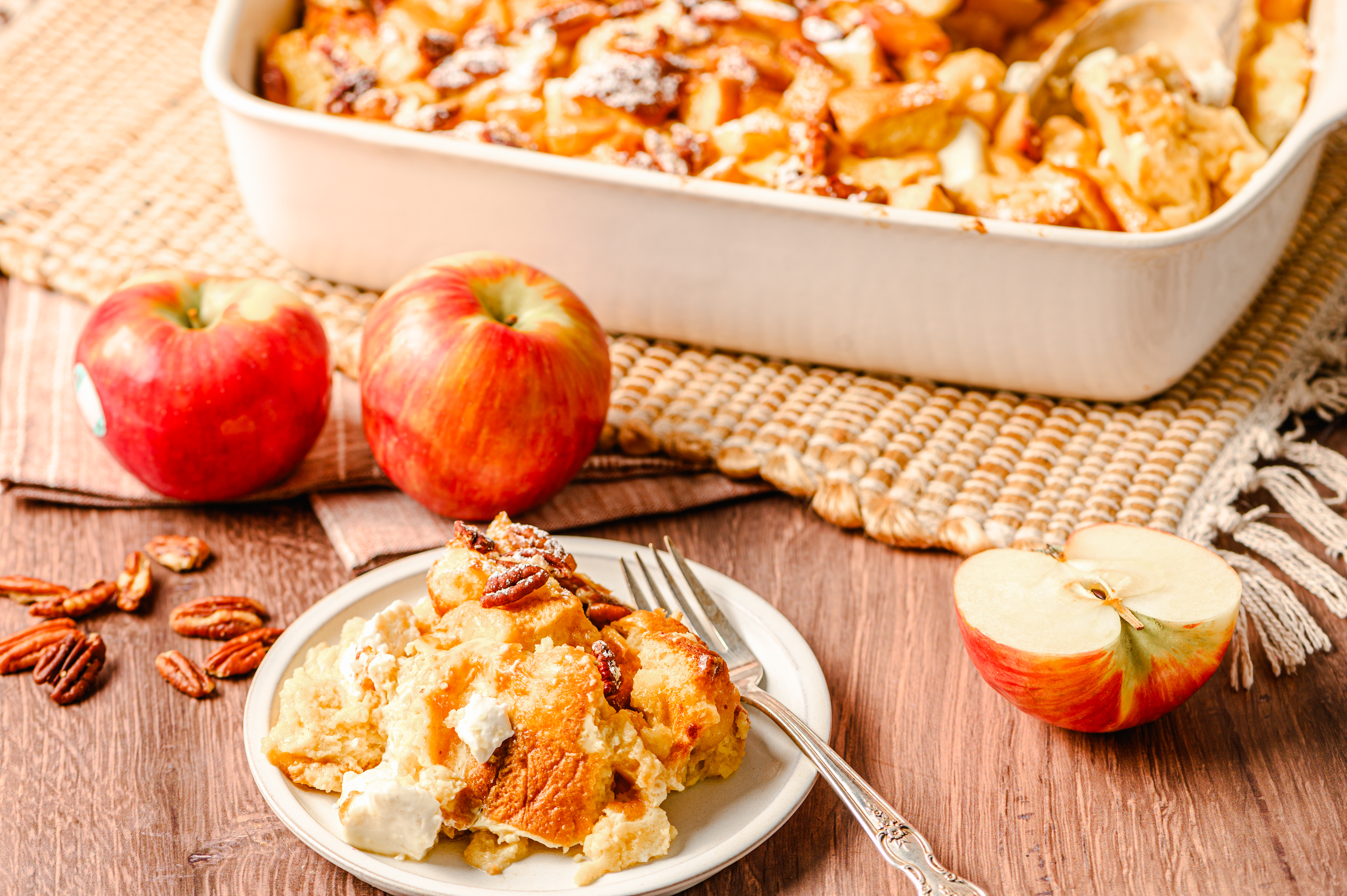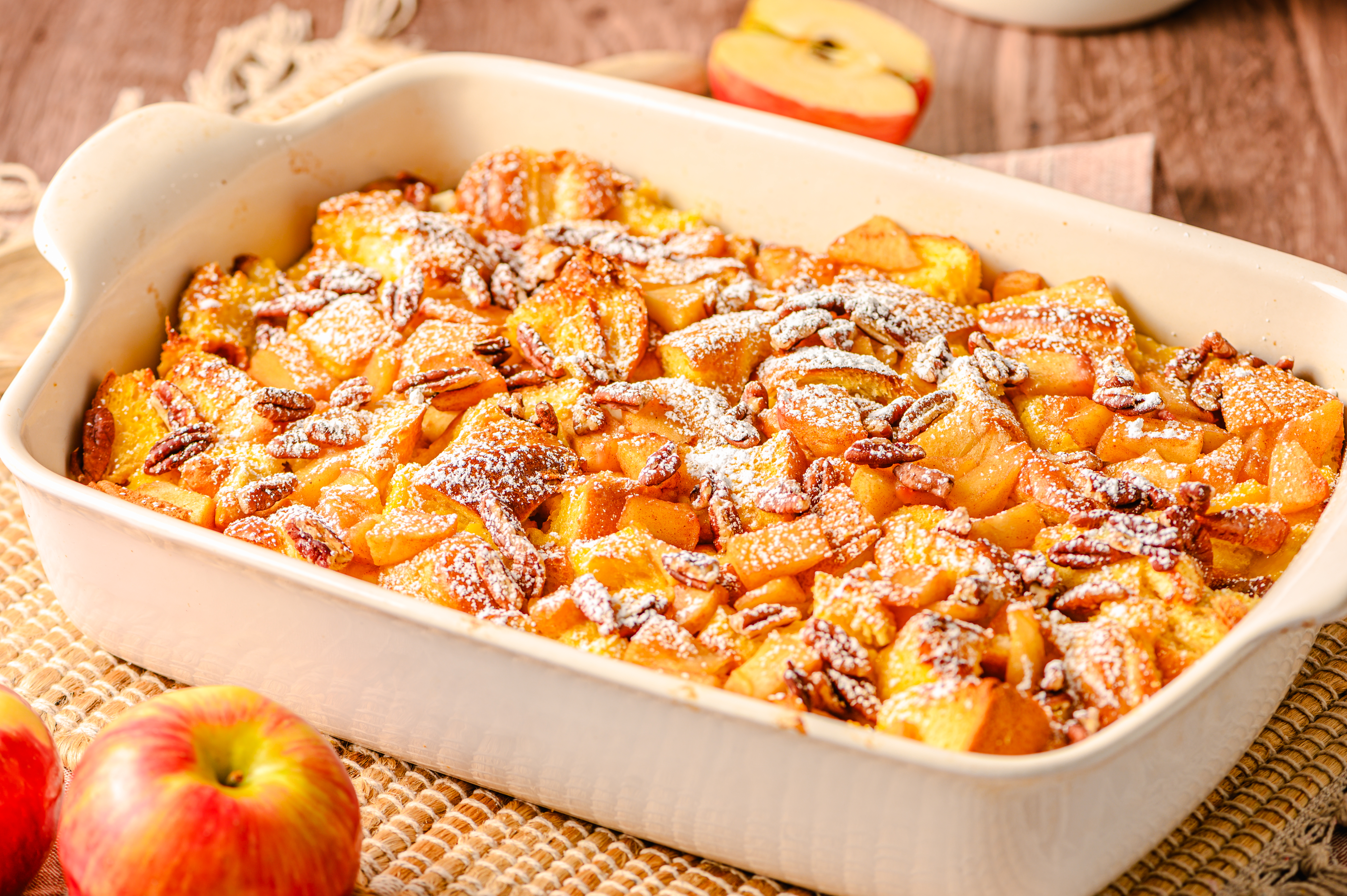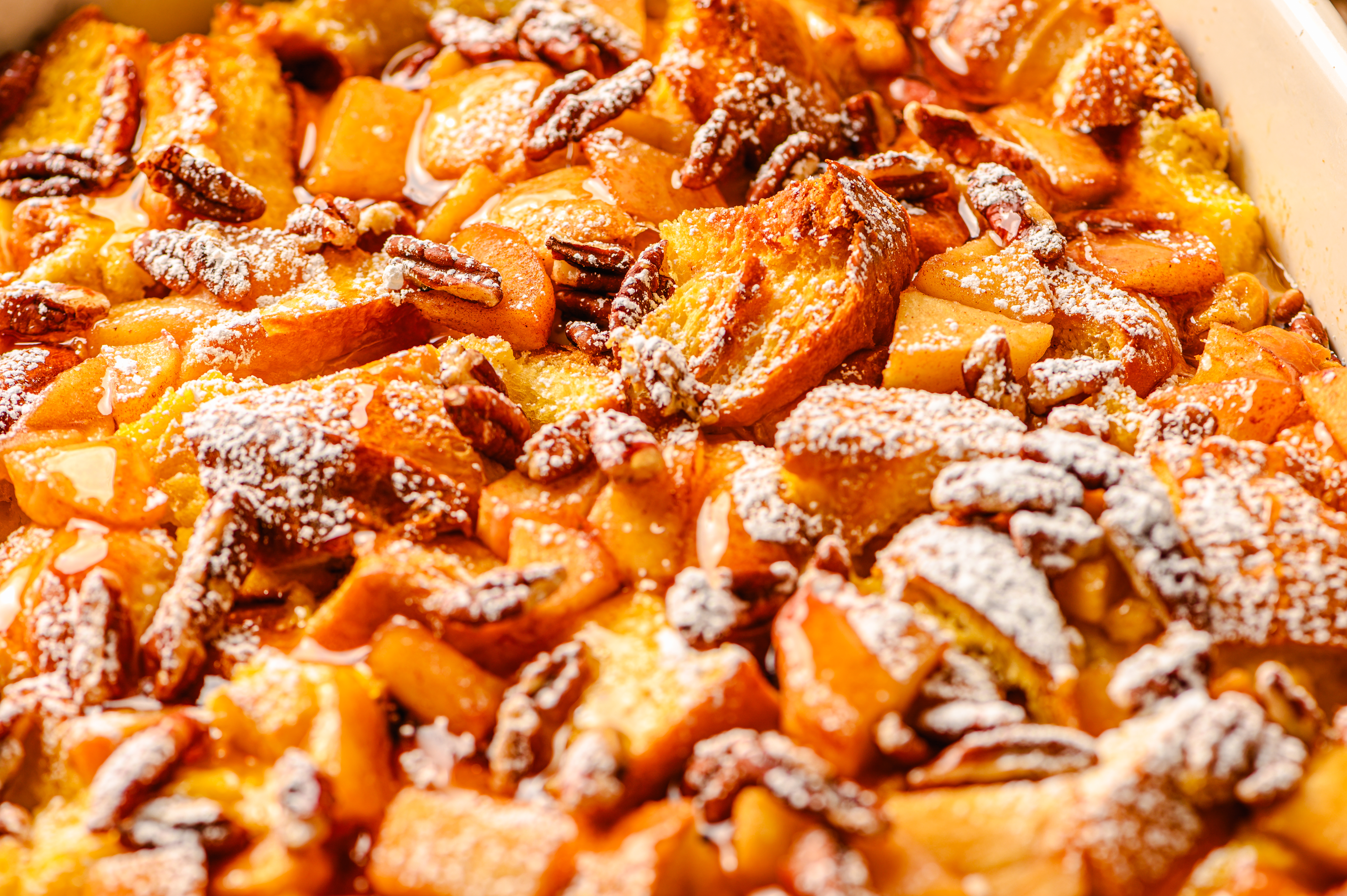 Fall French Toast Casserole contains all the flavors you might expect, embracing the sweetest parts of the harvest season! Tart, crisp, jammy apples and notes of smoky maple syrup add new dimensions to the creamy, tangy, custardy taste of the French toast. It's all baked golden-brown and dusted with confectioners' sugar, a poetic reminder of the coming snow and an extra touch of sugary goodness! Fall French Toast Casserole is the kind of breakfast that makes you happy summer is over!