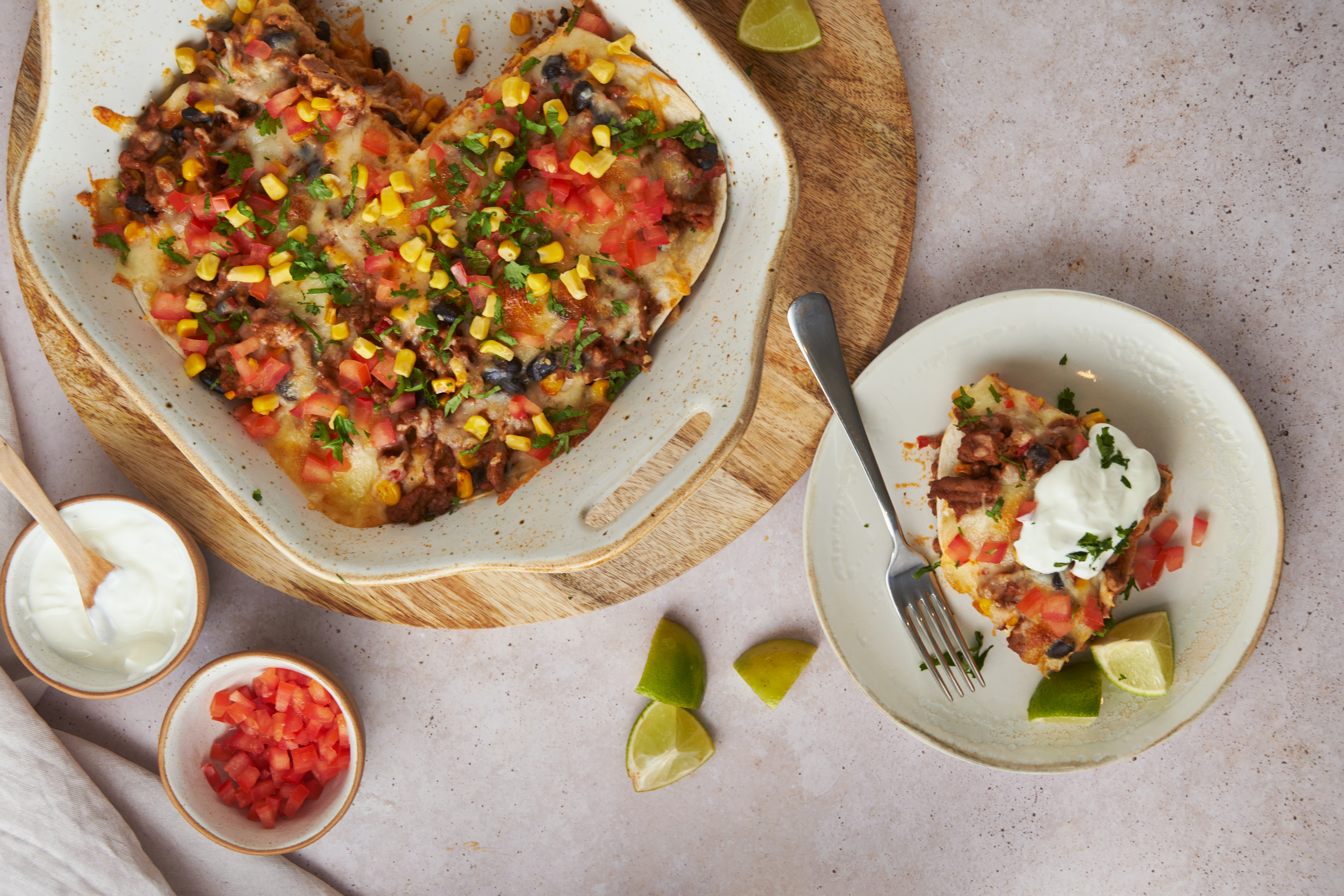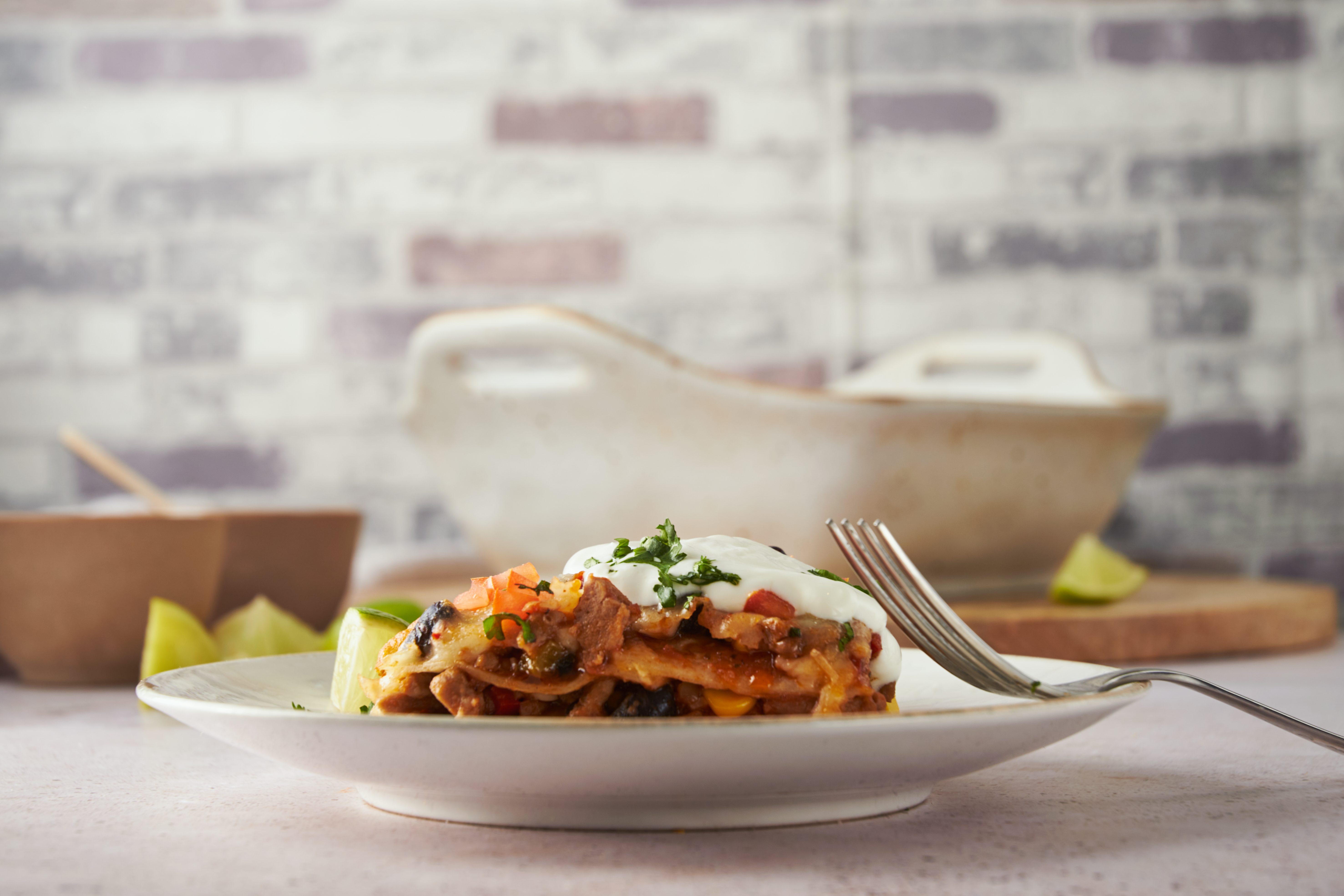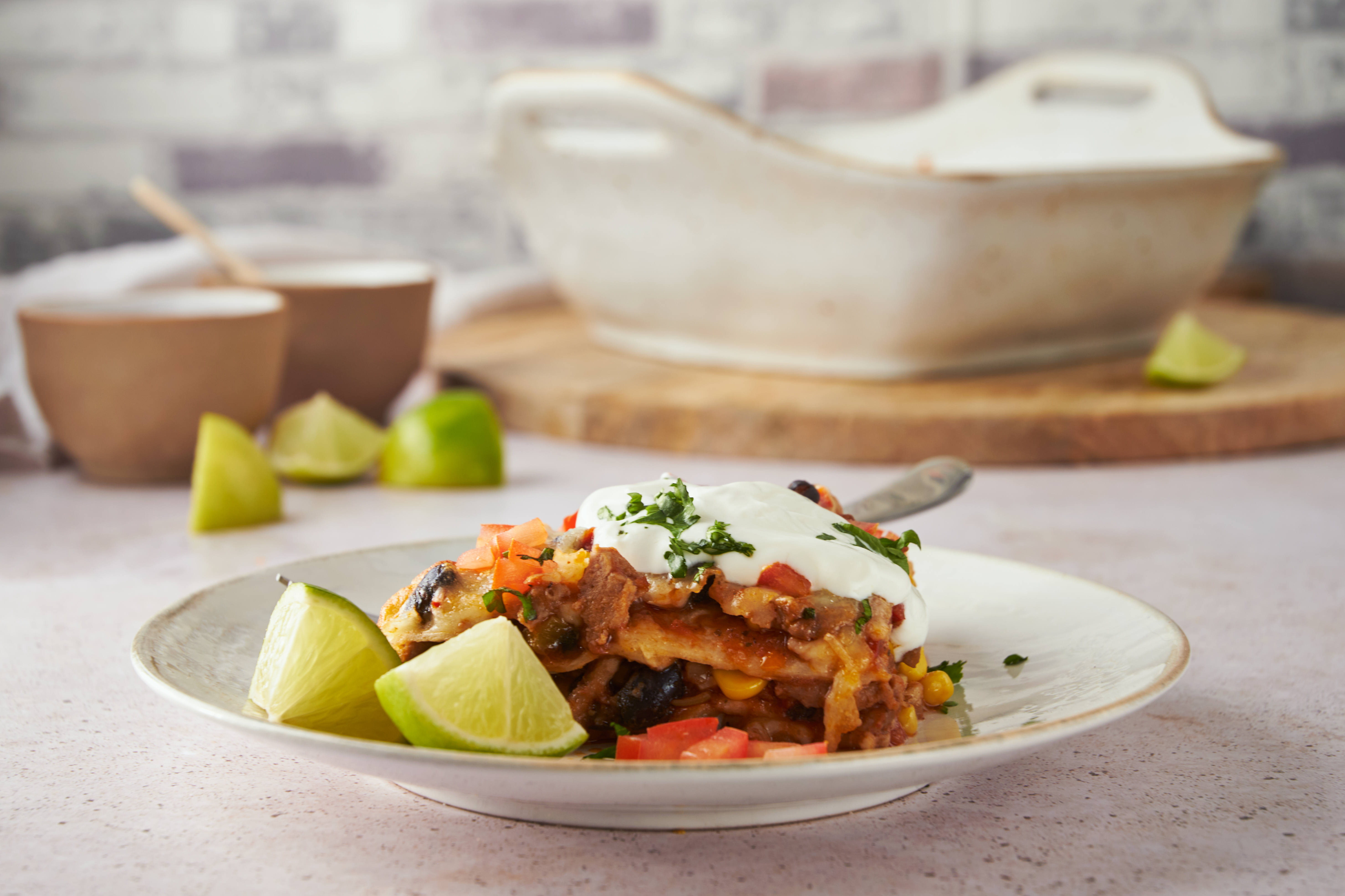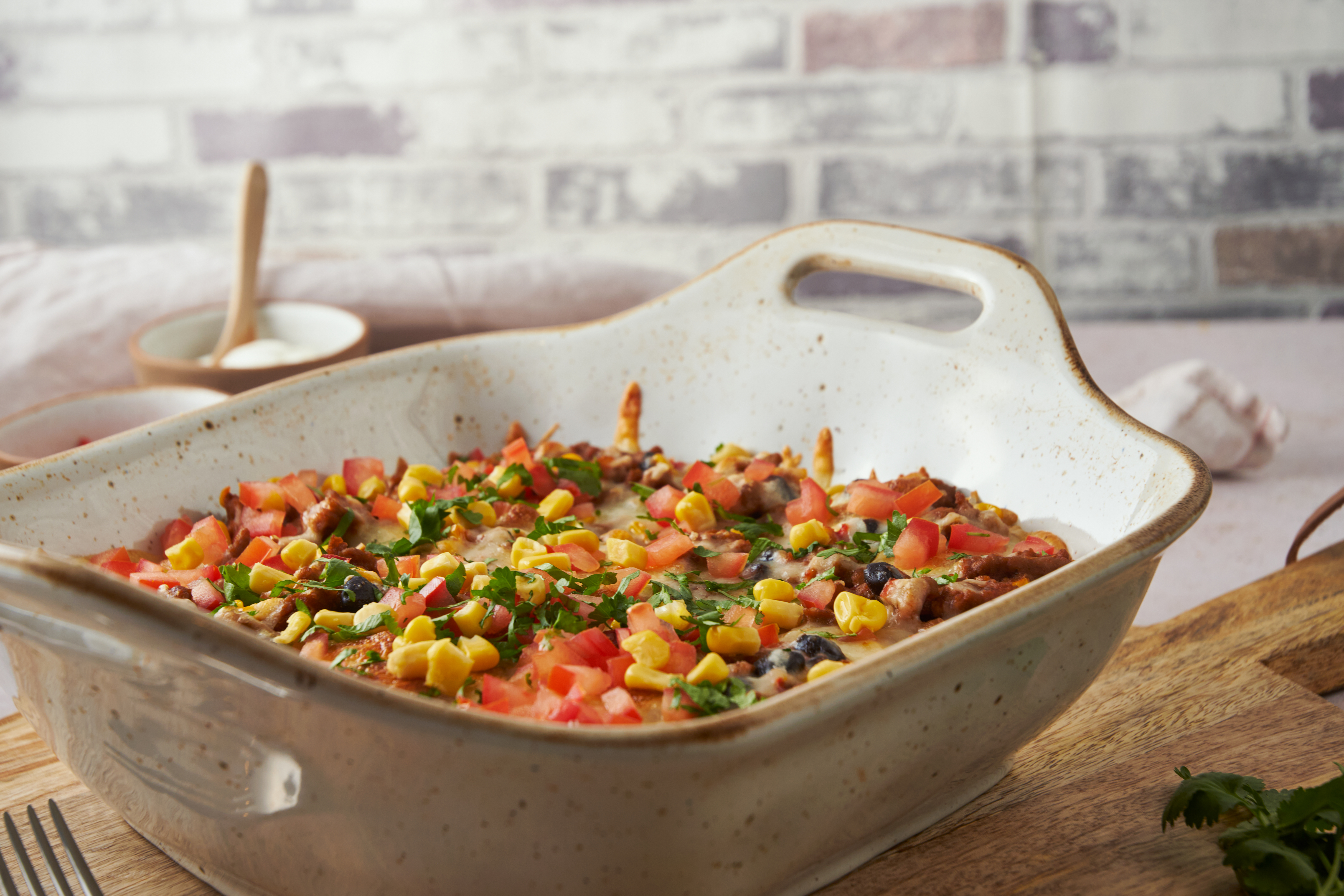 It's a real party with the Family Fiesta Bake! It features taco meat infused with a homemade taco seasoning blend, which makes it extra meaty and zesty! The casserole itself is loaded with tortillas, hearty black beans, vibrant tomatoes, crisp bell peppers, and melted cheese; in other words, all the Tex-Mex favorites! You can even top your Family Fiesta Bake with your most beloved taco toppings for even more fun! It's time to start the festivities with the Family Fiesta Bake!