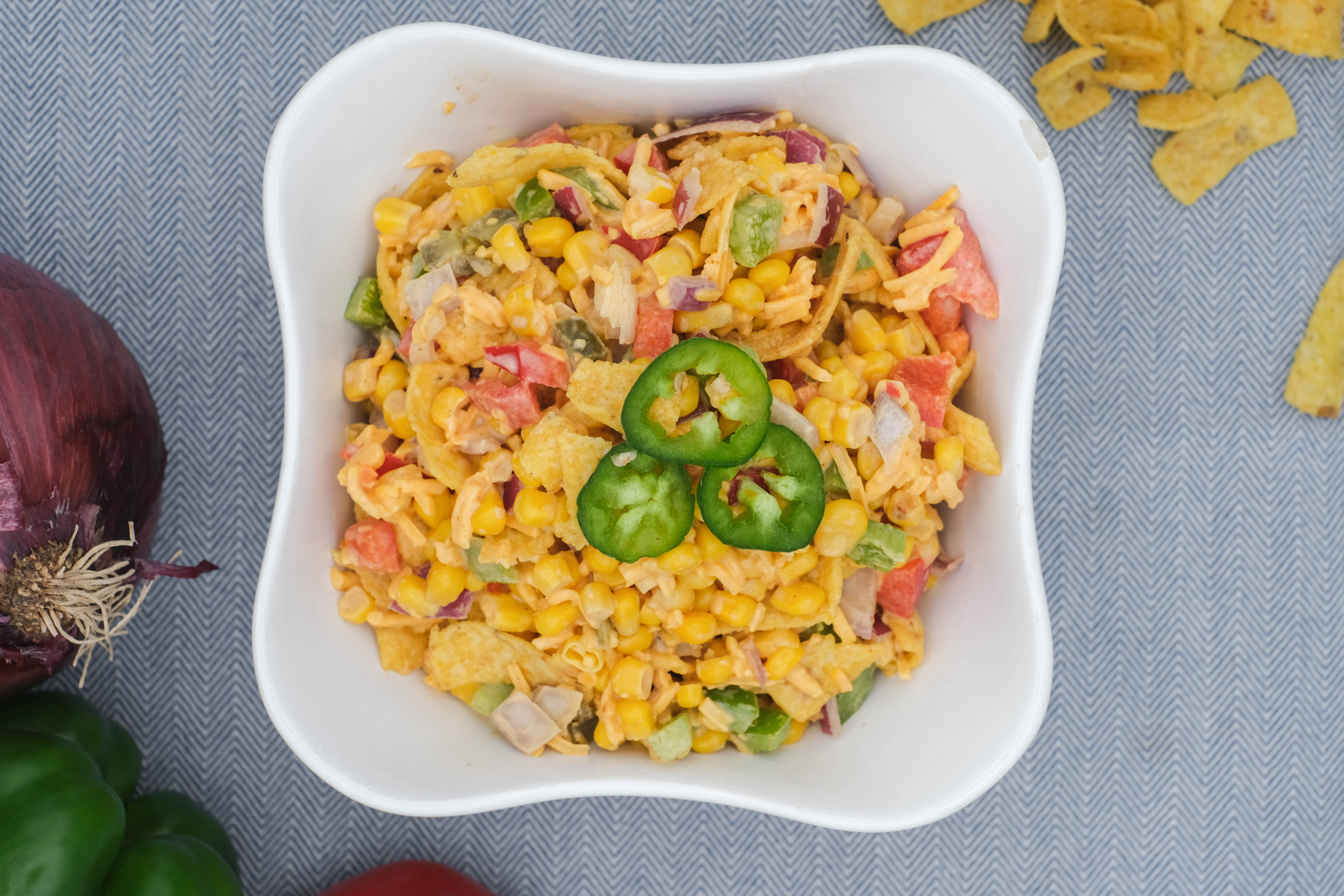 It's cookout season! And with every fun pool party, comes the best Frito Corn Salad, and we're pretty confident this will be the one. It's cheesy, creamy, juicy, and crunchy. The flavors of the fresh veggies and the creamy dressing combine to create such a satisfyingly delicious experience. And we think it tastes the absolute best served alongside a burger straight from the grill. Get ready for the cannon ball of fun and flavor that is this Frito Corn Salad! You can't have a cookout without it!