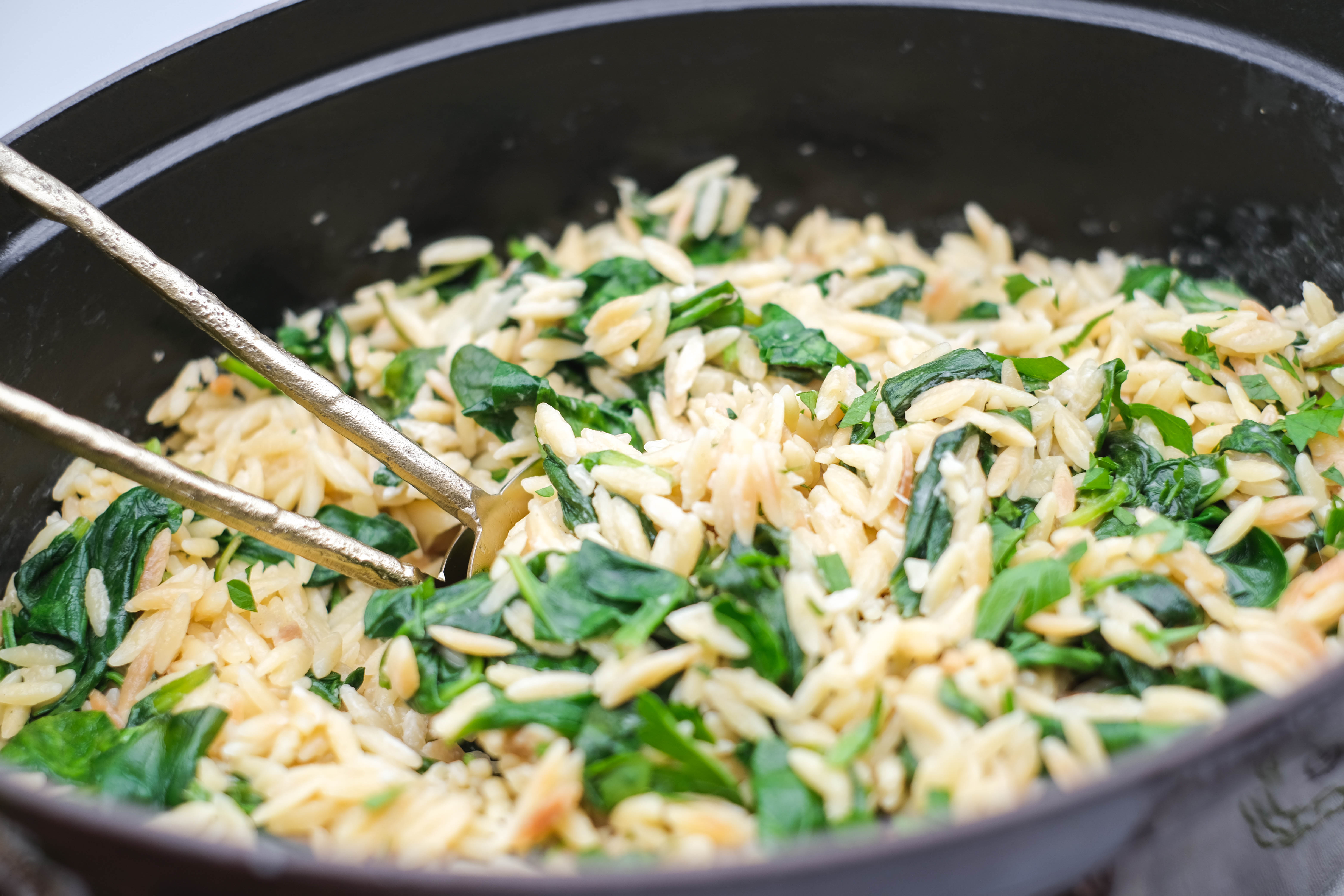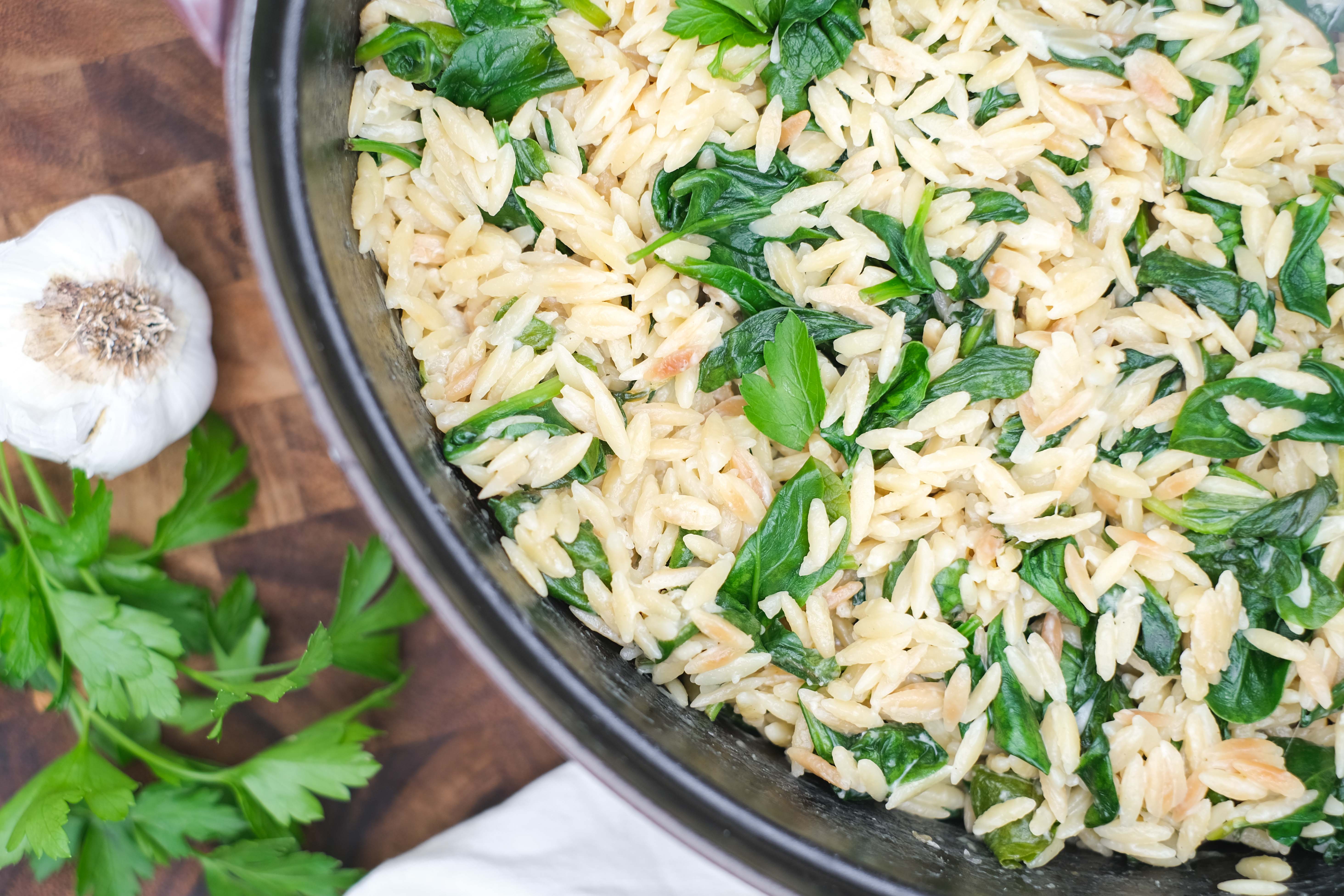 Classic pasta dishes are beloved, and few pastas taste more classic than this Garlic & Spinach Orzo. The roasted garlic throughout ensures each bite is fragrant and delicious. The sauce is creamy, tangy, and cheesy, and loaded with even more garlic flavor to charm and perfume the tender orzo. Herbaceous and happiness-generating, this Garlic & Spinach Orzo will bring a smile to your face!