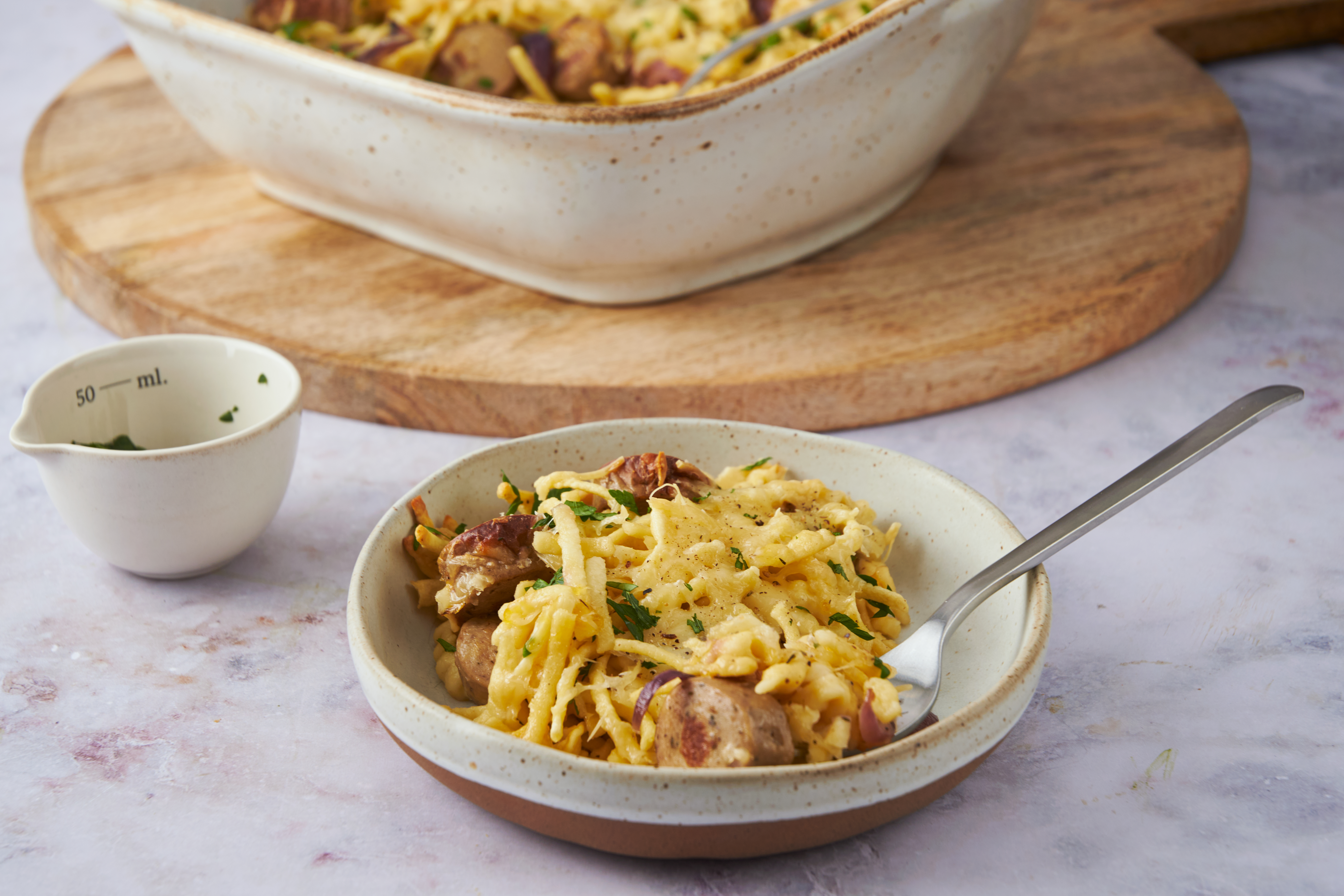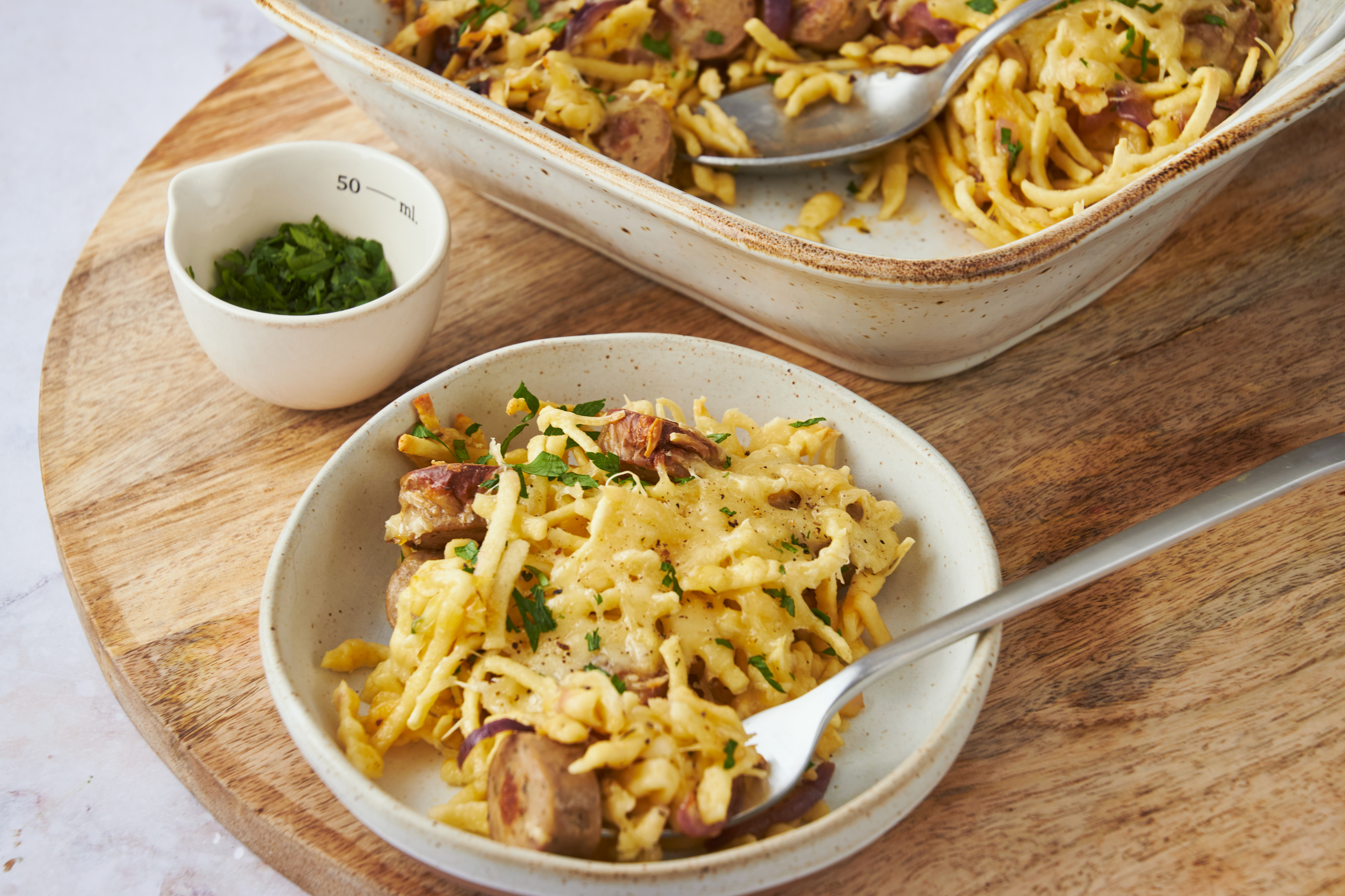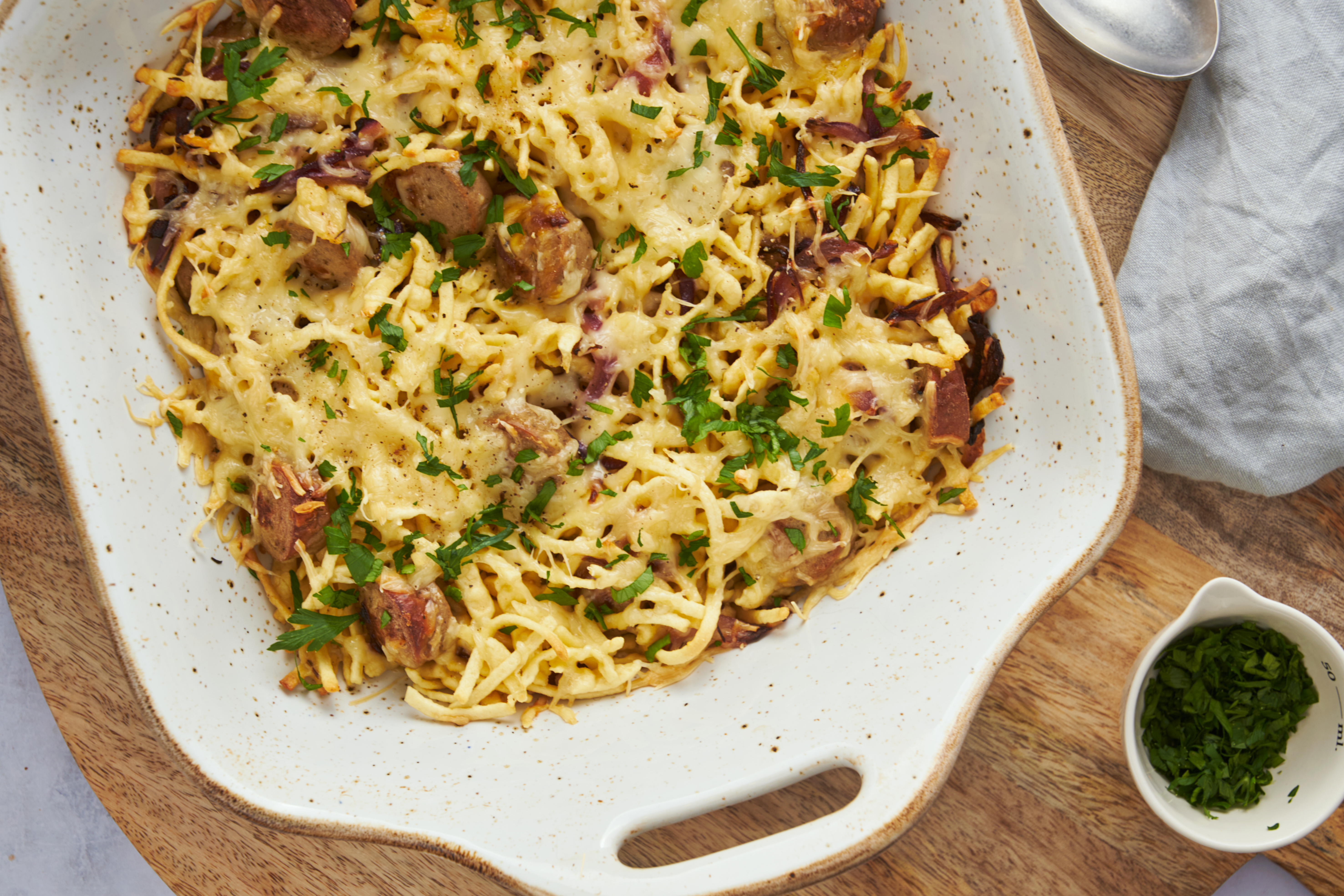 The German Bake isn't just named that for fun, although it does have a ring to it! Rather, this German Bake really embraces its national cuisine. Spicy, savory kielbasa pan-fried to a golden-brown is a great start on that front. So are the tiny, tender handmade dumplings and the buttery, nutty Emmental cheese. It's a truly wonderful dish that uses favorites from Germany to really make your taste buds happy!