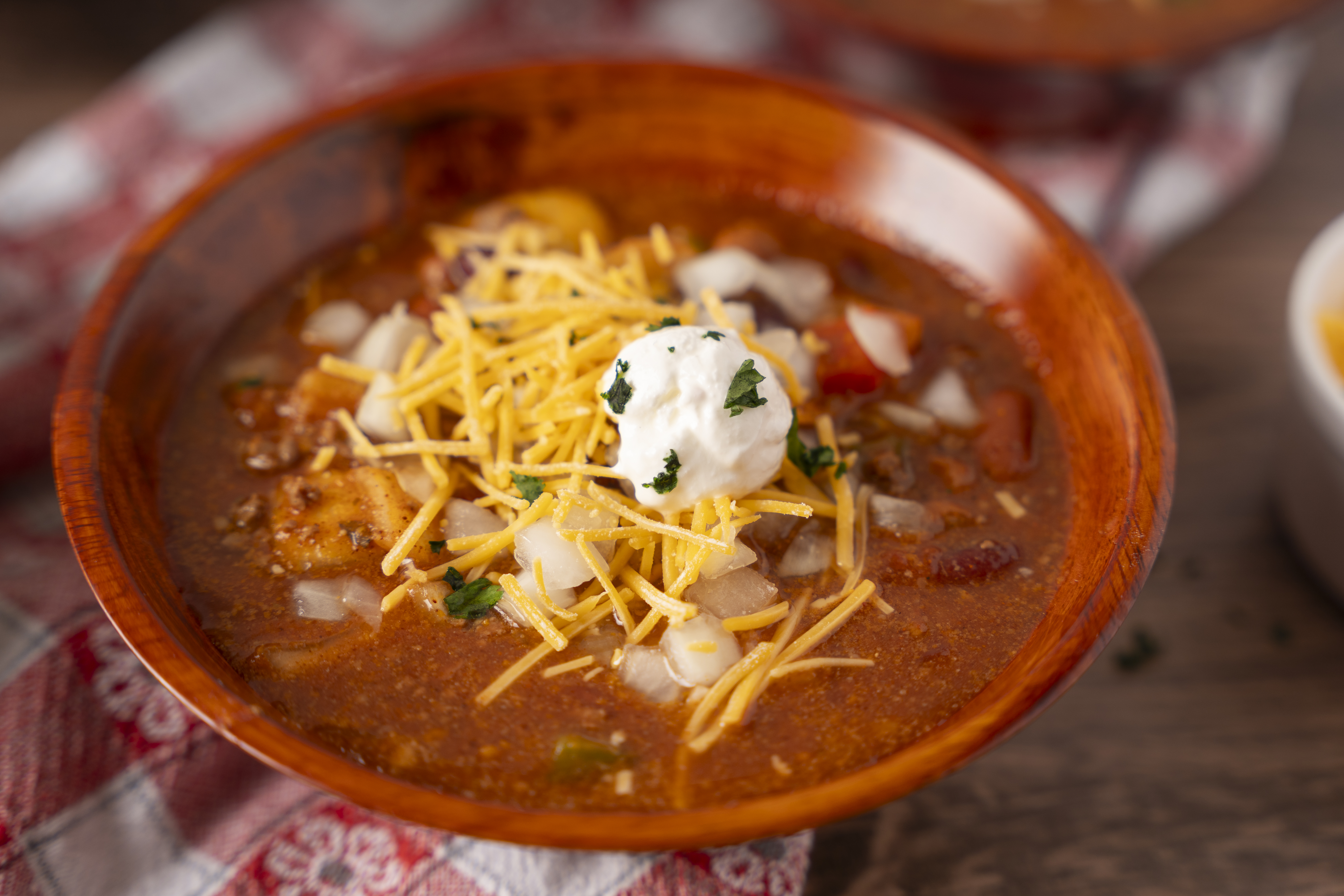 Step 5 -Divide the chili into serving bowls, topping each with an even amount of the cheddar cheese and the remaining onion.