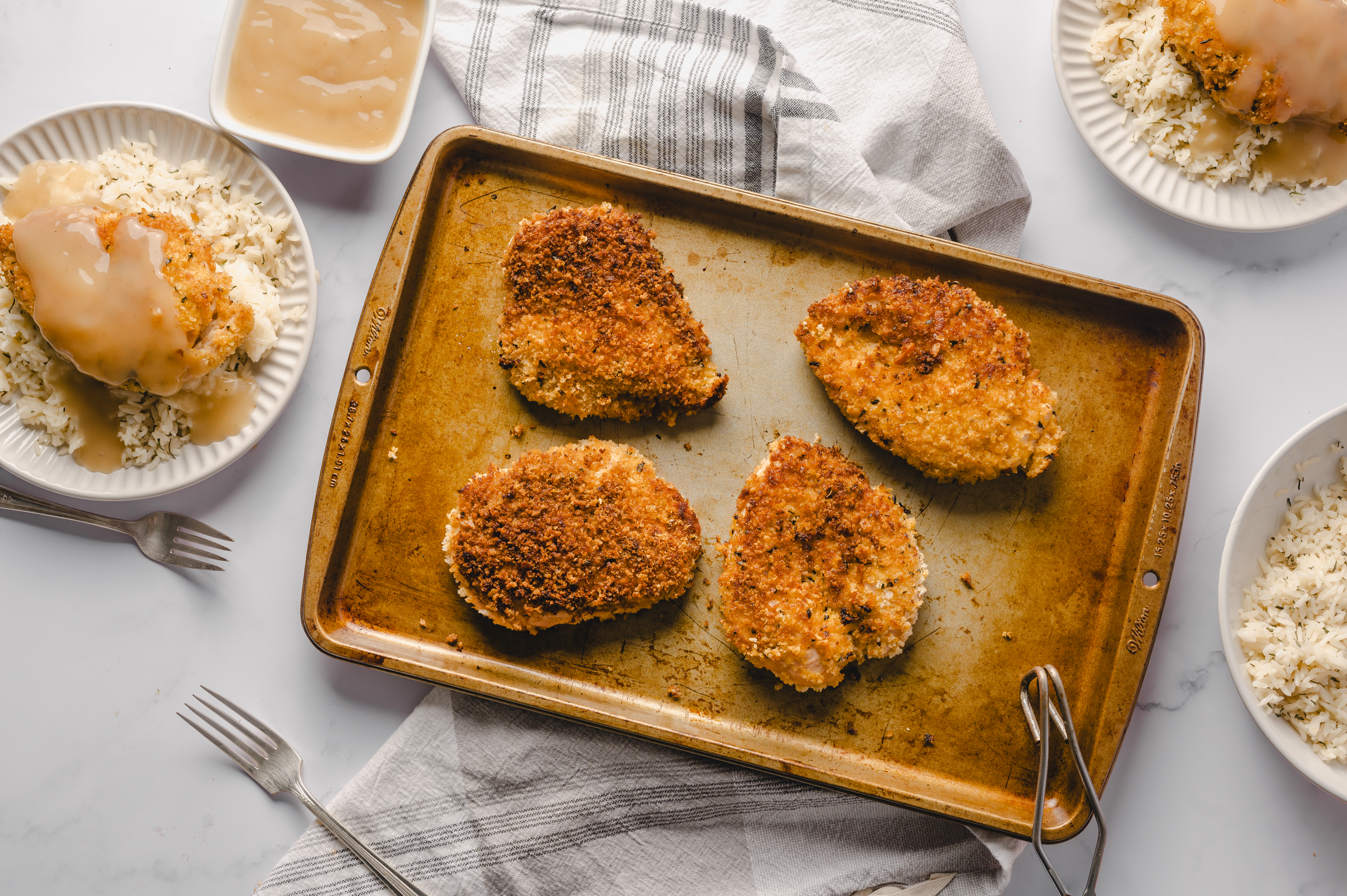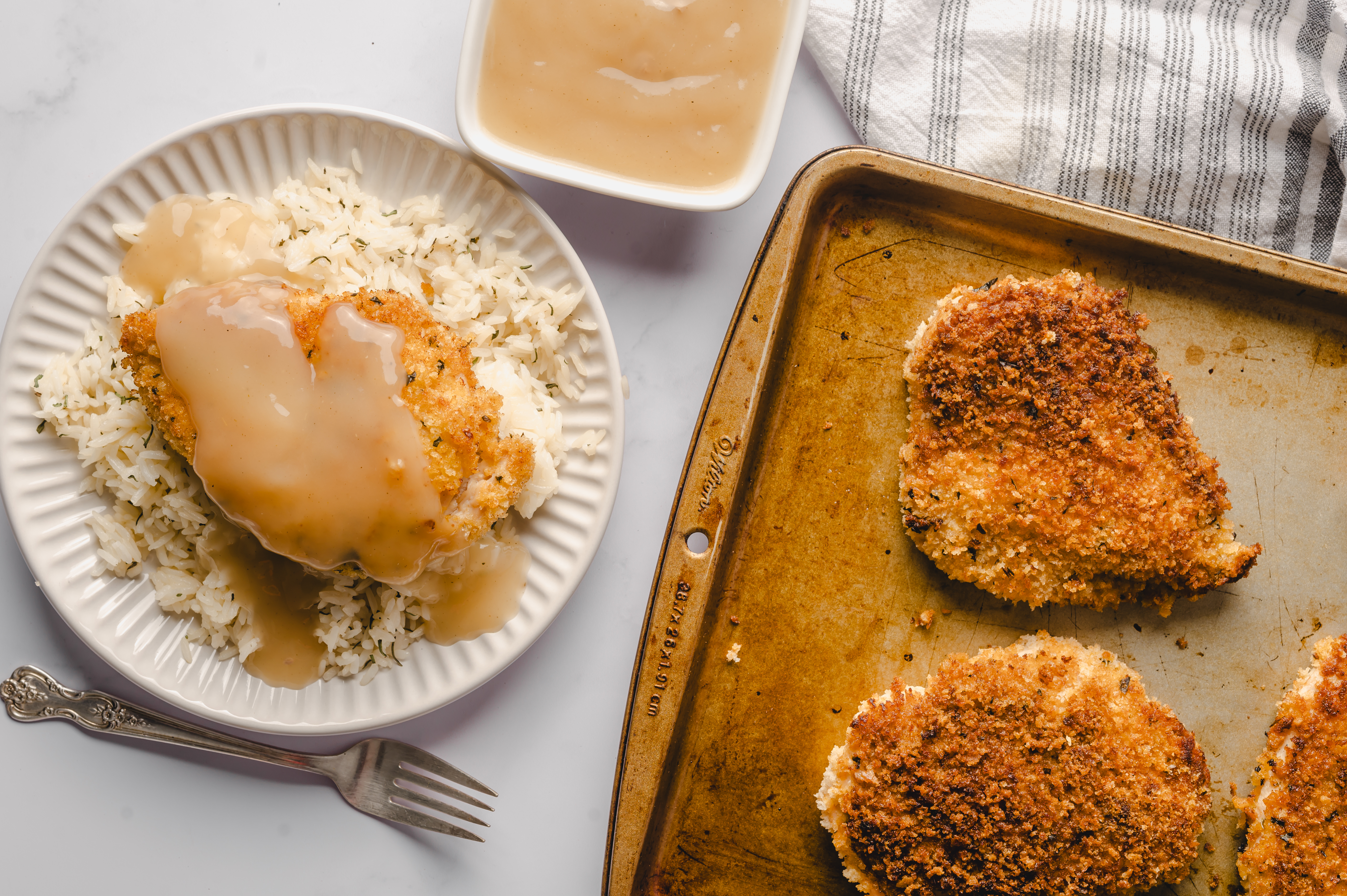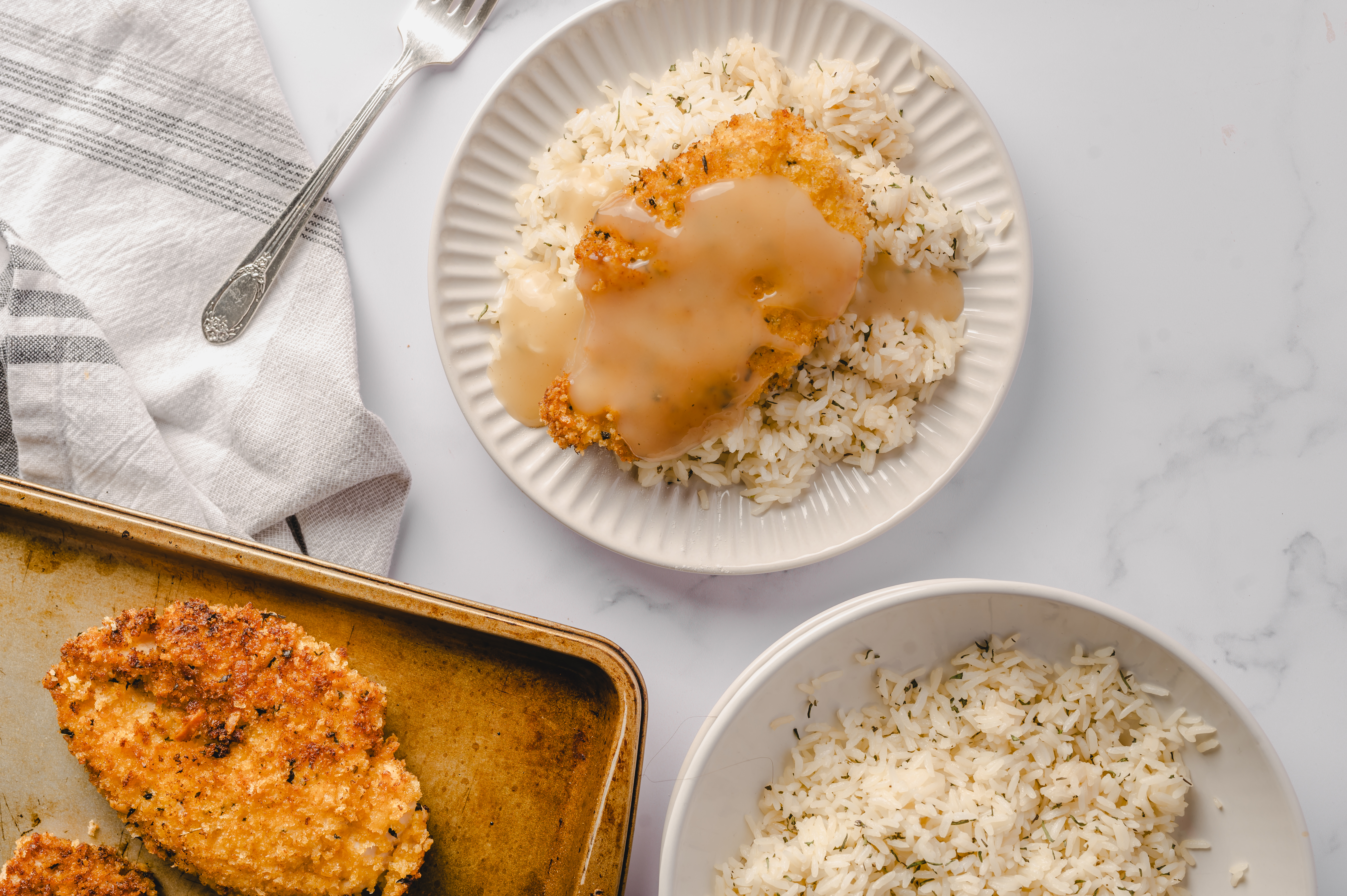There is nothing more downhome than this! Granny's Chicken & Rice Supper is a wholesome meal you can never get enough of! Juicy chicken breasts are coated with a seasoned panko breadcrumb coating, lightly browned, and then baked until crunchy, yet fork tender, and served alongside a bed of herbed rice. Plus, it's all drizzled with some delicious brown gravy to make this meal a forever-favorite. Not that you shouldn't visit her often, but now you don't have to go to her house every time you crave Granny's Chicken & Rice Supper.
