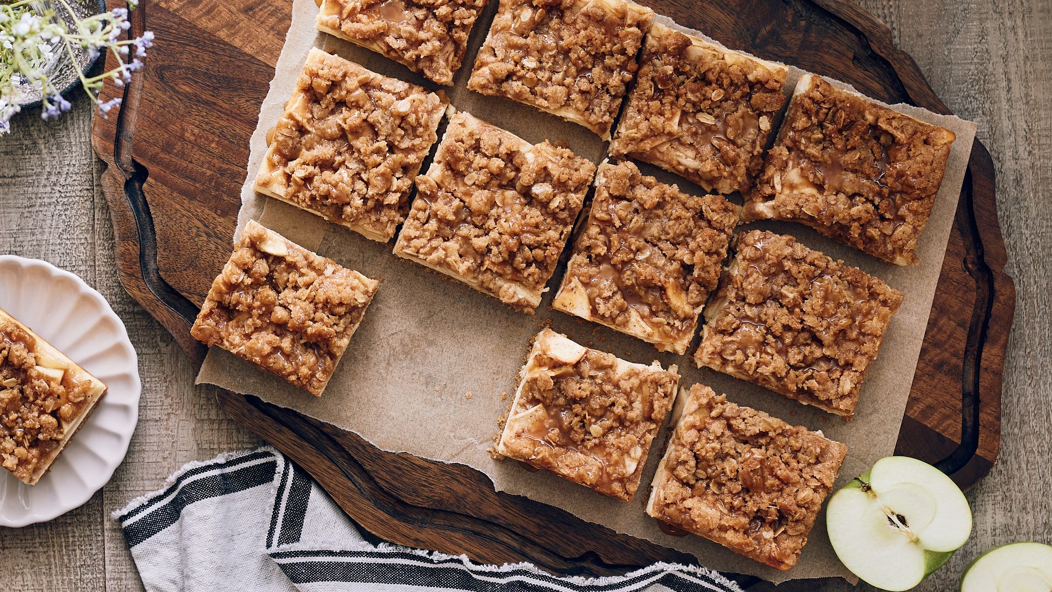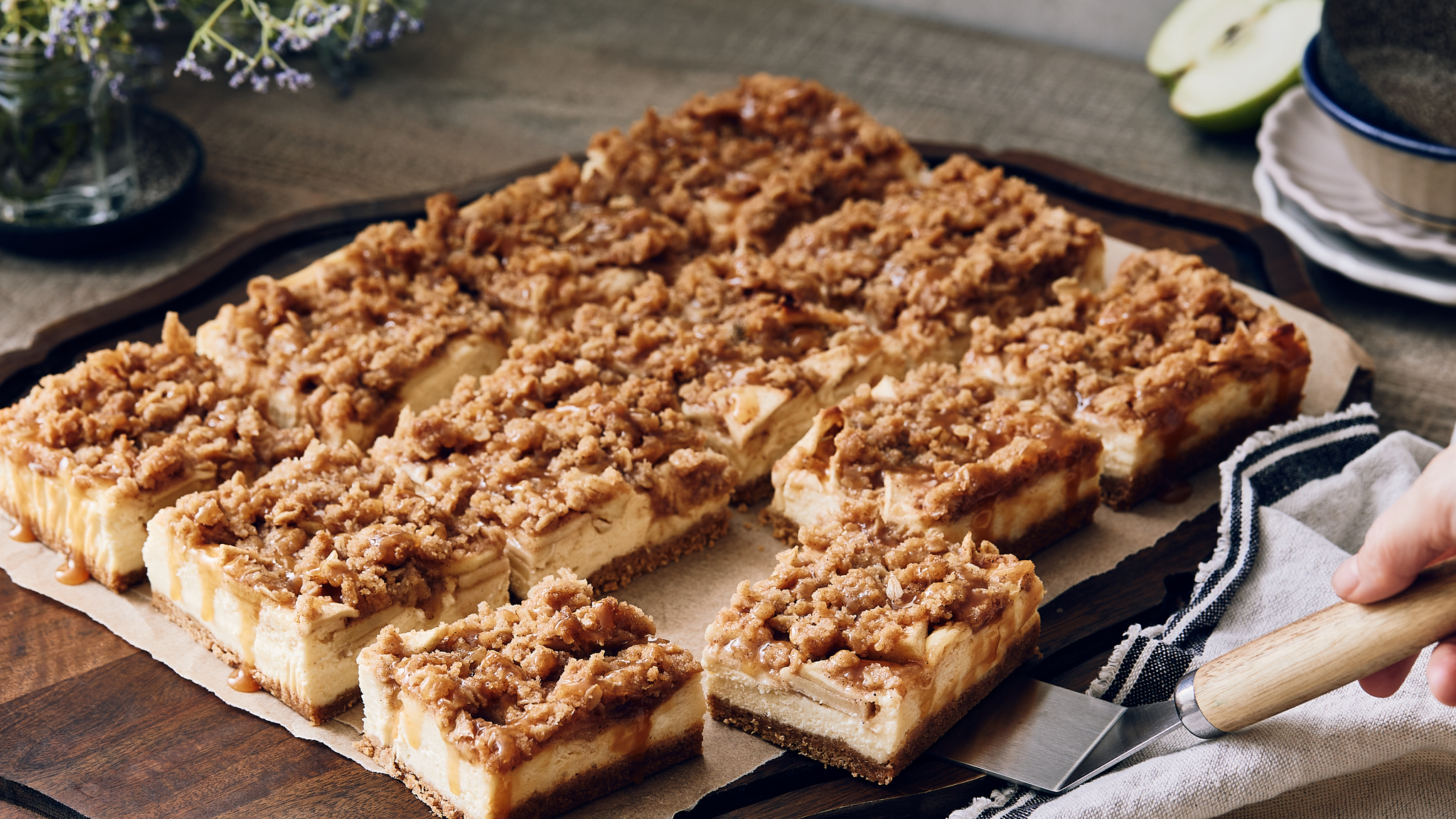 Harvest Cheesecake Bars are just perfect. They're the perfect size for snacking on! They have the perfect buttery, crumbly graham cracker crust! Plus they have the perfect, jammy apple filling, with natural fruity sweetness enhanced with brown sugar and warm apple pie spices! Don't forget the perfect creamy, tangy, rich cheesecake layer! And finally, the flawless crunchy oat crumble on top! Harvest Cheesecake Bars are a bounty of fantastic flavors!