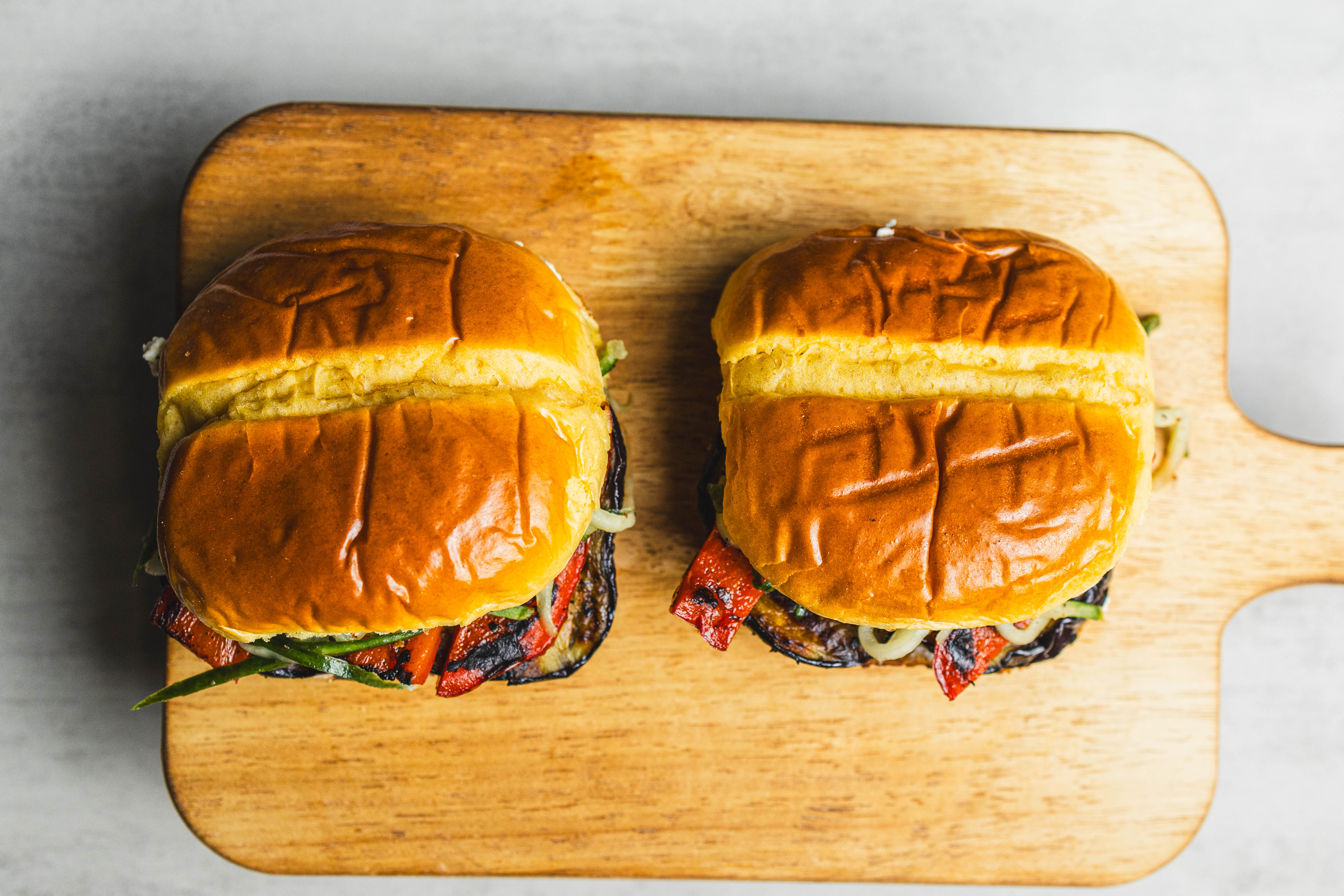 Step 17 -Top the buns evenly with the grilled red peppers, the grilled eggplant rounds, and the dressed cucumber ribbons.