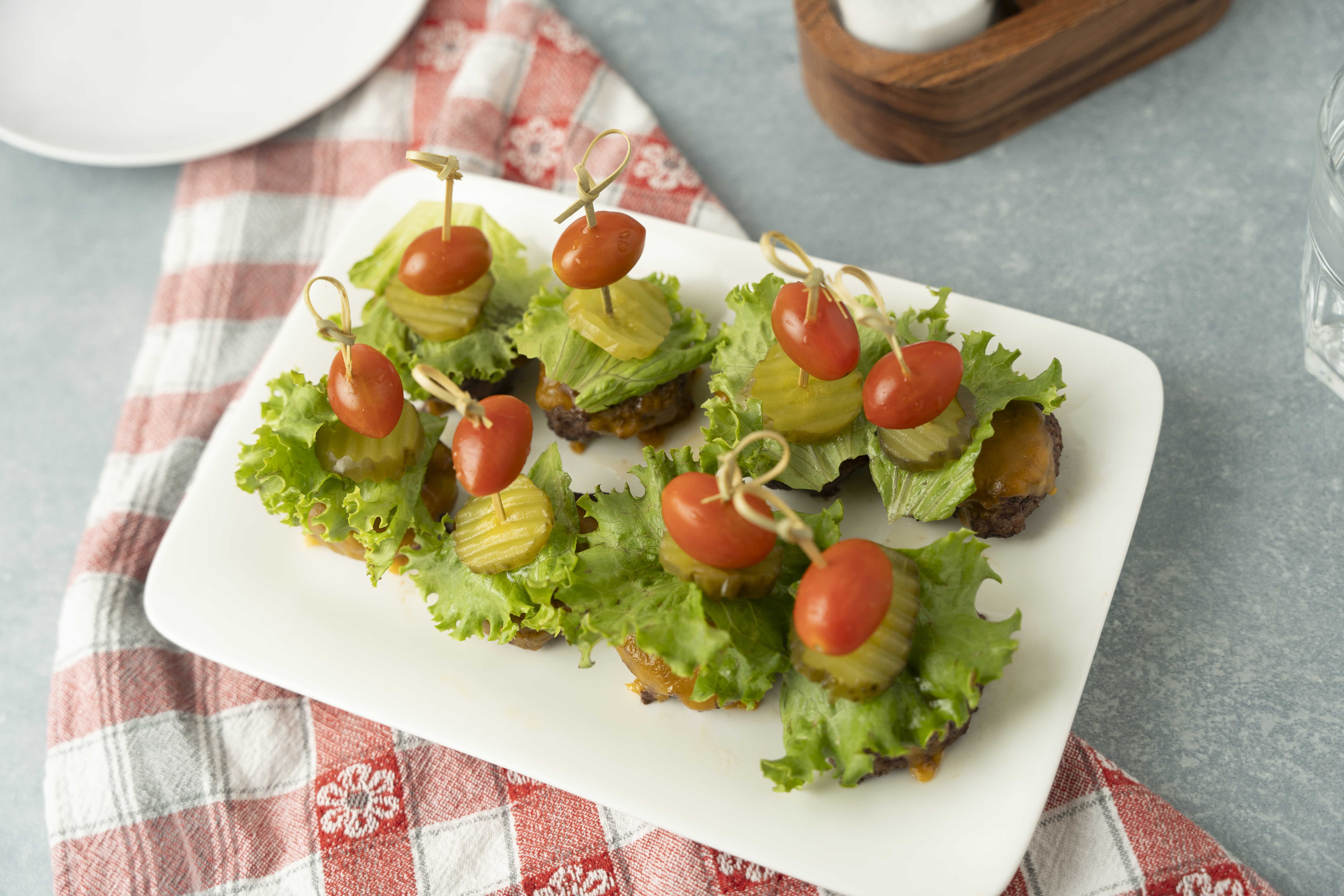 Step 8 -On an appetizer skewer, add 1 cooked patty, 1 piece of the lettuce, 1 of the pickle chips, and 1 of the cherry tomatoes.