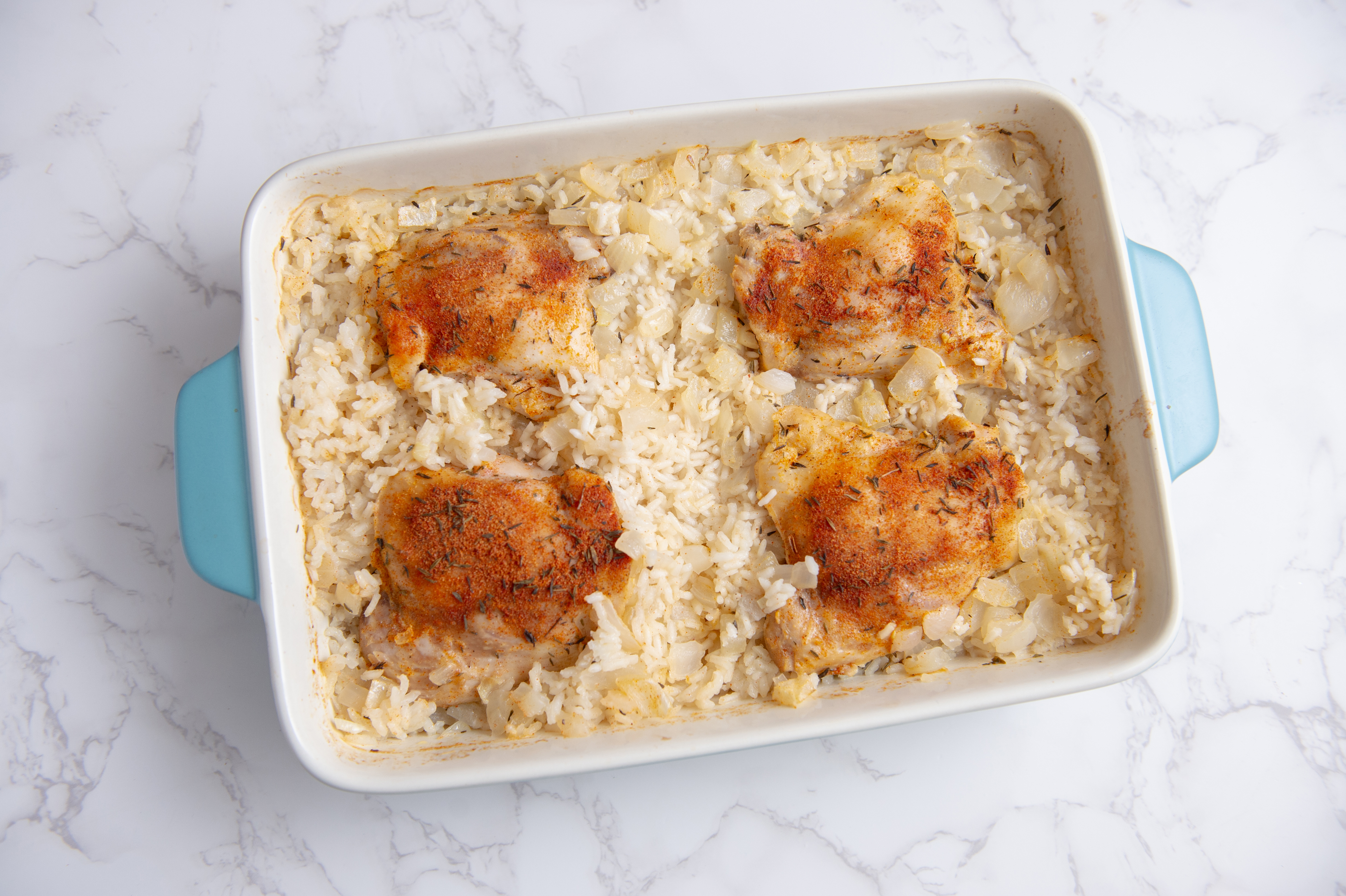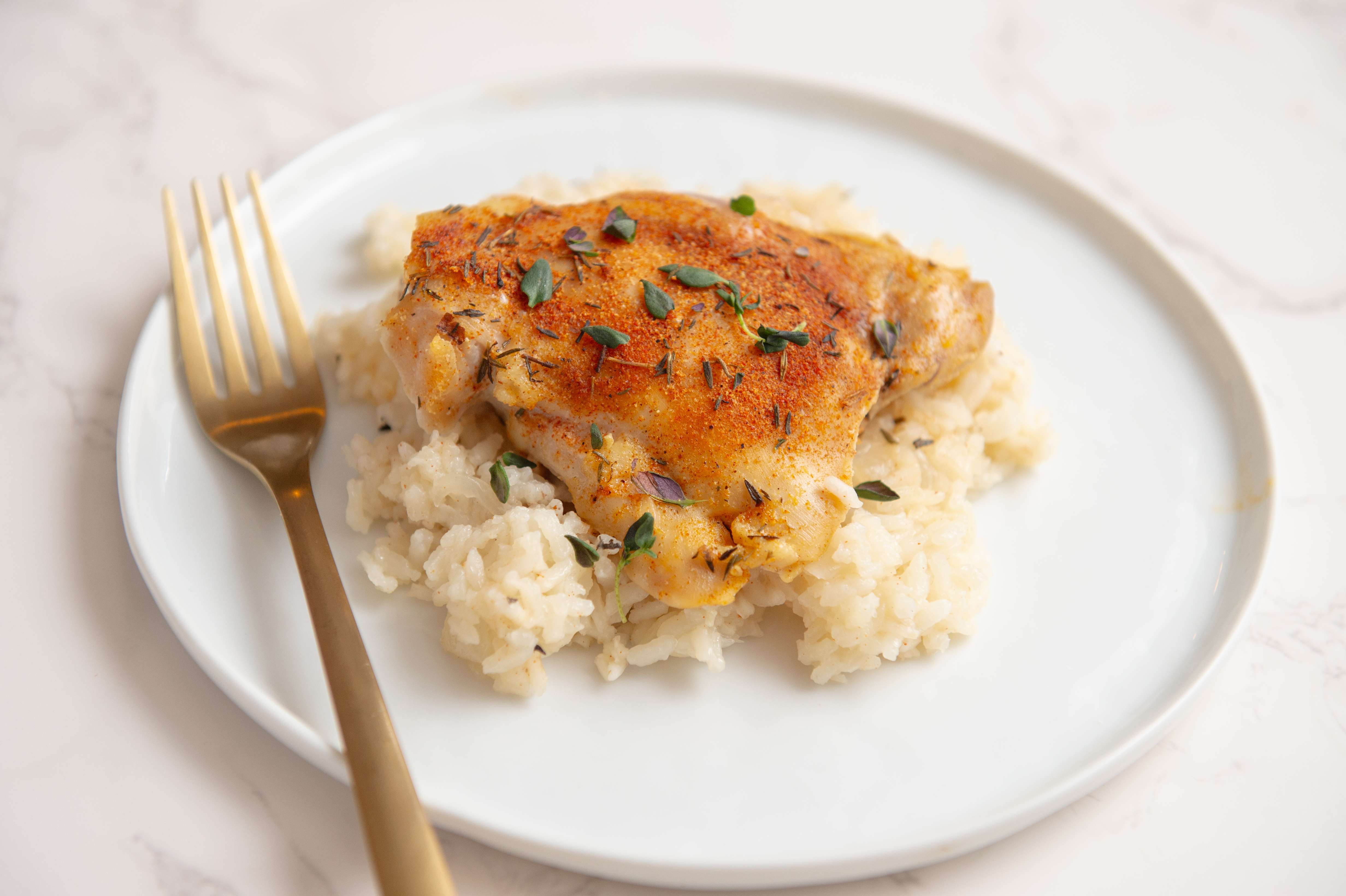 Homestyle Chicken & Rice doesn't mess about; it knows exactly what it wants and what you want, too! The chicken is delightfully seasoned with a homemade rub and braised in chicken broth for an extra savory kick, and then baked alongside tender rice that absorbs all the good flavor! This is a pairing made in heaven; Homestyle Chicken & Rice will amp up how you imagine home-cooking from now on!