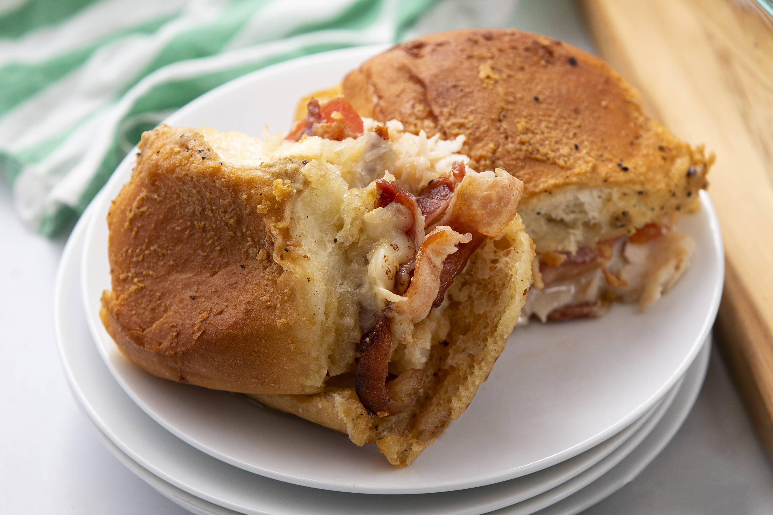 Step 7 -Top the bacon layer with the remaining Gruyère slices, cutting them to fit, then sprinkle with the parmesan. Cover with the top half of the rolls.