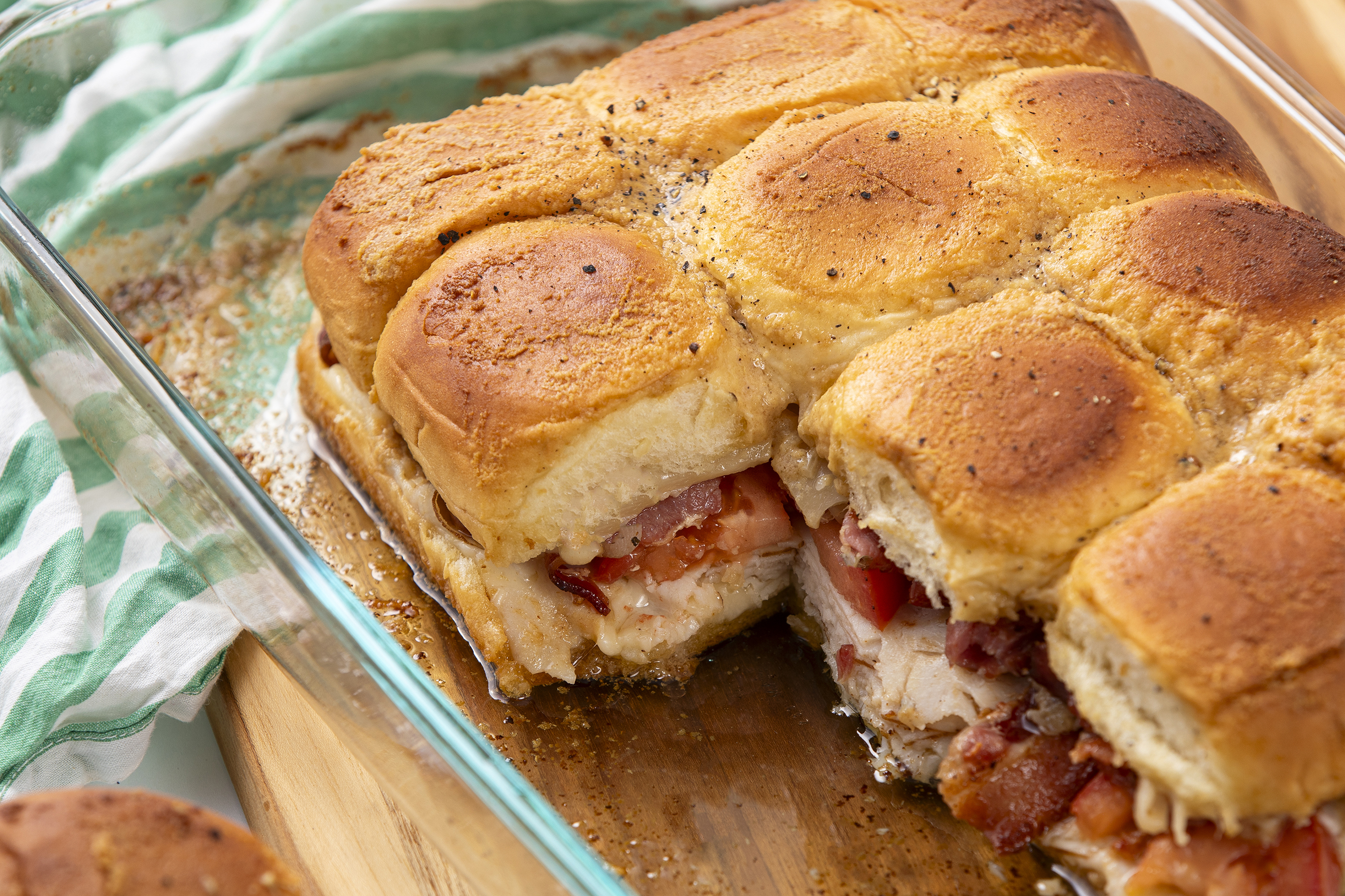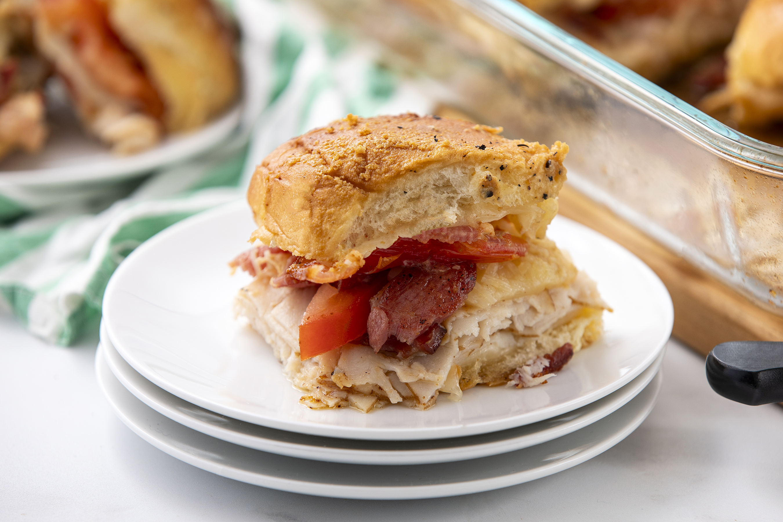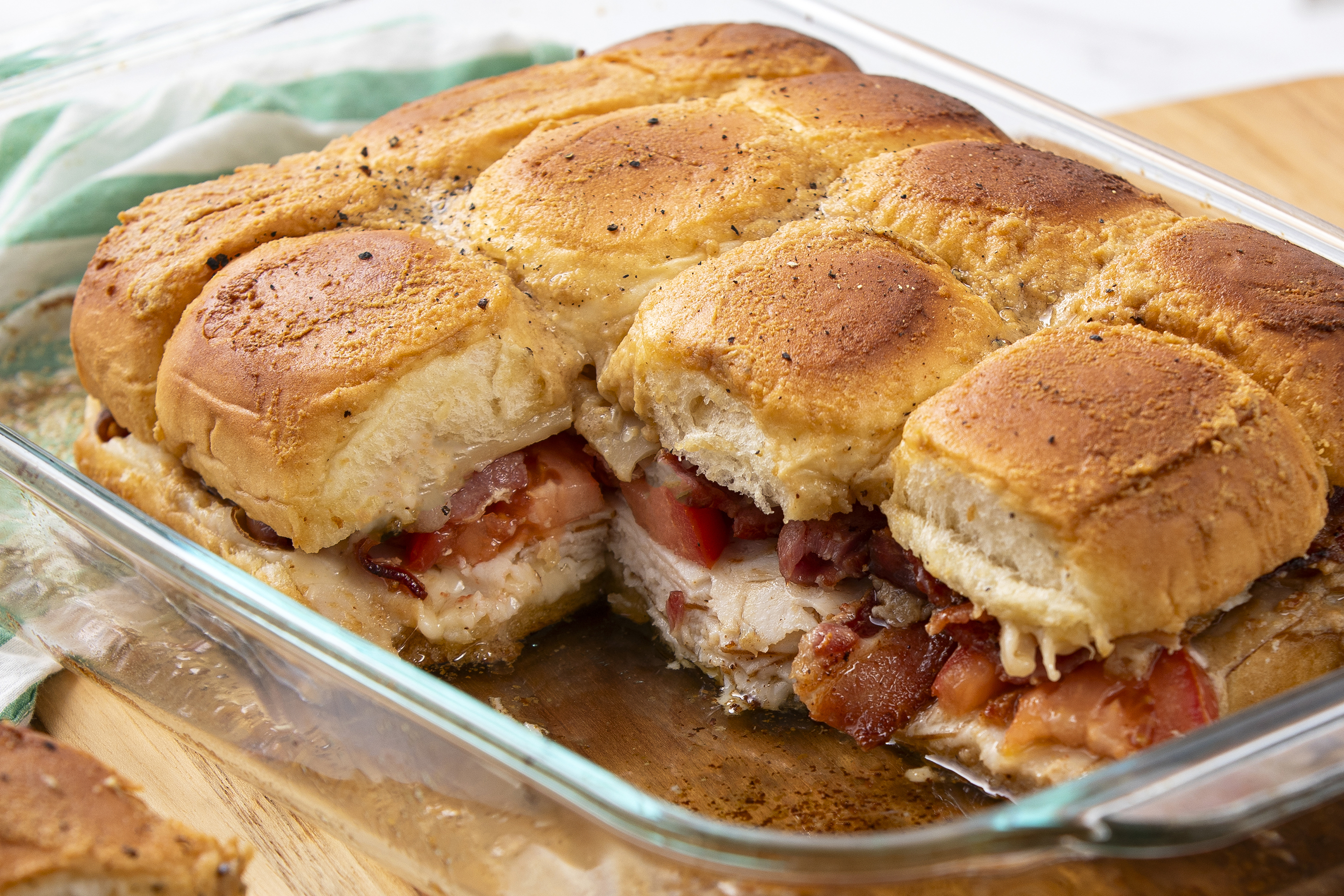 Party over here! Woot-woot! Party wherever Hot Brown Party Rolls are! Woot-woot! That's right. These little slabs of yumminess are the life of any big bash you put together. And how can you blame them? Anytime you pack some amazingly delicious Hawaiian rolls full of, well anything, they're a huge hit. But... add some melty cheese, your favorite deli turkey, crispy bacon, and juicy tomatoes, then soak them in a sweet and spicy sauce, and you've got yourself the reason why everyone always wants to come to your glorious gatherings. Baked to absolute perfection, Hot Brown Party Rolls really get your party started right!