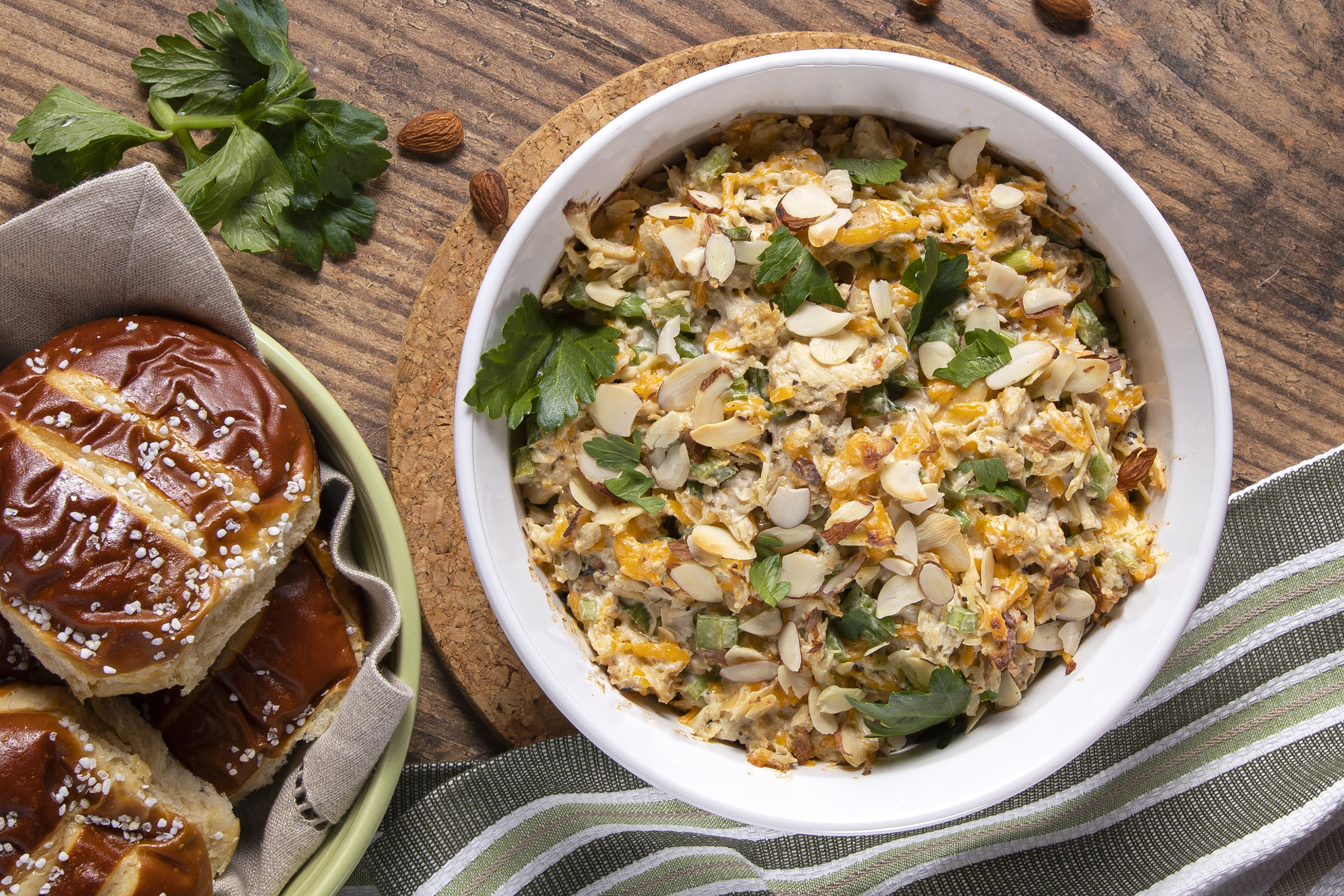 Step 3 -In a large bowl, combine the shredded chicken, the cheddar cheese, the celery, 3/4 cup of the almonds, the mayonnaise, the green onions, the sour cream, the lemon zest, the lemon juice, and the pepper.