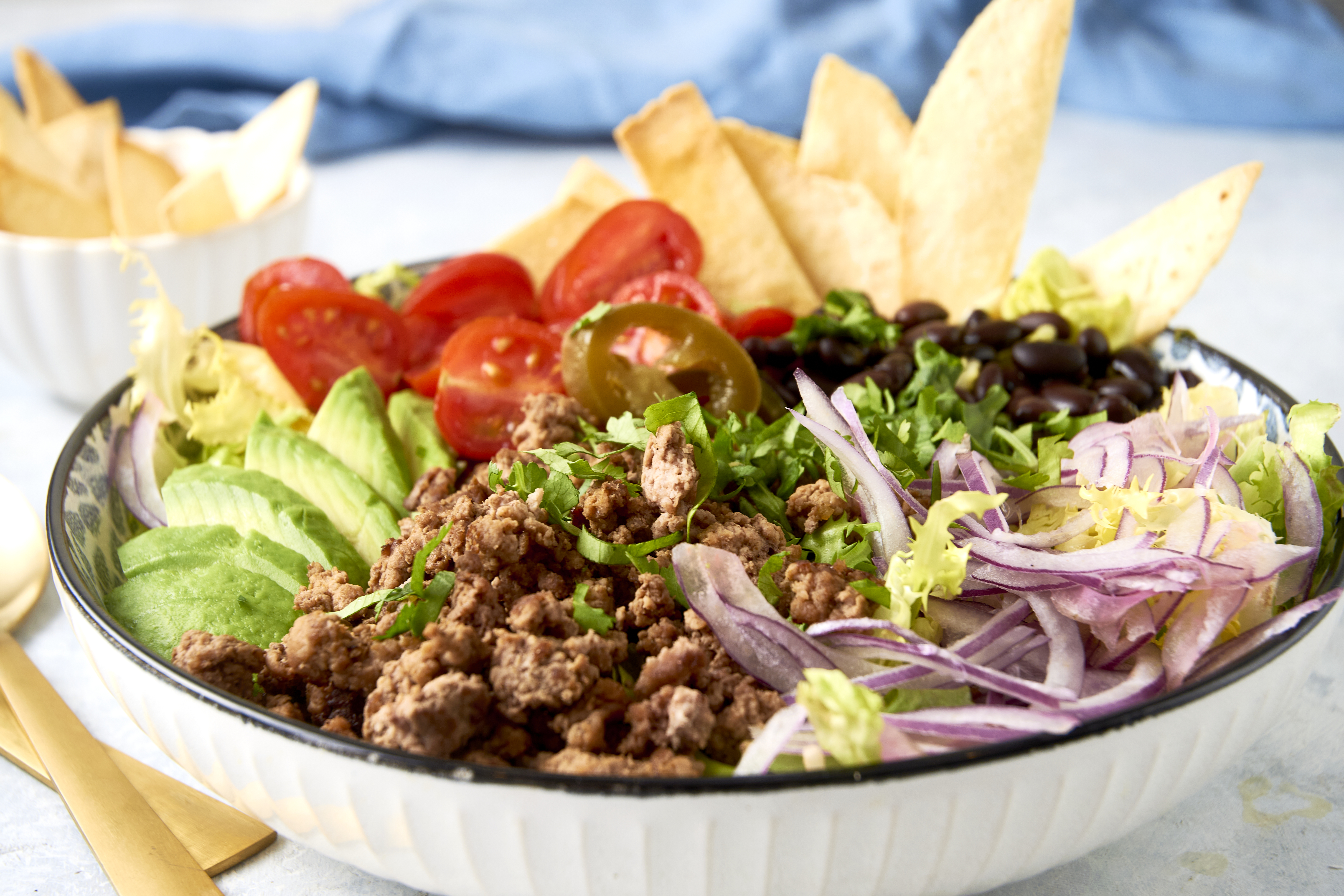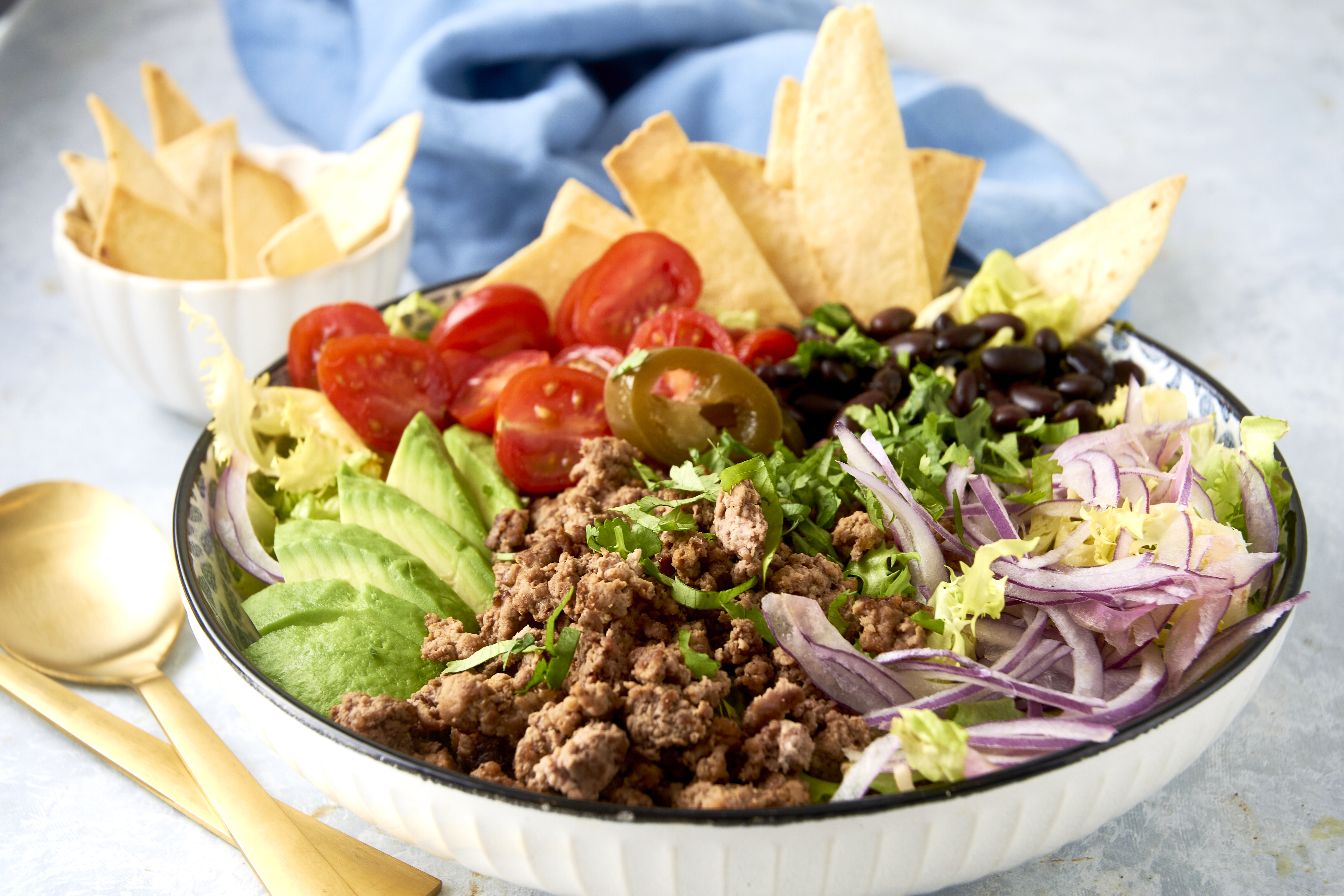 Step 7 -Top the lettuce in each serving bowl with an even amount of the beef mixture, the cheese, the tomatoes, the avocado, the onions, and the cilantro.
