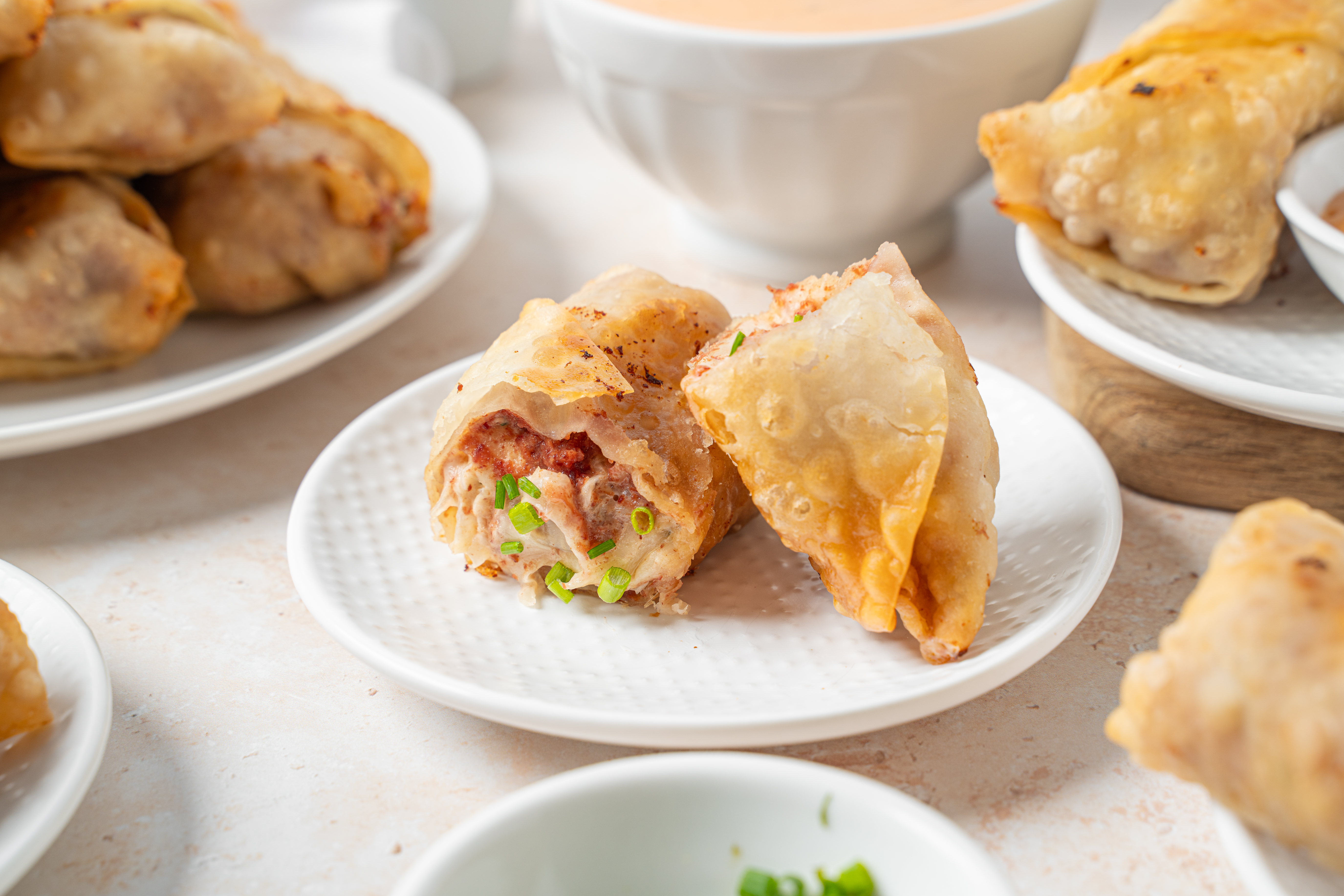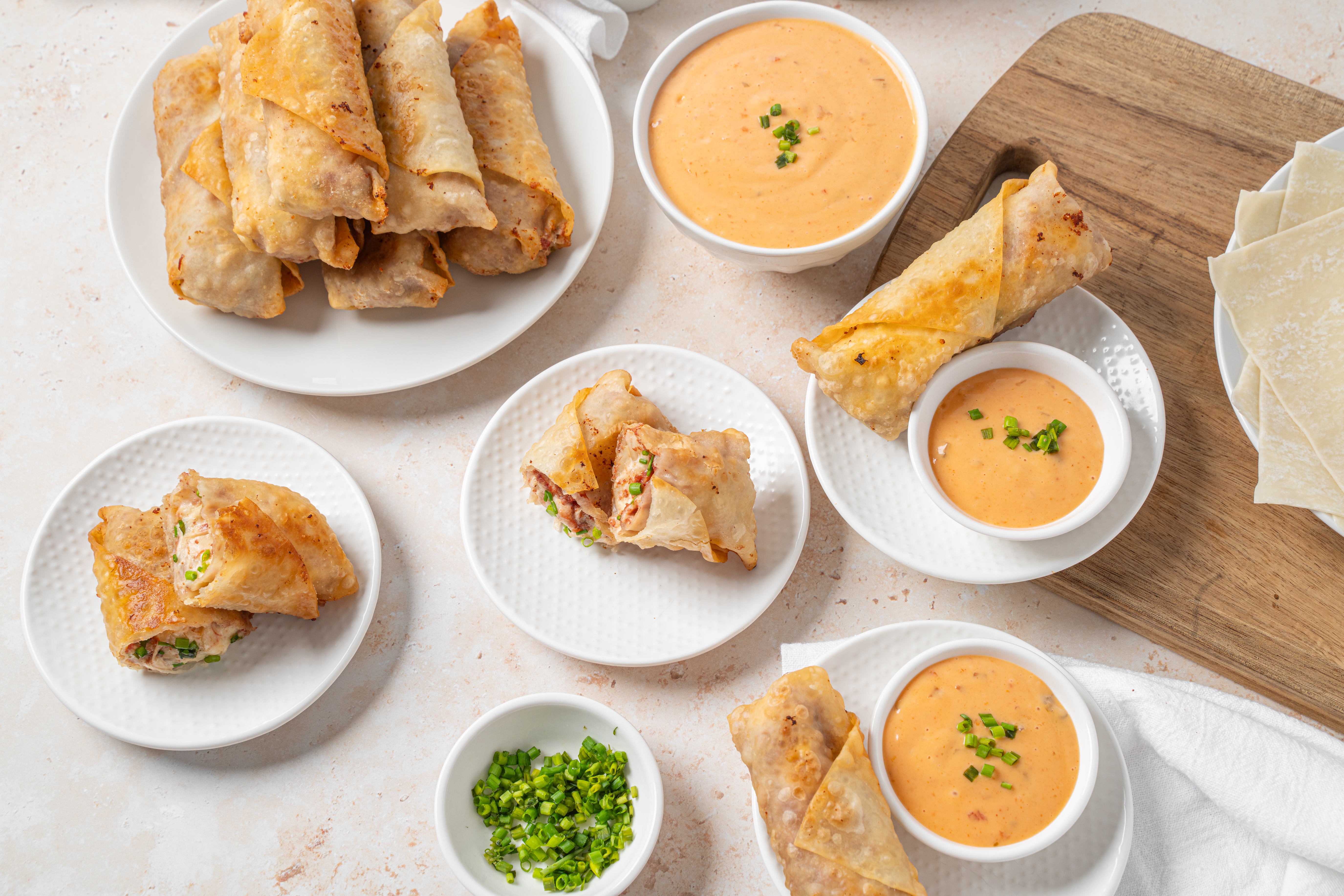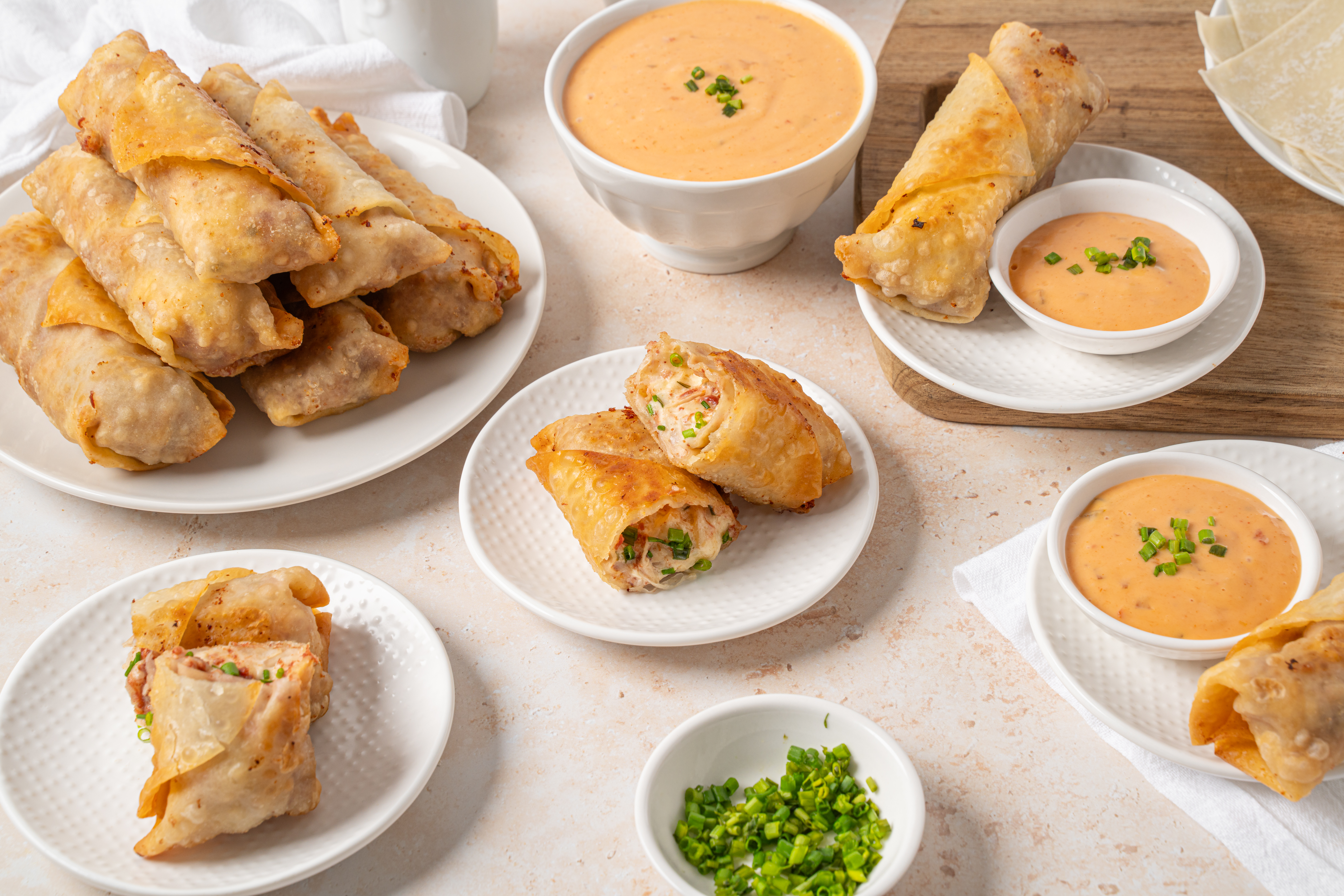 Step 9 -Serve the egg rolls warm with the extra Russian dressing and garnished with the extra chives.