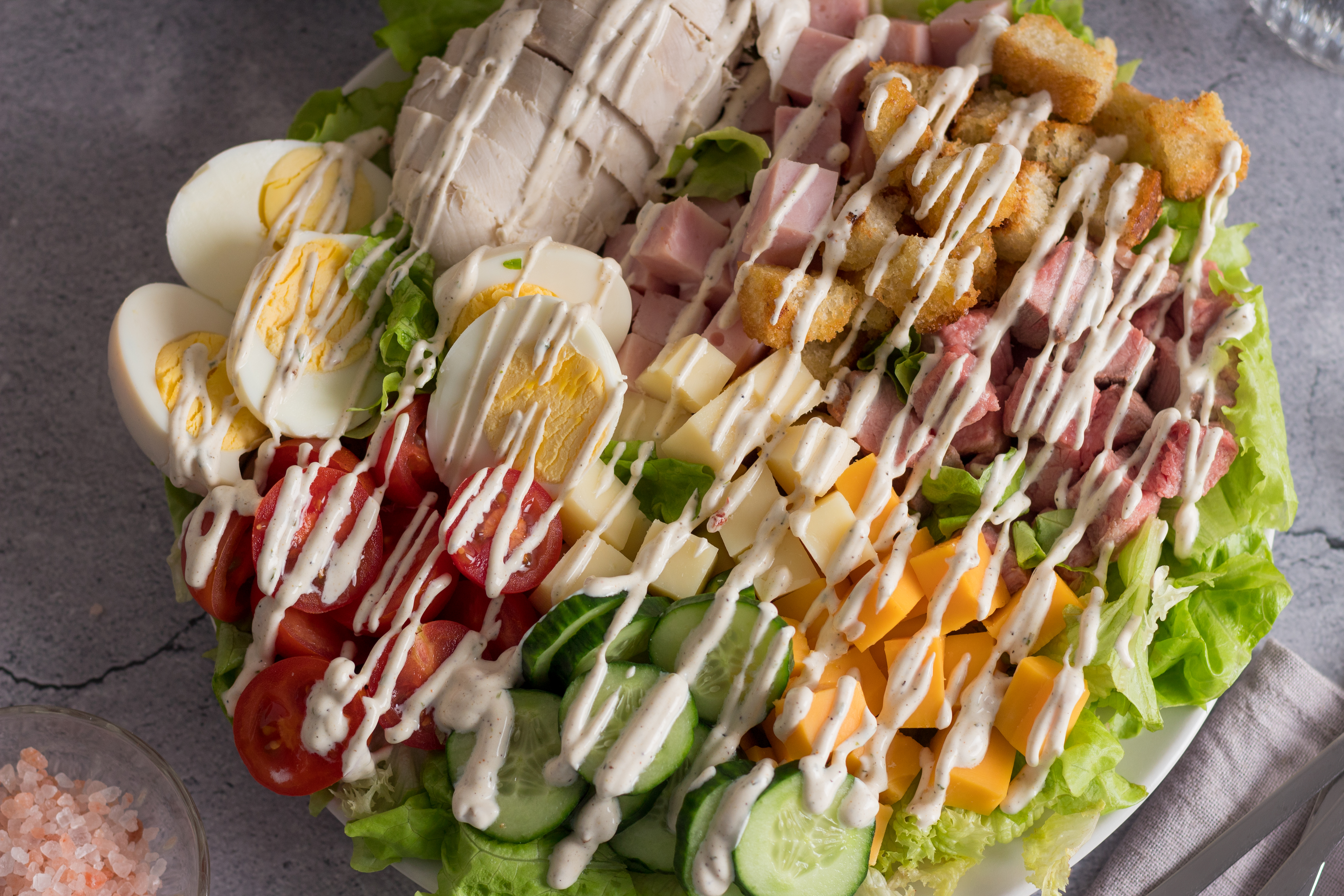 Step 4 -In a large bowl, add the lettuce and top with the seasoned hard-boiled eggs, the seasoned cherry tomatoes, the seasoned Persian cucumbers, the ham, the chicken, the roast beef, the cheddar cheese, the Swiss cheese, and the croutons.