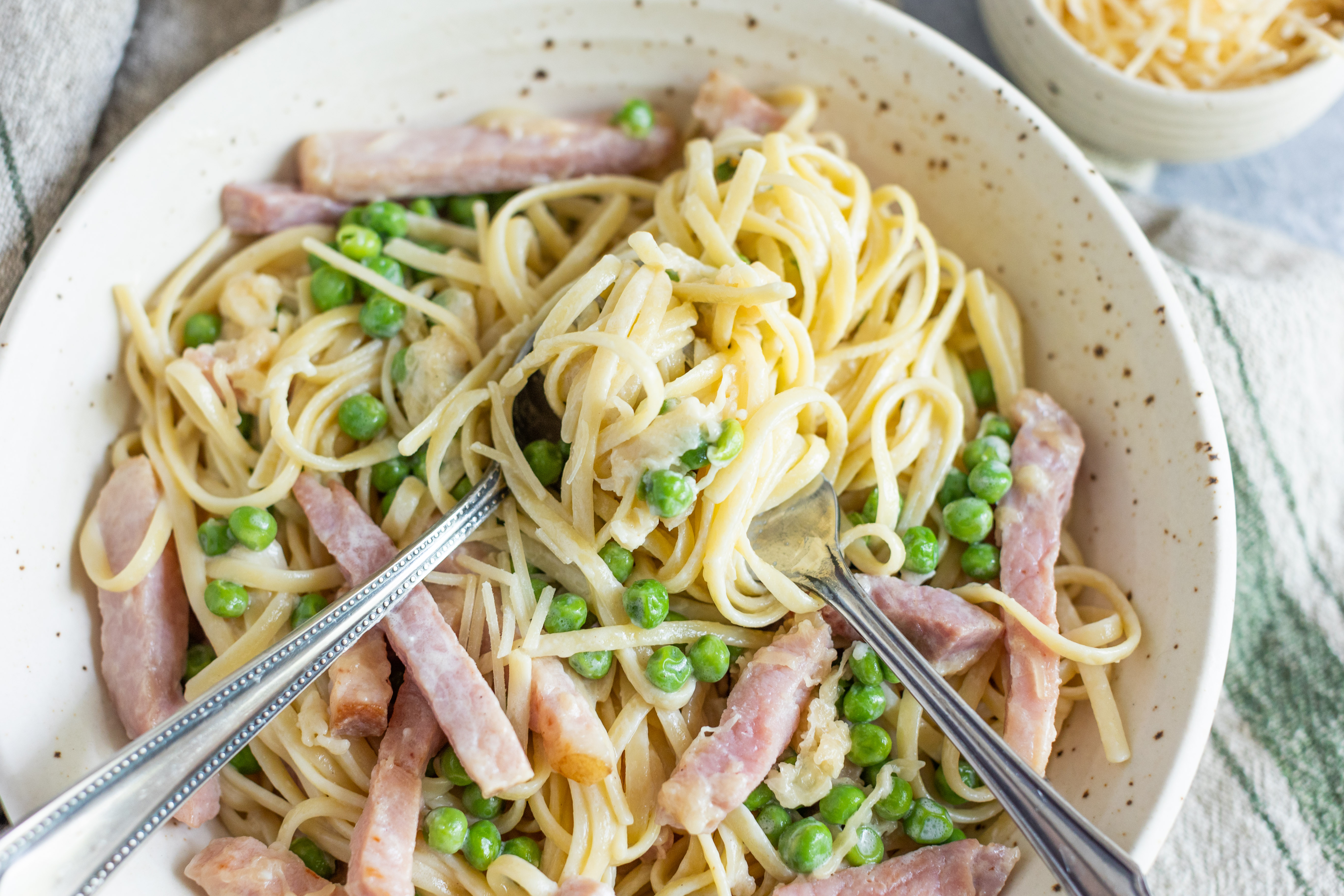 Just because something looks like something else, it doesn't mean it is. Does that make sense? You know... like as a kid when you'd look at the clouds in the sky and they'd shift and suddenly resemble some animal, like a cow or a pig. This On-the-Farm Dinner could, at first glance, be confused for looking like the hay or straw you might actually feed those very farm animals, all thanks to the shape of its tasty ingredients. With just one bite though, you'll squash any trace of confusion just as quickly as we did! The al dente linguine smothered in creamy parmesan sauce and accompanied by sweet peas and savory ham will definitely leave you feeling down-home with your people... hence the name, On-the-Farm Dinner. Give this homestyle take on linguine a try the next time you need a quick and satisfying meal after a long day of work, whether you're on the farm or in the big city!