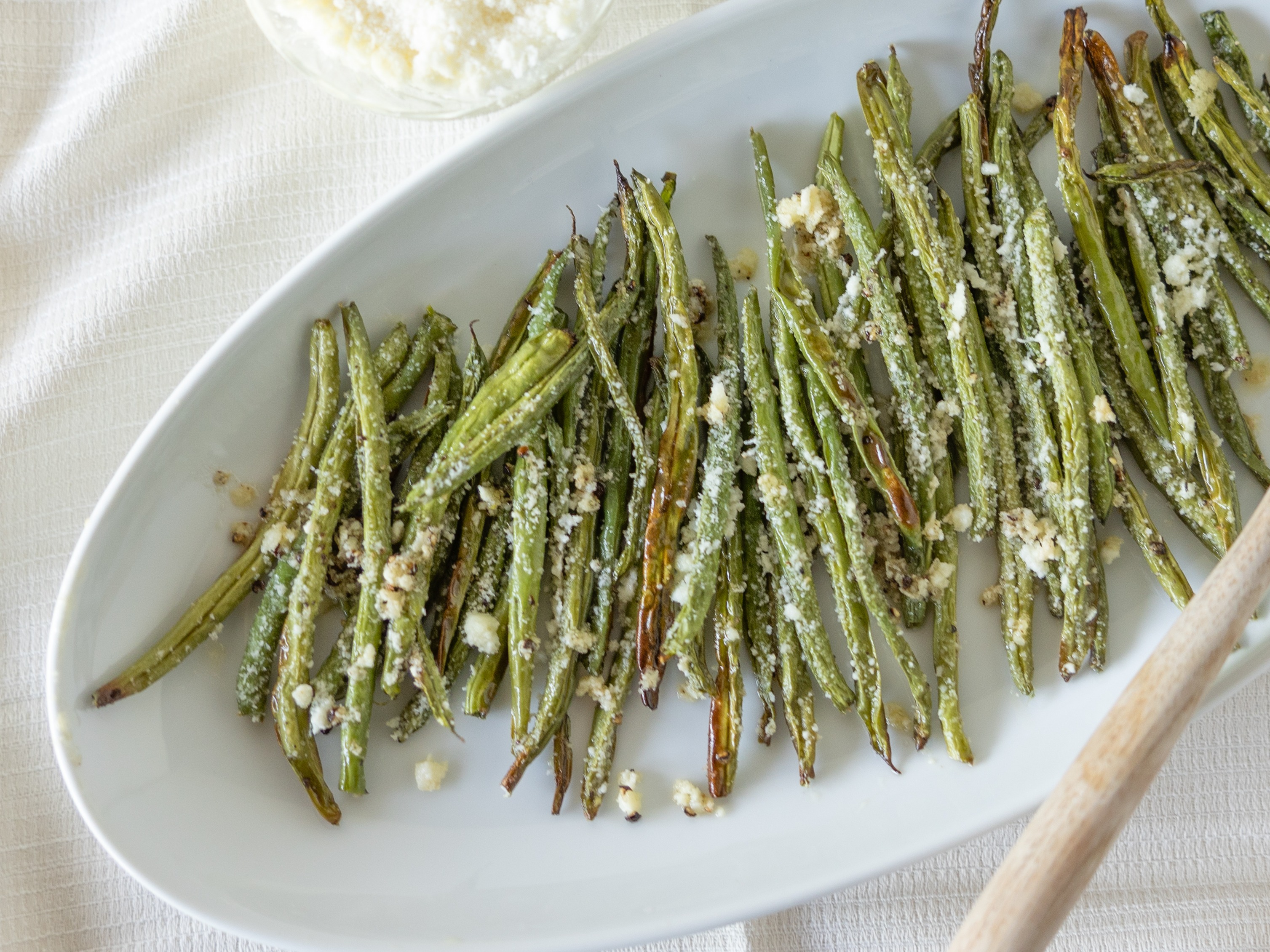 Step 5 -Transfer the baking sheet to a wire rack. Sprinkle the parmesan over the partially cooked green beans and toss until they are evenly coated.