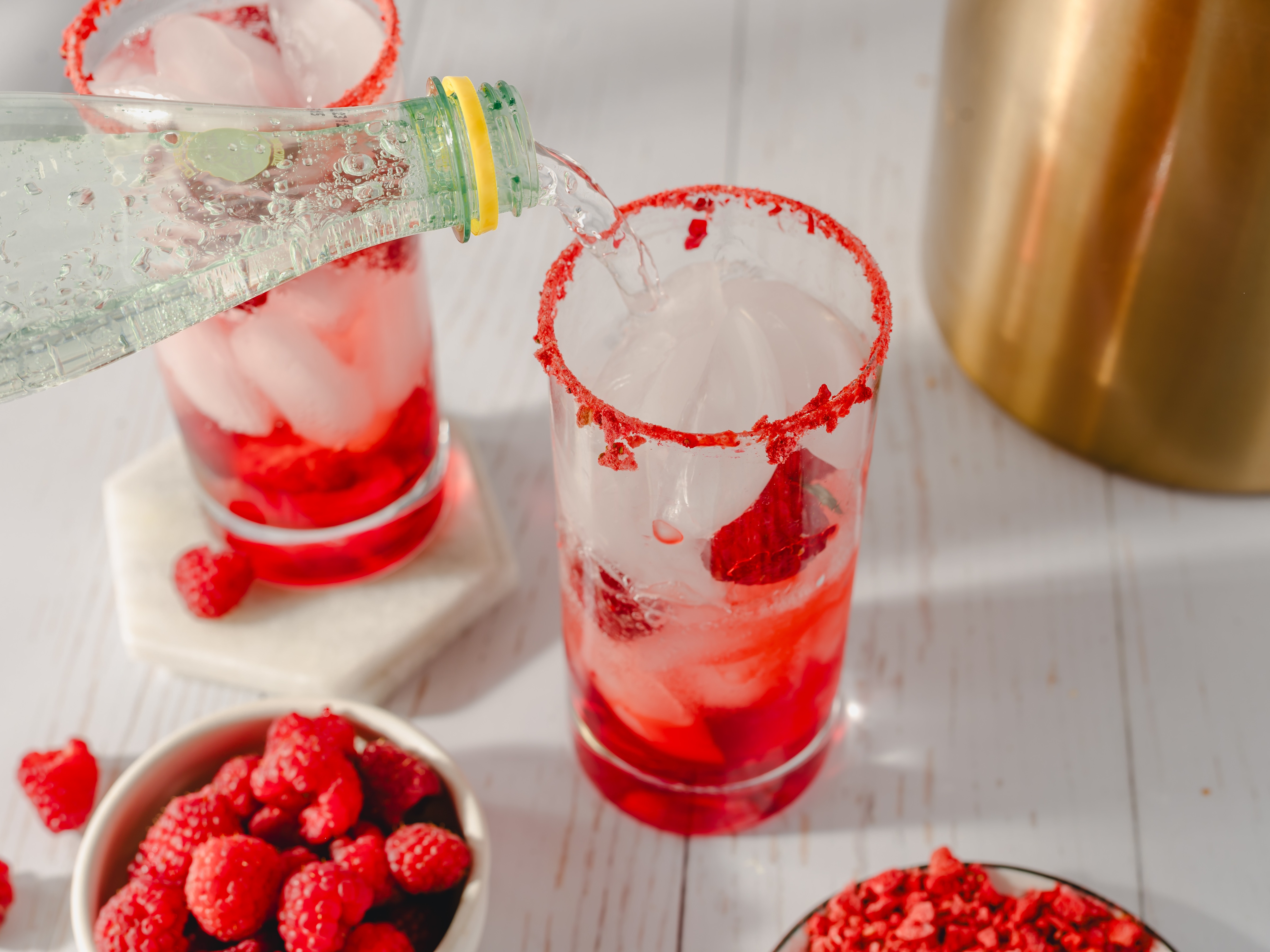 Step 7 -Evenly add the ice and the extra fresh raspberries to the prepared serving glasses, then top each with 1 cup of the sparkling water.