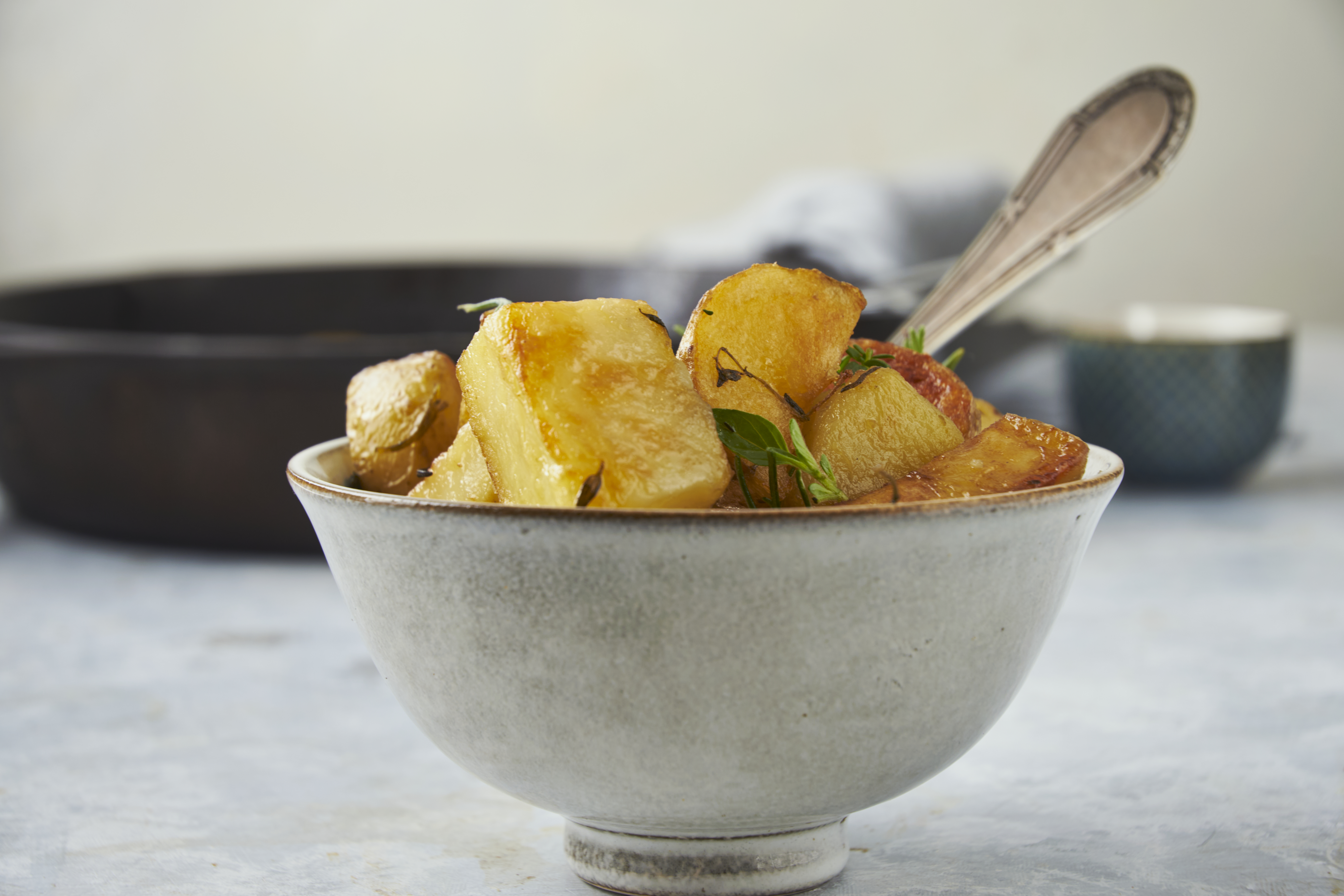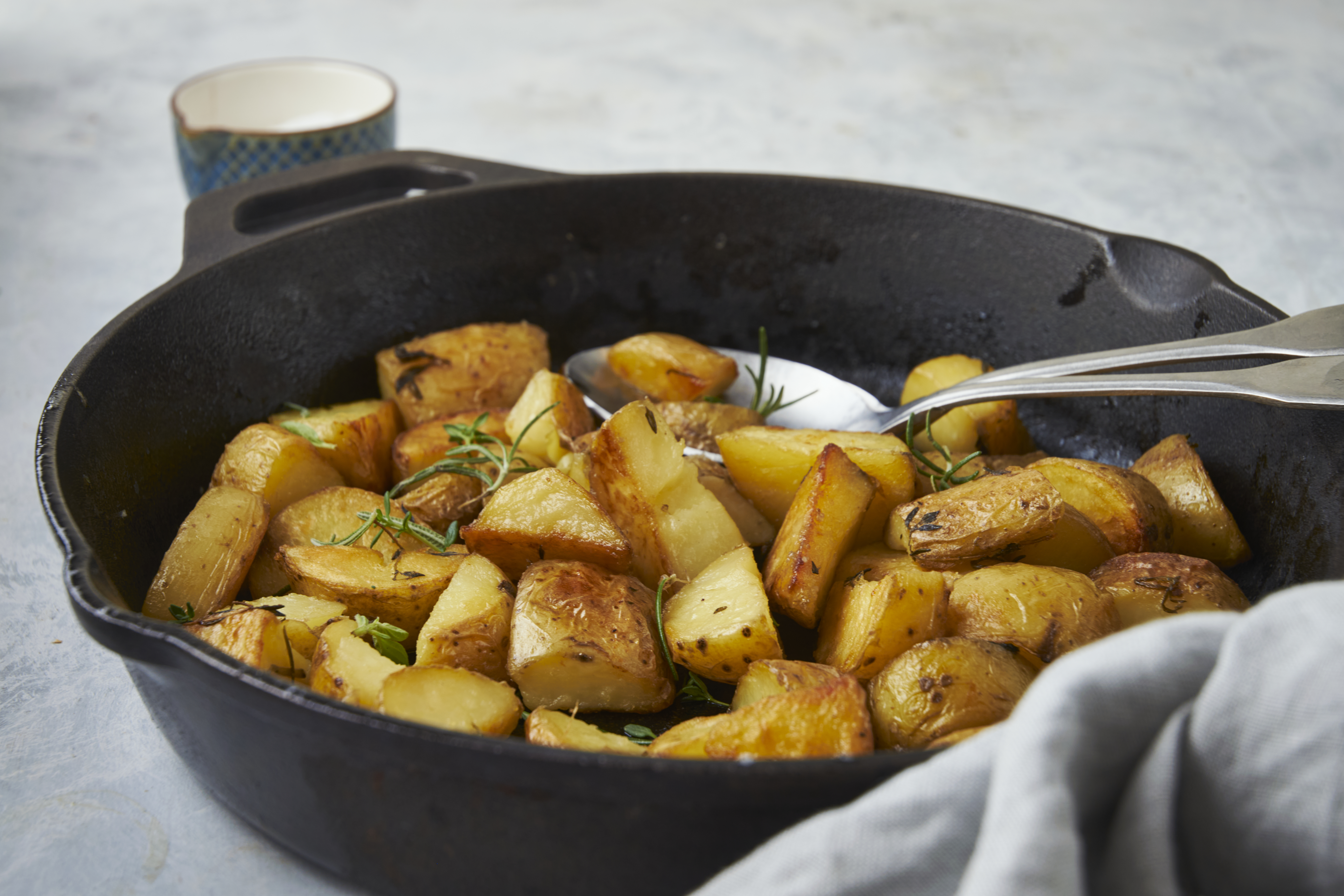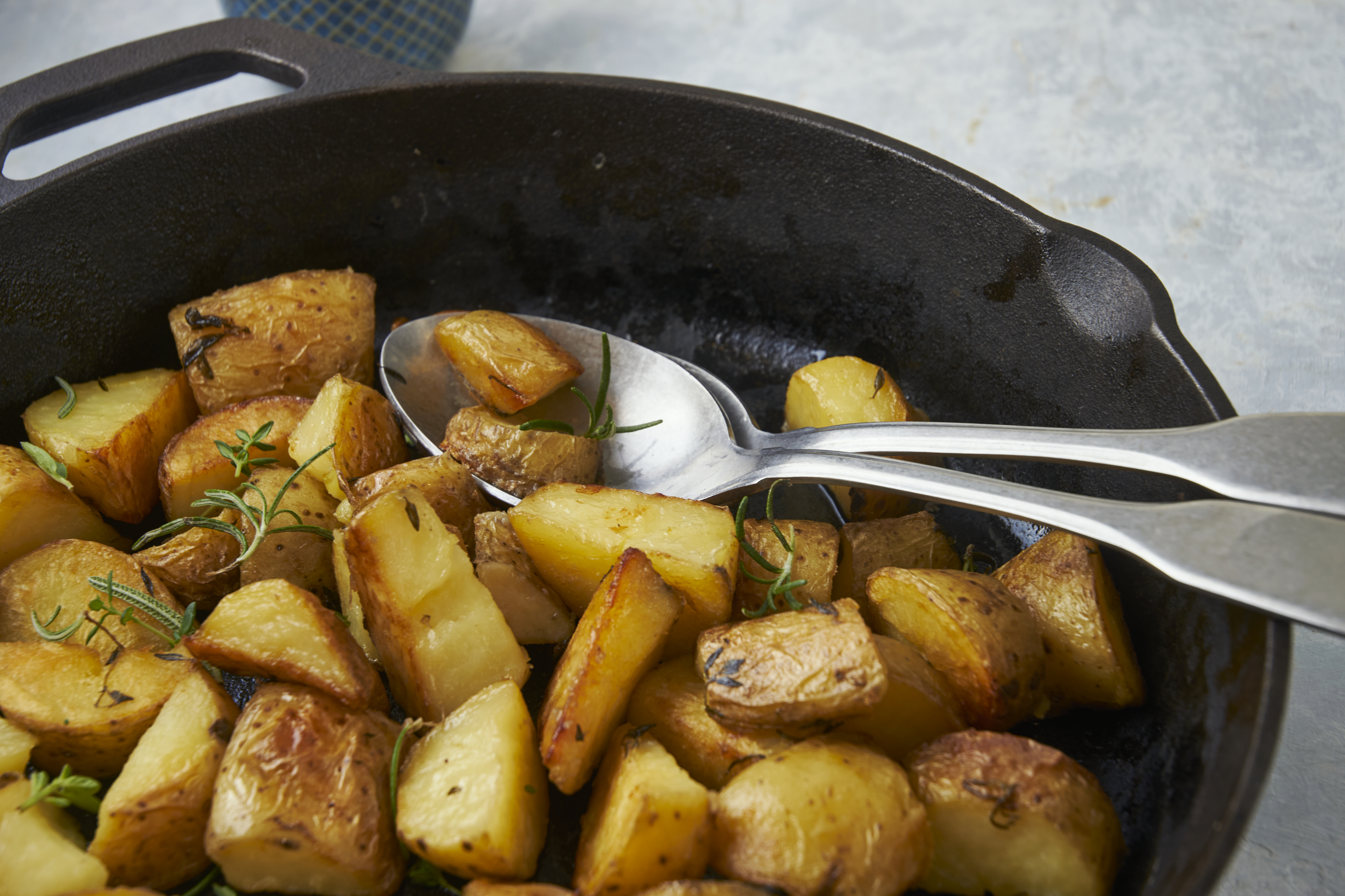 Whether it's a special occasion or you just need to perk up an otherwise regular day, these spuds are spectacular! Rosemary & Garlic Crispy Potatoes enhance any meal with the bold addition of fragrant garlic, thyme, and rosemary. Yukon Gold or red potatoes are sliced, sprinkled with those splendid seasonings, and then fried to a crispy, golden-brown. So easy, yet so over-the-top delicious, Rosemary & Garlic Crispy Potatoes are unmatched with great flavor. You just gotta get some!
