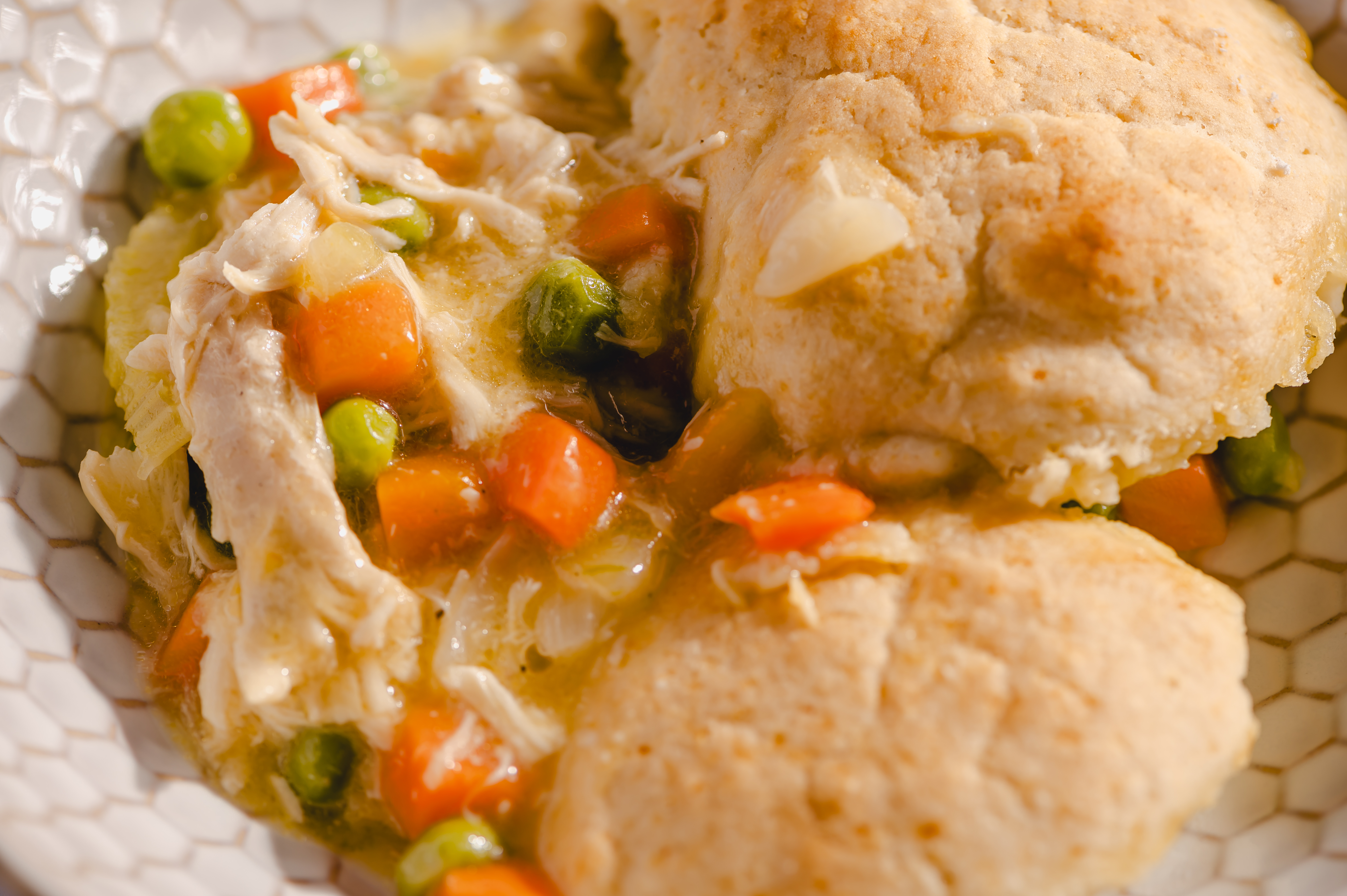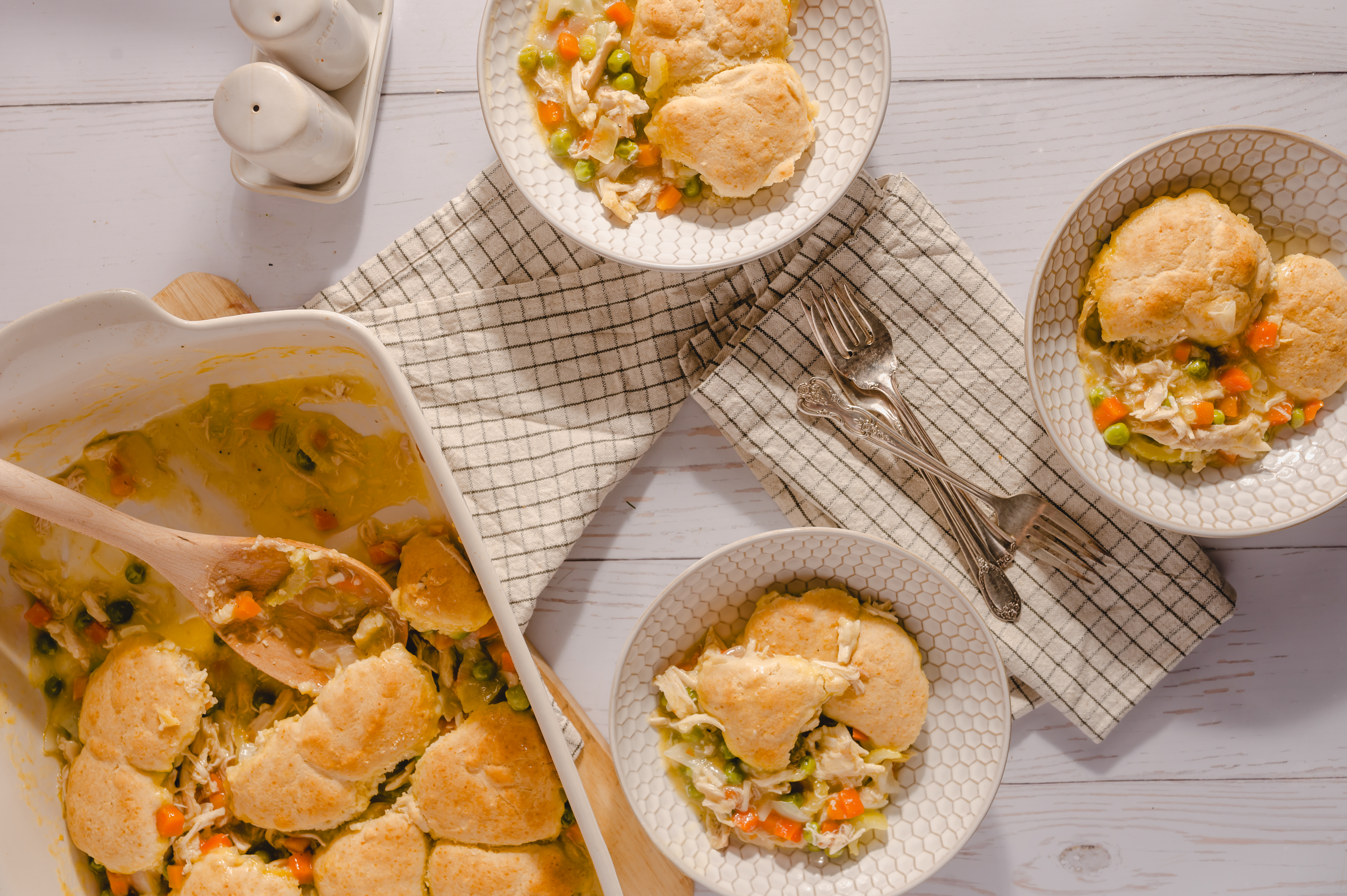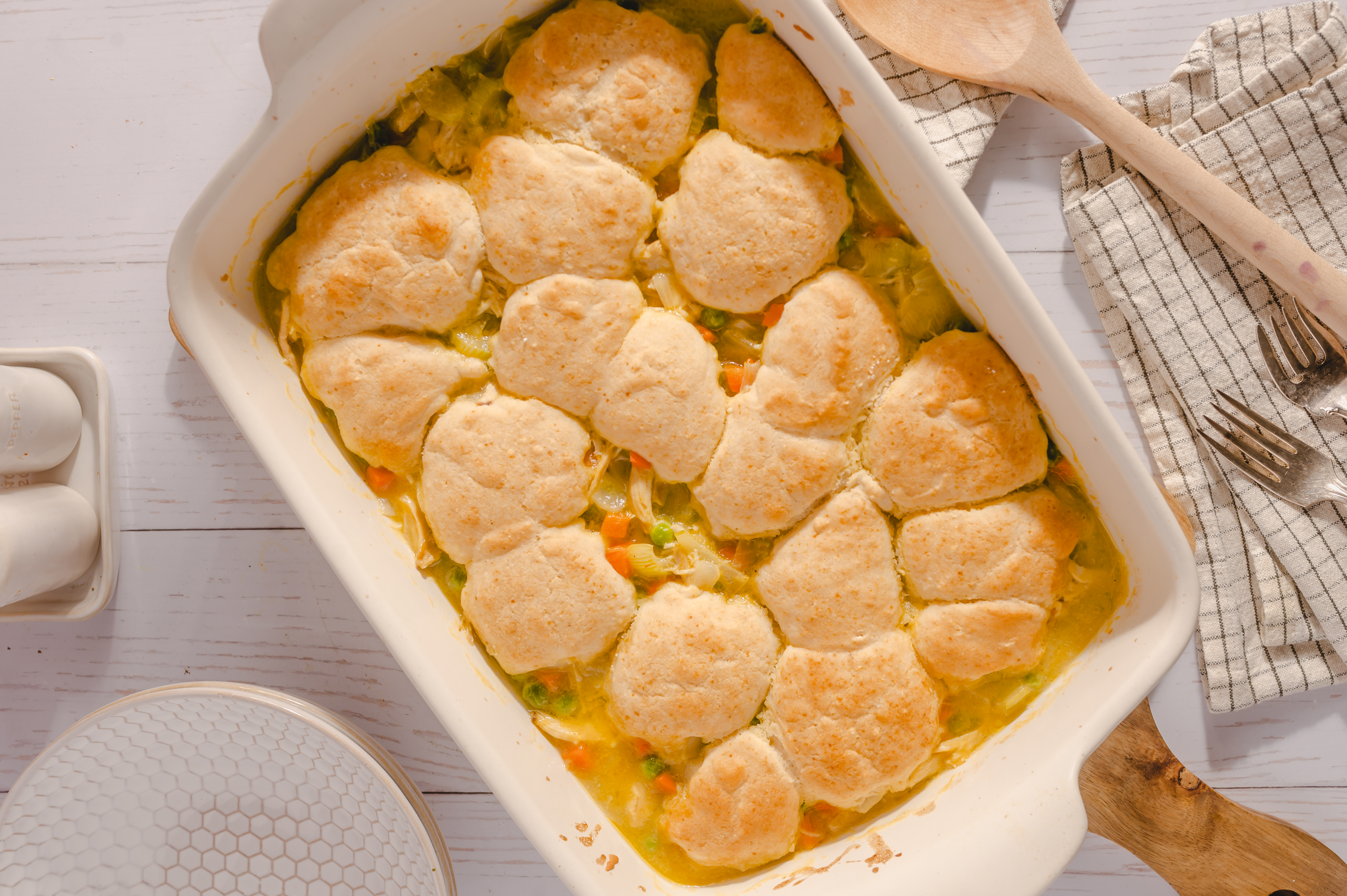 Rotisserie Chicken & Dumpling Bake is the casserole form of a beloved soup. And what's not to love? Juicy, tender chicken in a creamy, savory sauce with ultra-tender, golden dumplings on top cannot be denied as something wholesome and just so yummy. Rotisserie Chicken & Dumpling Bake is totally satisfying and simple to make... and it tends to disappear in a flash!