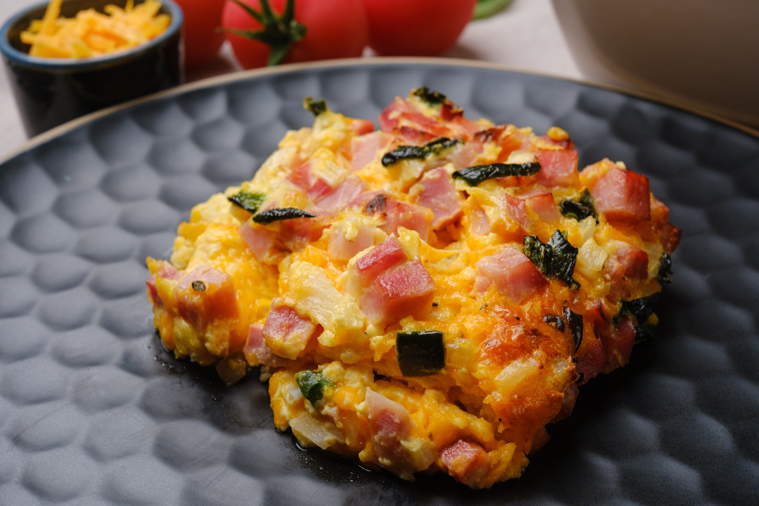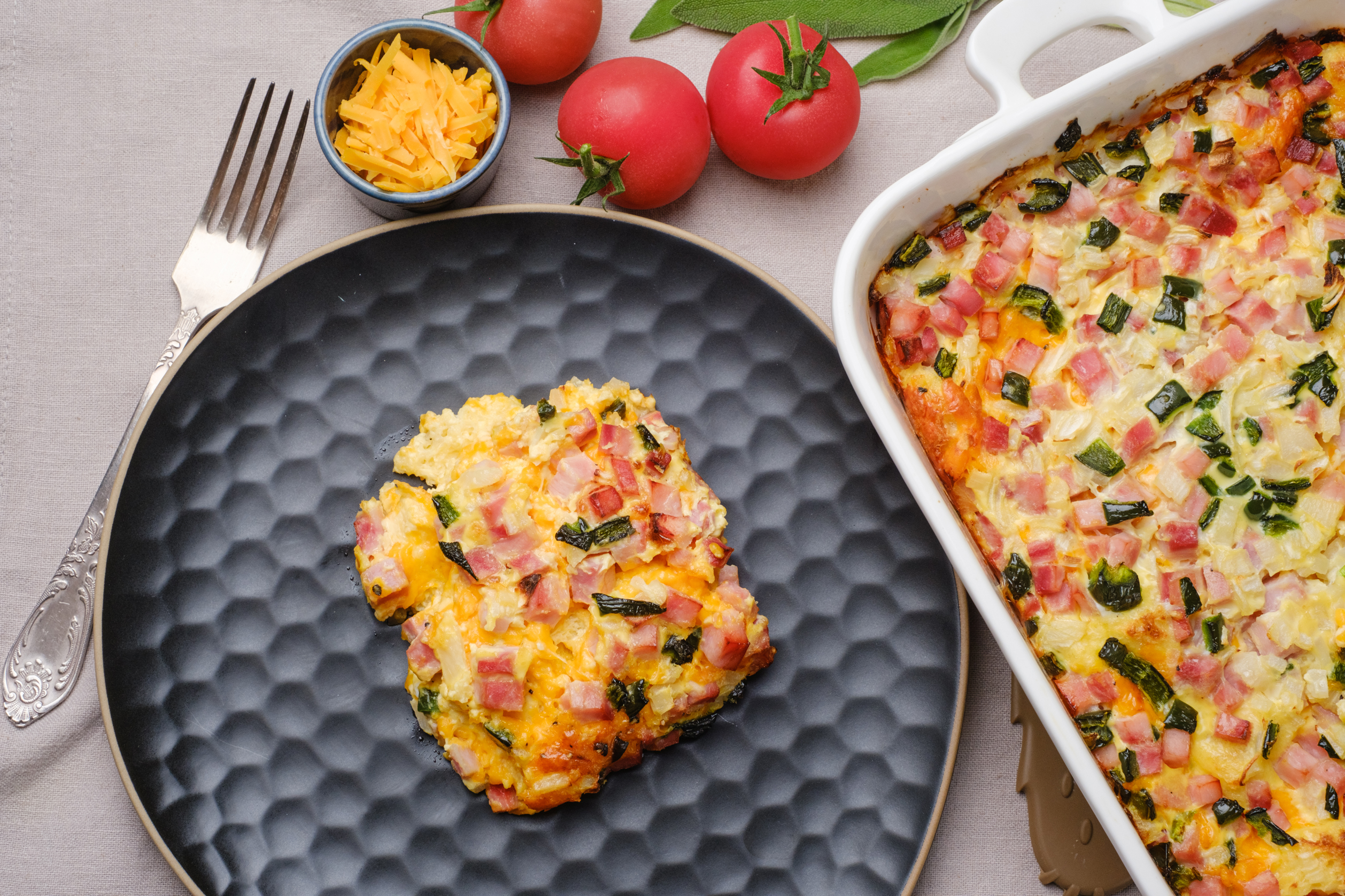 Hold on tight, your morning meal is about to go for a delicious trot! This Saddle-Up Breakfast Bake brings you along for a tasty ride, packing all the yumminess and heartiness you need in one dish to ensure a great day ahead! Melty cheese, salty ham, fresh veggies, fluffy eggs... after one bite, you won't be able to bridle your excitement. So, go ahead! Chow down on some Saddle-Up Breakfast Bake and ride off into the sunrise. It's going to be a giddy-up good one!