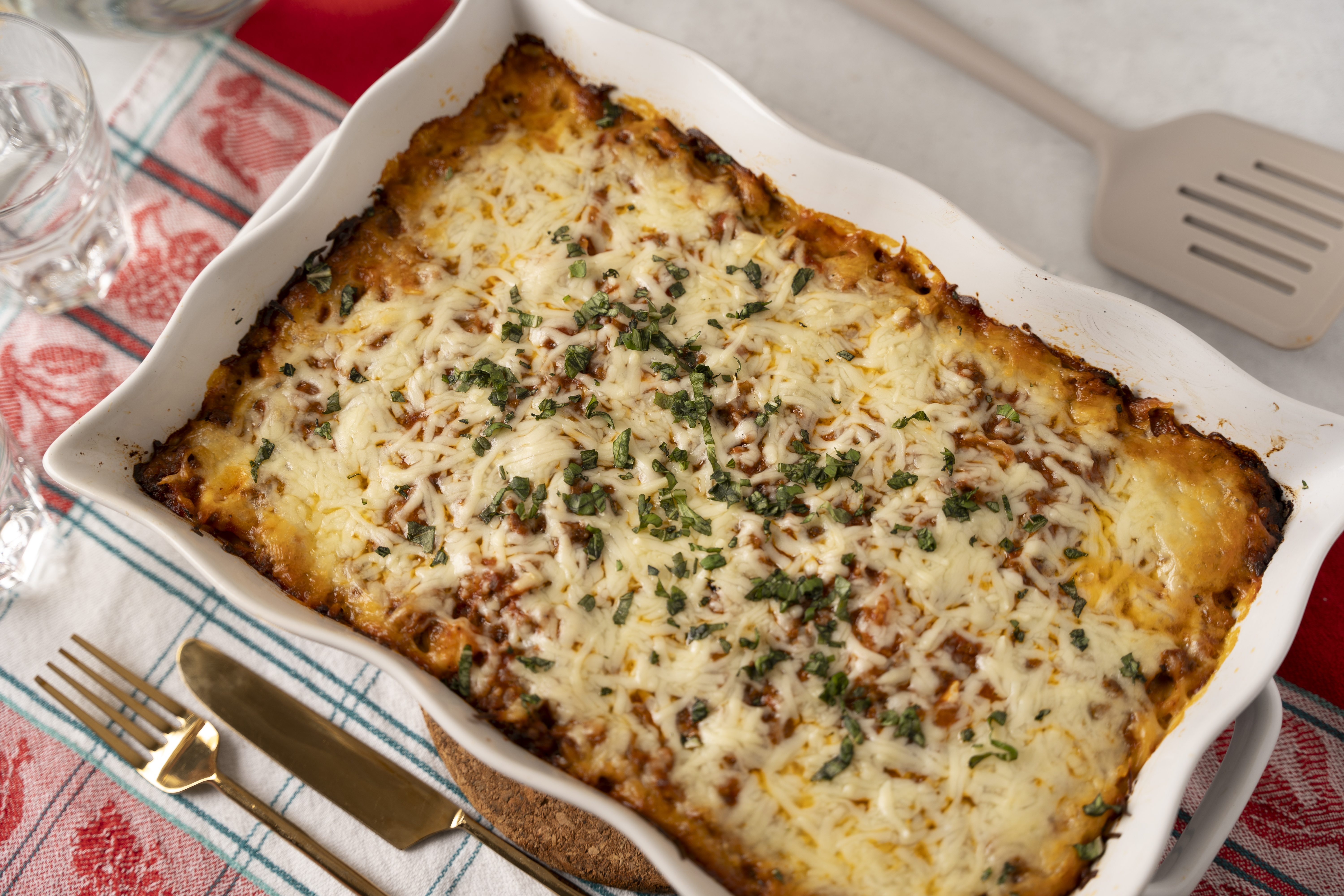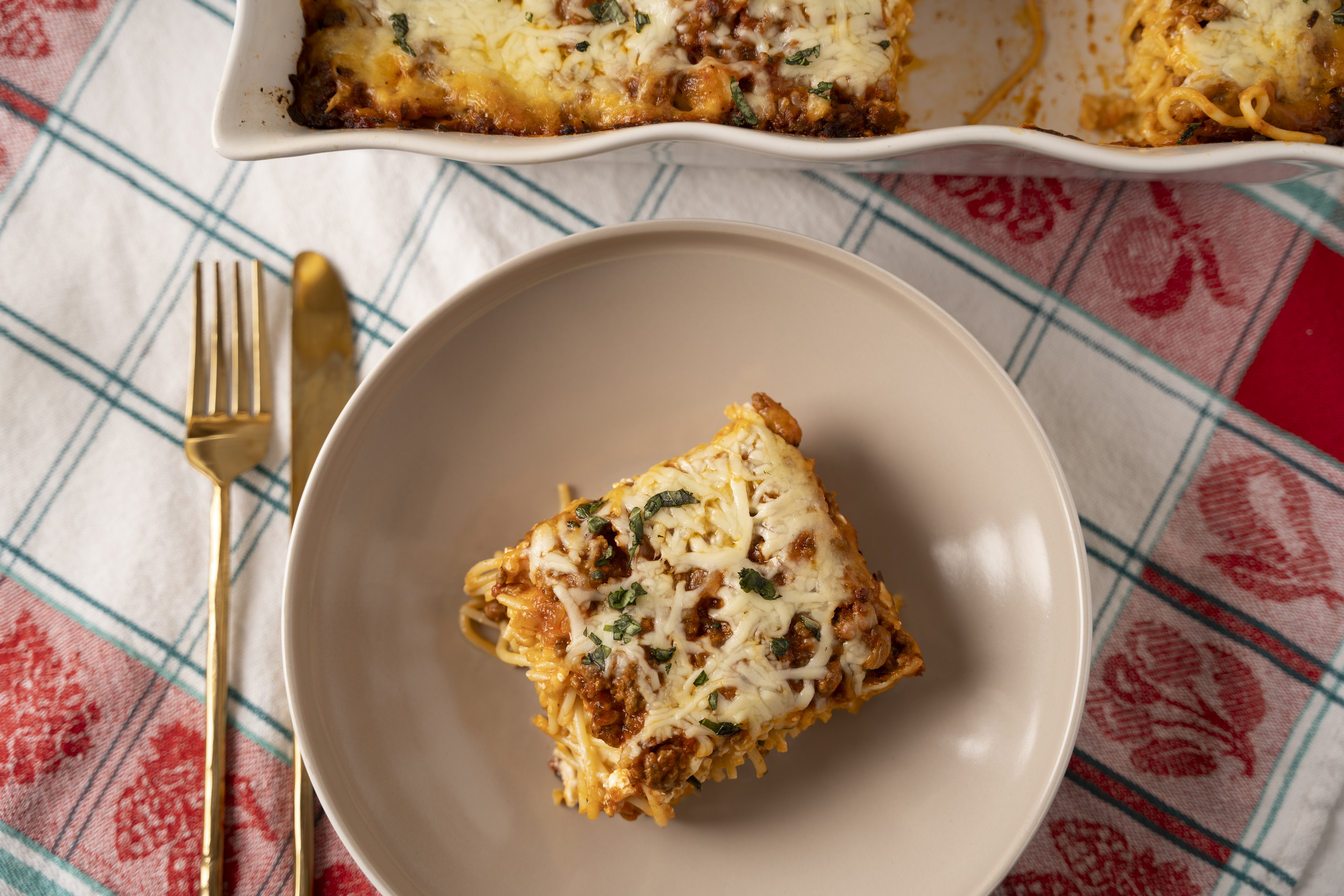 Staying in on a Saturday night is so underrated! Why go out into the noisy, chaotic, unknown when you could be snuggled up in your jammies on your comfy couch? How appetizing?! Speaking of hunger, while you're cozy in your cottage, you could also be chowing down on some Saturday Night Spaghetti Bake! See?! It was literally made for this exact moment! Think of it like Friday's meaty and saucy lasagna, but just swap out those big, floppy noodles for some petite and bouncy spaghetti instead. It's so good and the perfect way to spend your weekend. Just do it! Stay home and enjoy Saturday Night Spaghetti Bake in peace and quiet. You know you wanna!