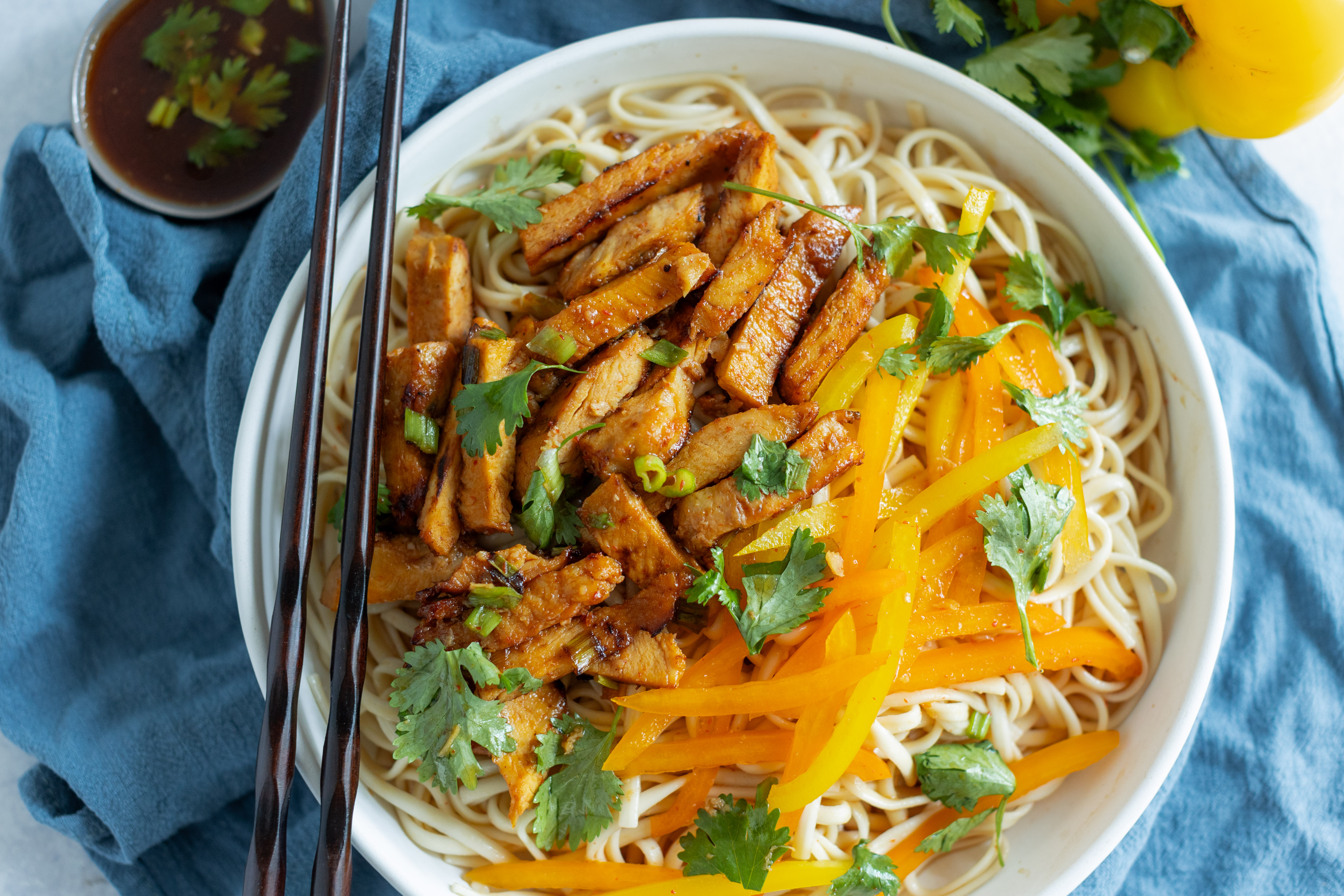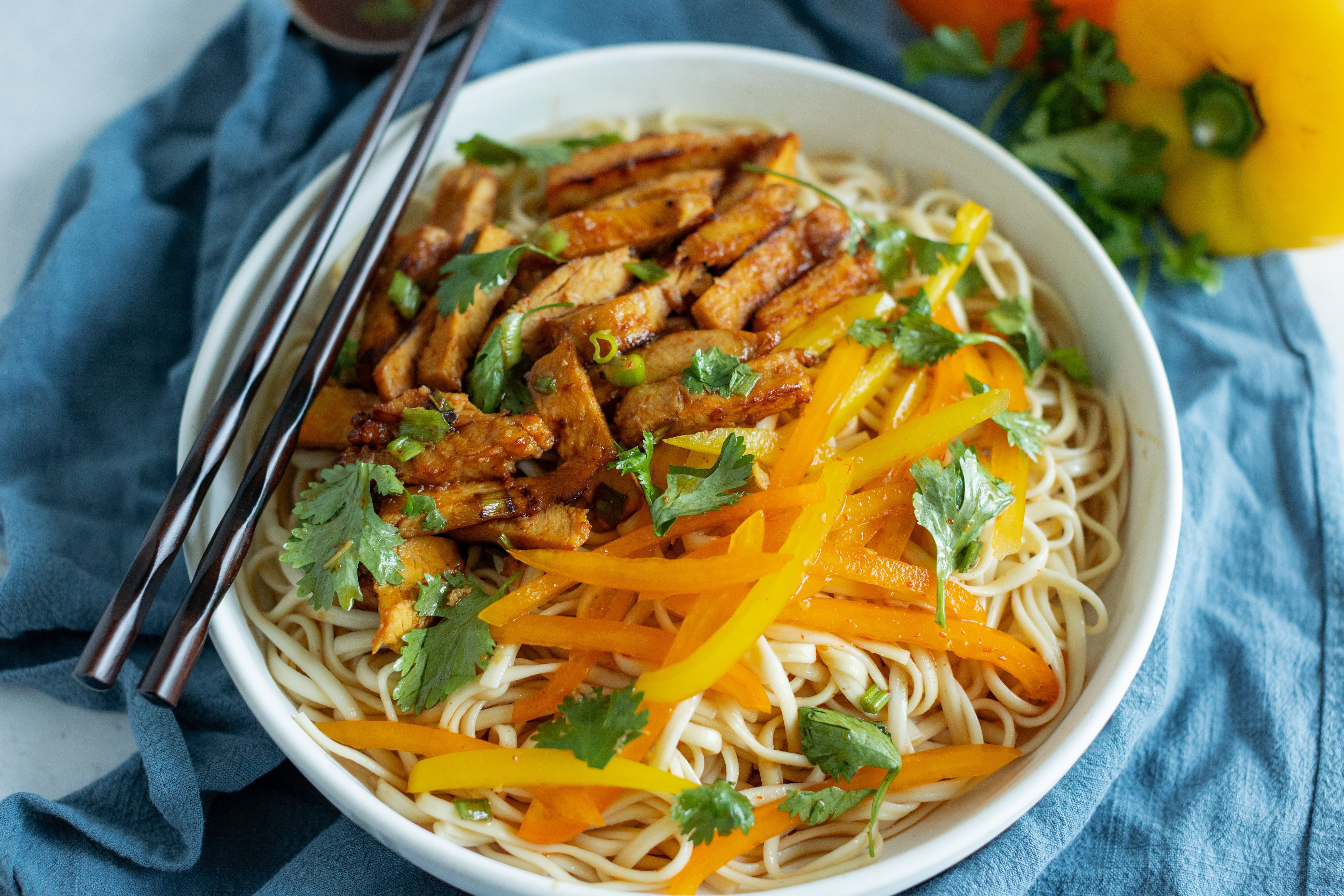 Step 9 -Top the chicken and the noodles with the peppers and the cilantro and serve.