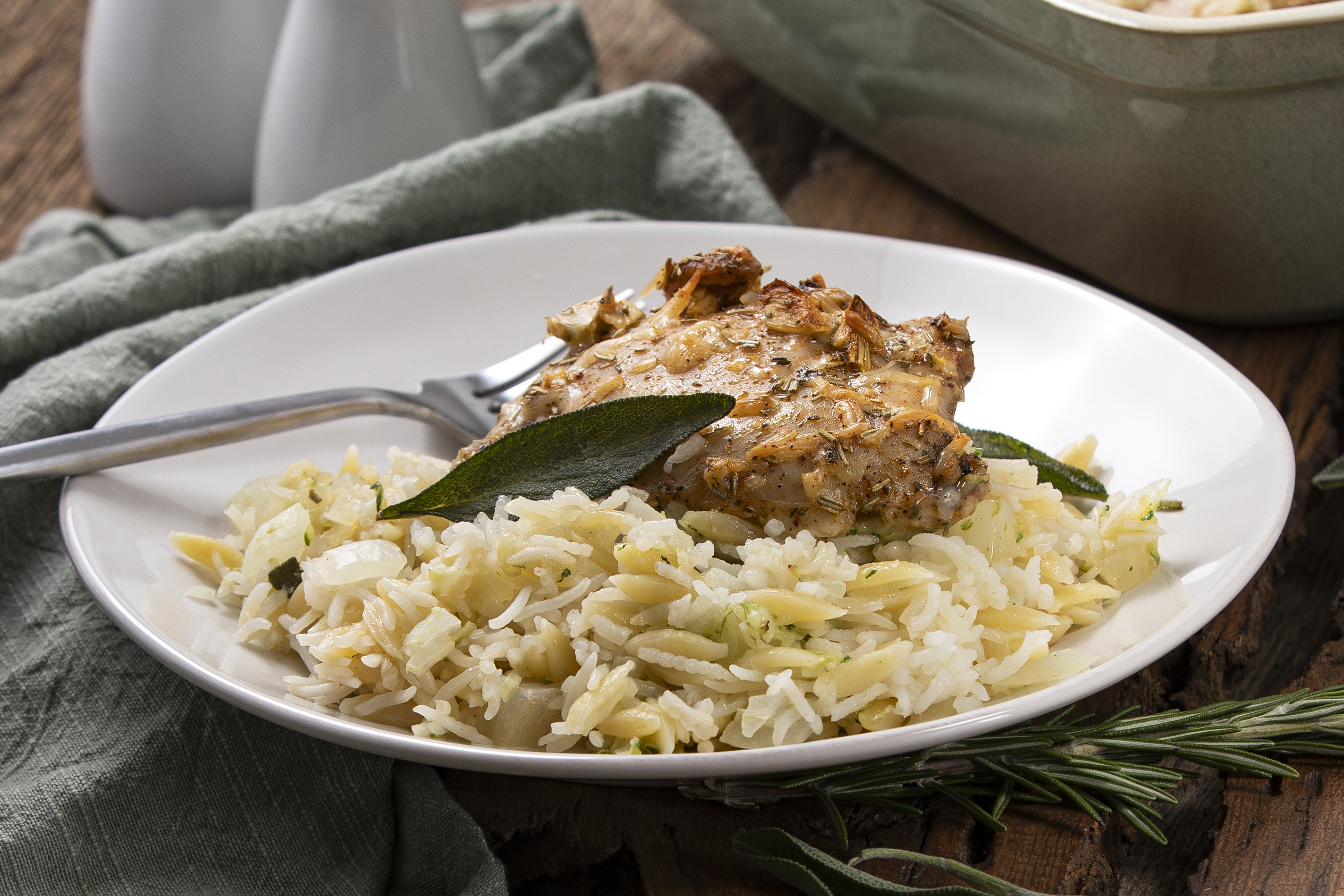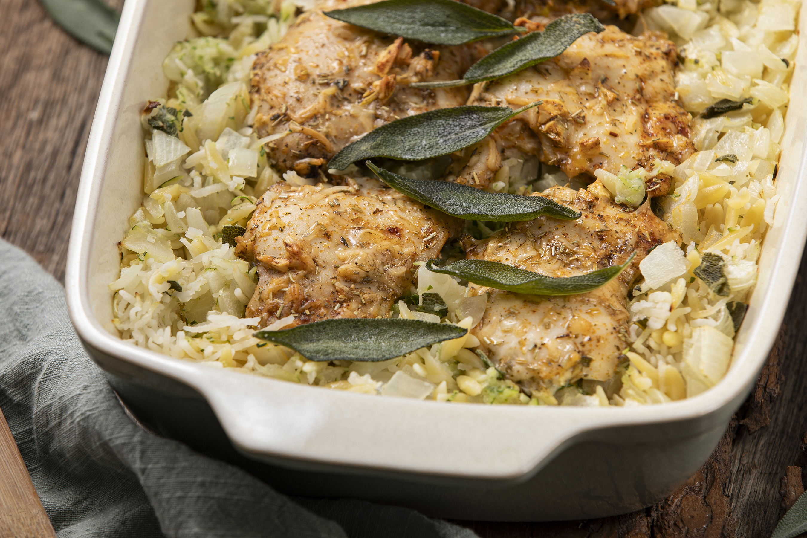 Step 4 -Pour the rice, the orzo, the onion, the zucchini, and 1 tablespoon of the chopped sage into the prepared baking dish.