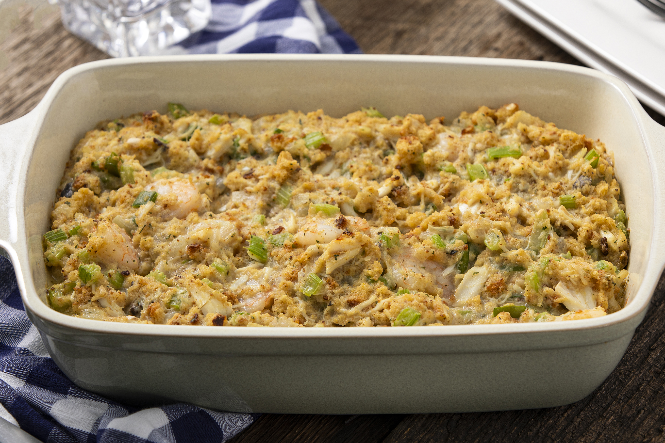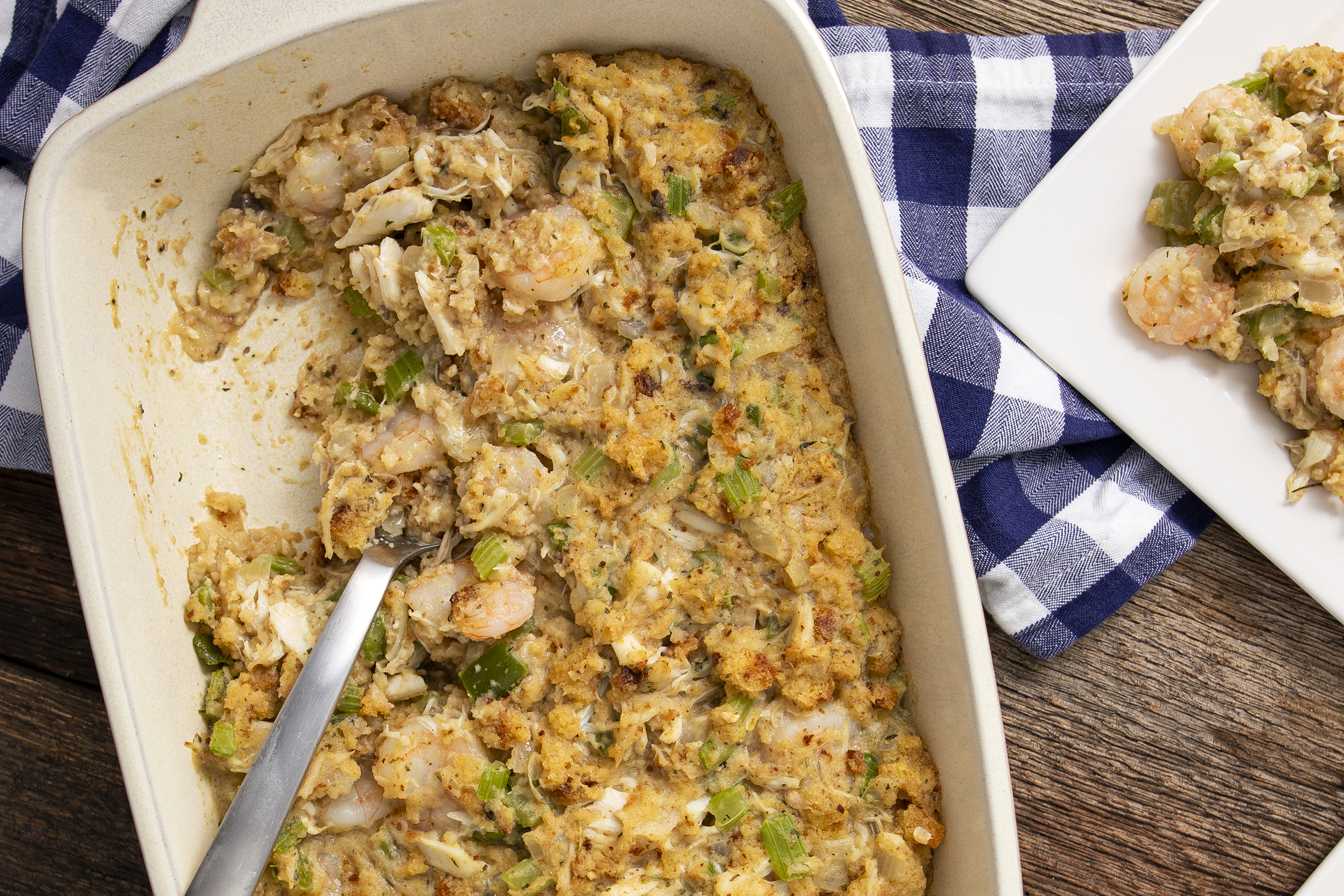 It might not be a white Christmas everywhere in the U.S. (hard to get snow in warmer climates) but it can be a festive and merry Christmas everywhere with Southern Christmas Seafood Stuffing on the table! Sweet and savory crabmeat is butter-seared with fresh vegetables and then combined with comforting cornbread, umami-packed cream of mushroom soup, and succulent chicken broth for a hearty, warming, and welcoming side dish! Southern Christmas Seafood Stuffing brings holiday happiness to all climates and regions!