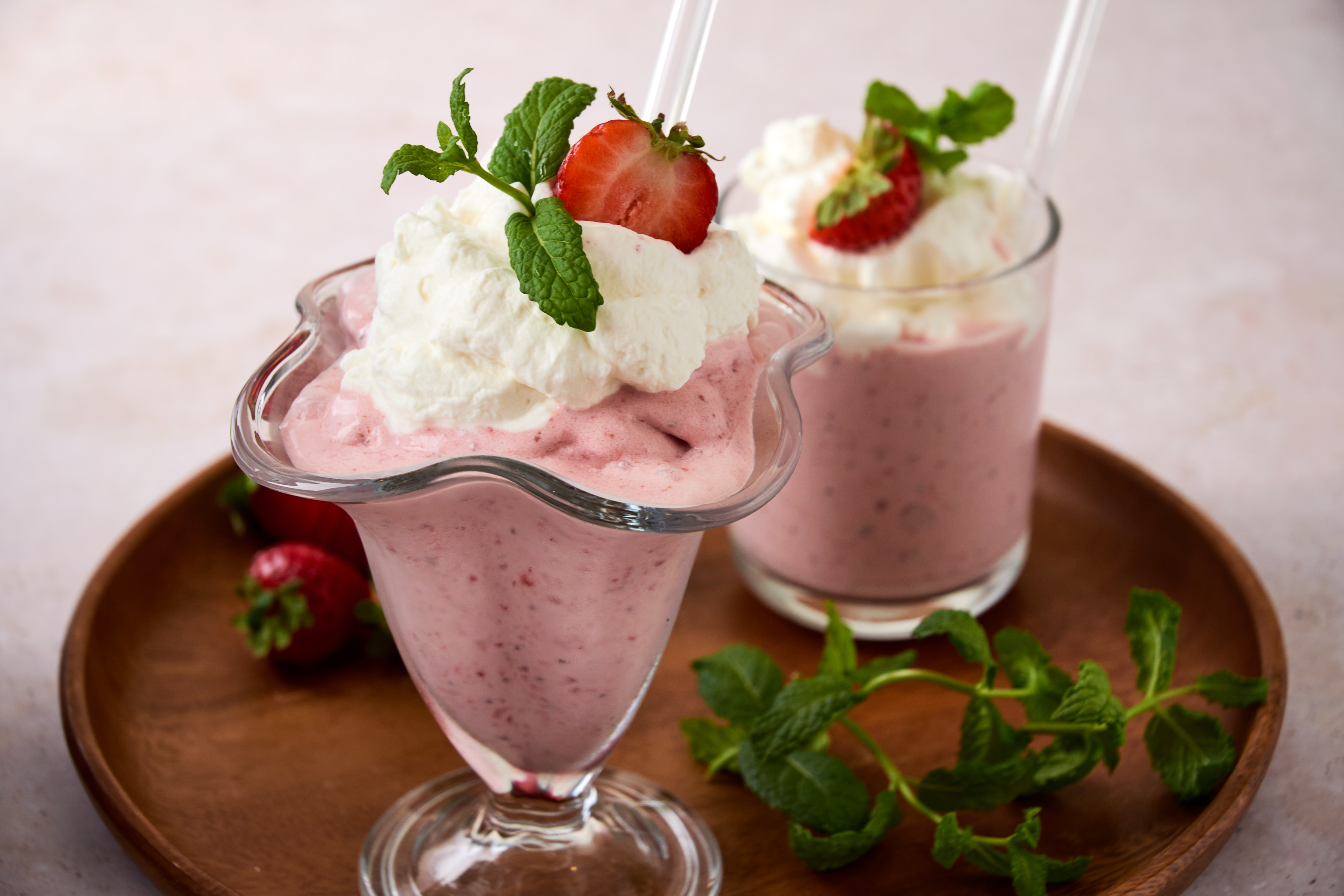 Step 3 -Serve the milkshakes garnished with the remaining Cool Whip, the remaining sliced strawberries, and the mint sprigs.