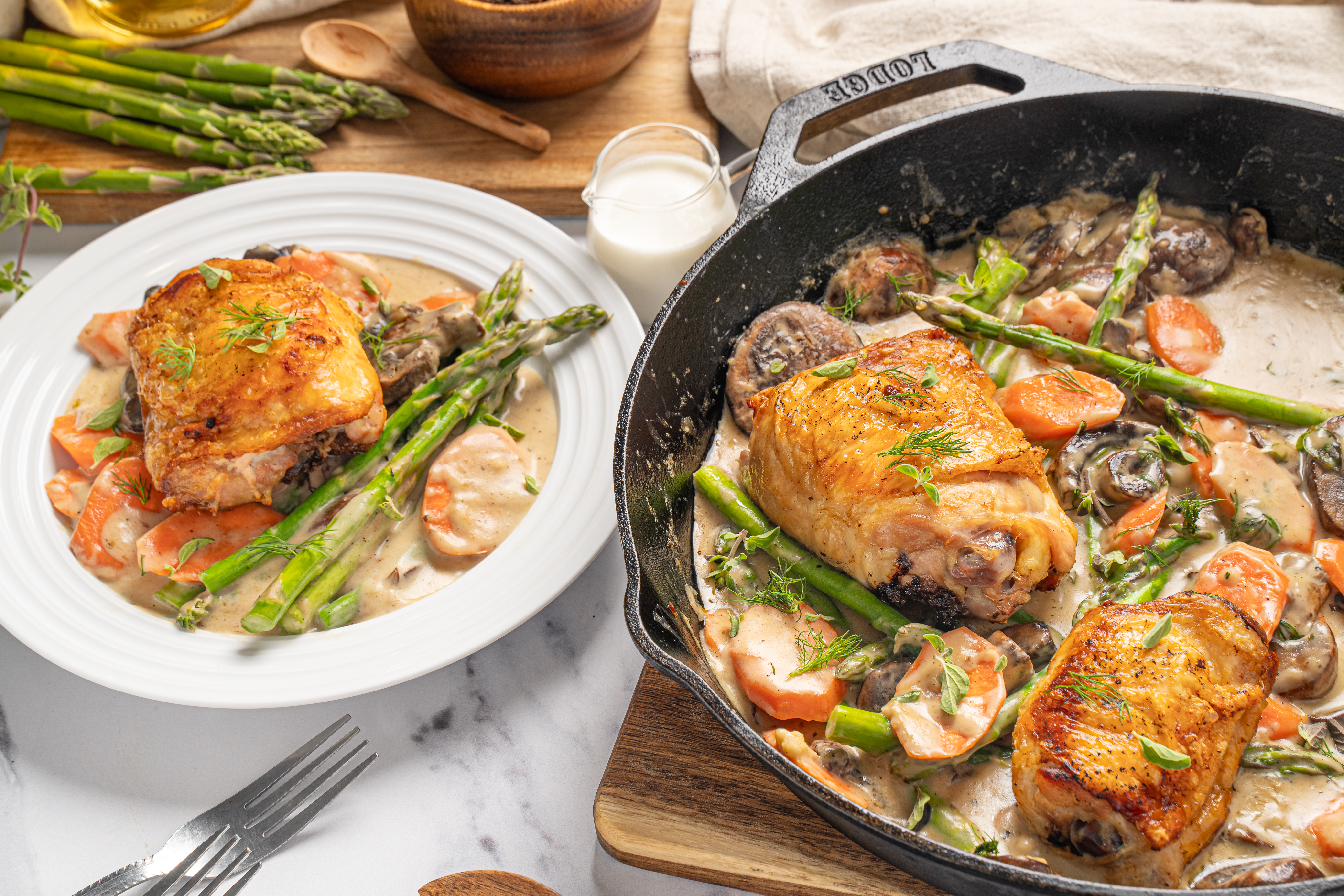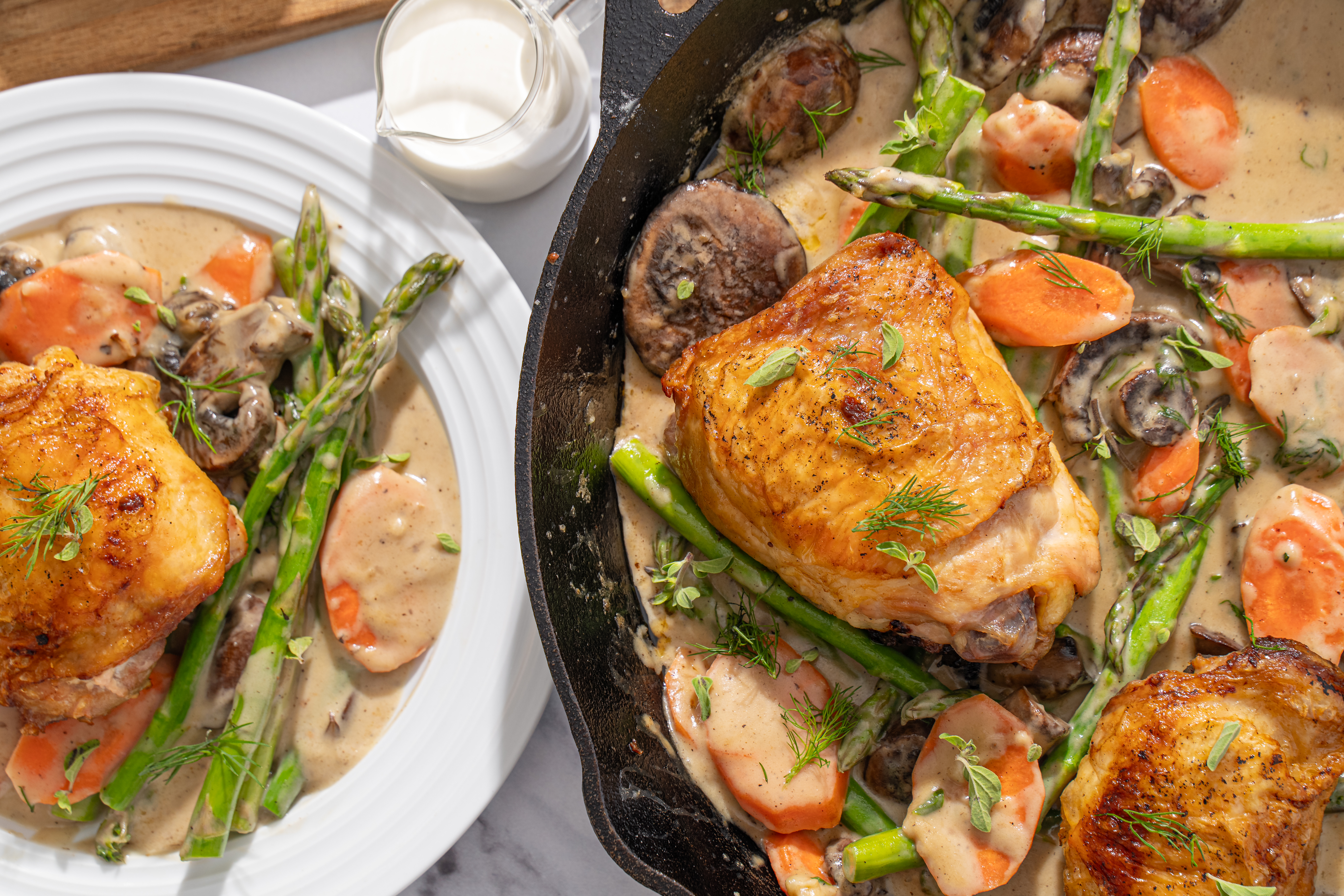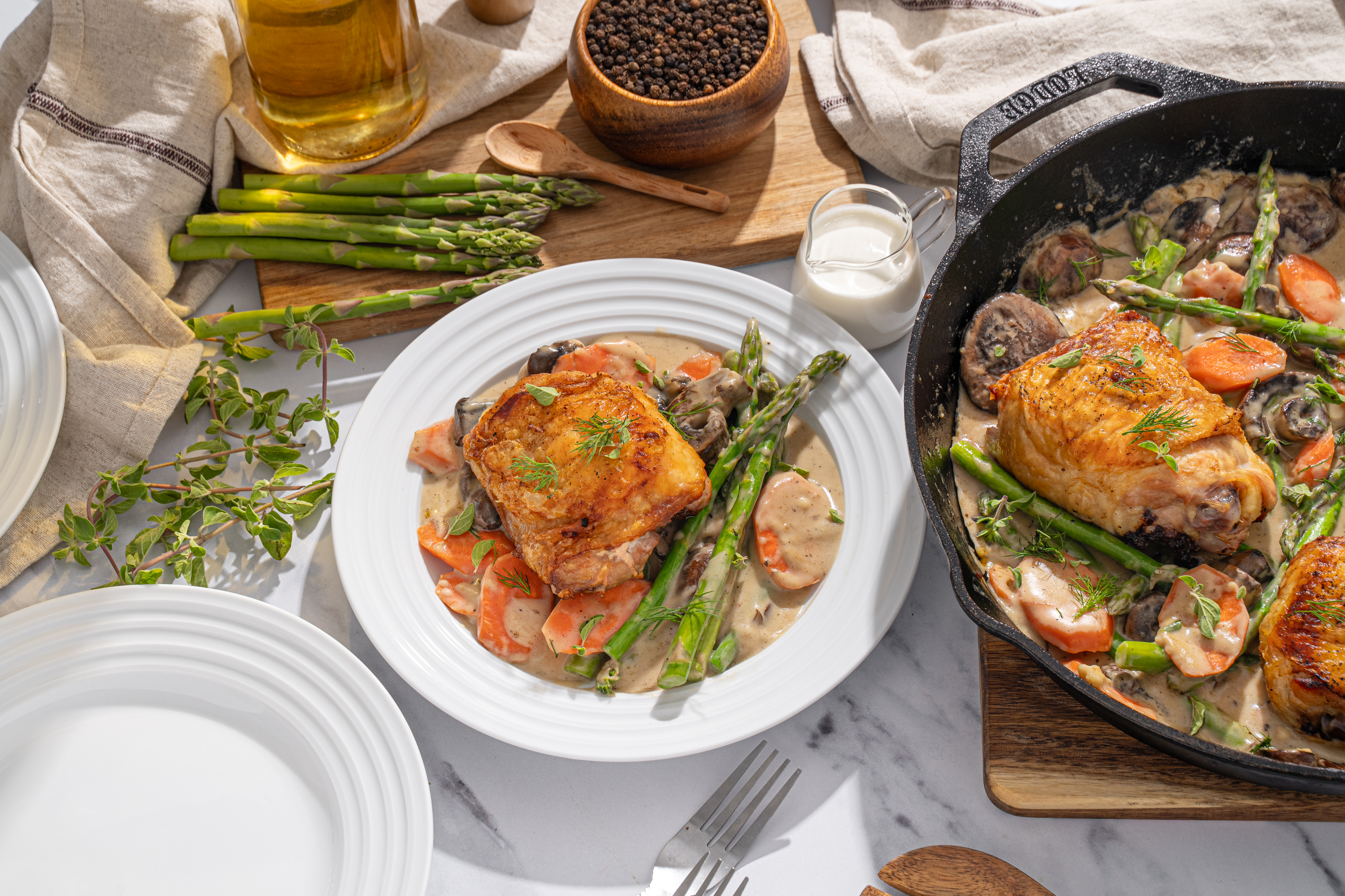 Sunday-Best Chicken & Veggies are suited up for big flavor and good times! Golden roasted chicken, in a savory cream sauce, with plenty of crisp-tender vegetables and beefy mushrooms! How can anyone resist? Well, you won't be able to once you get the first bite of Sunday-Best Chicken & Veggies in your mouth!