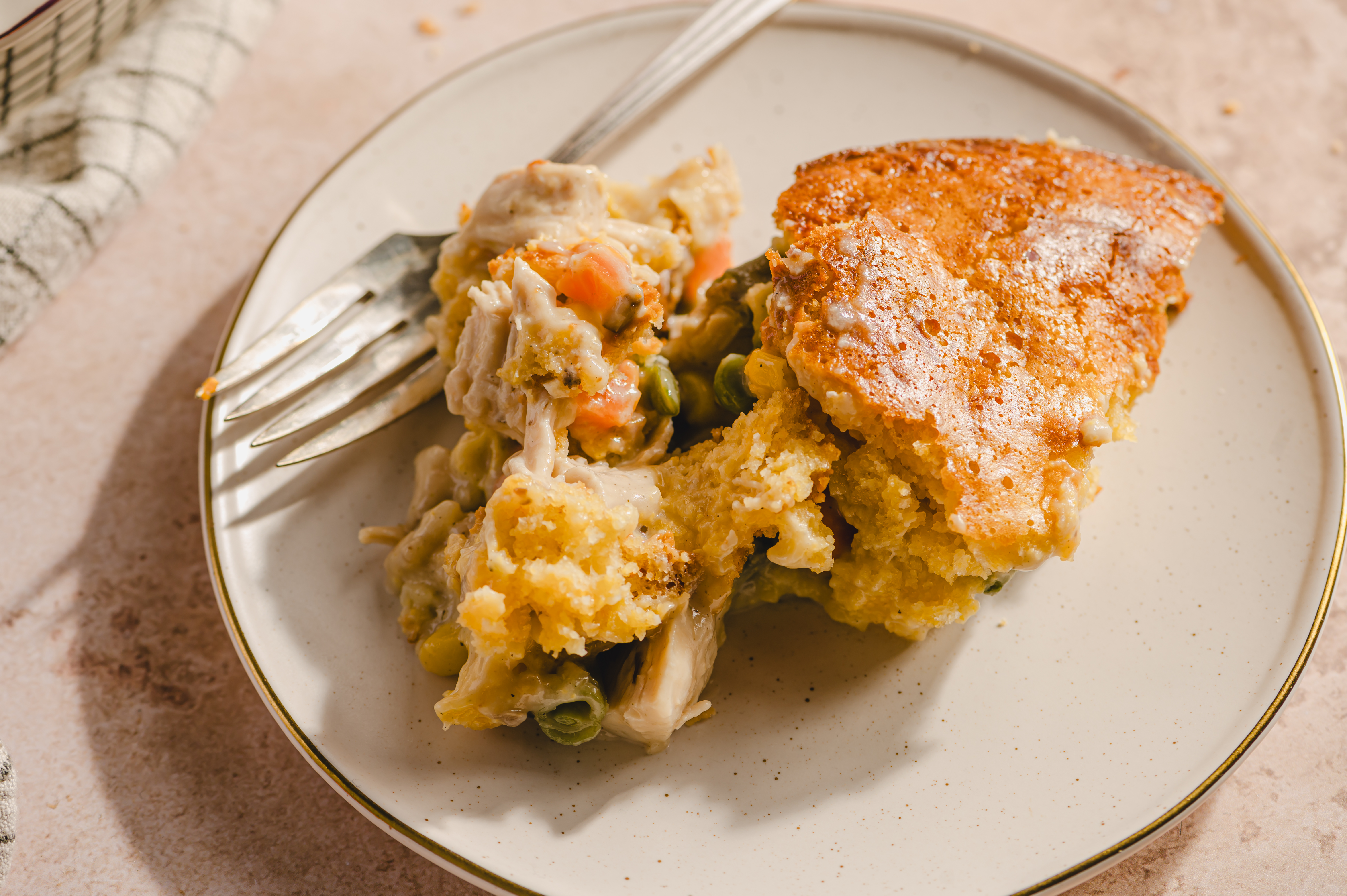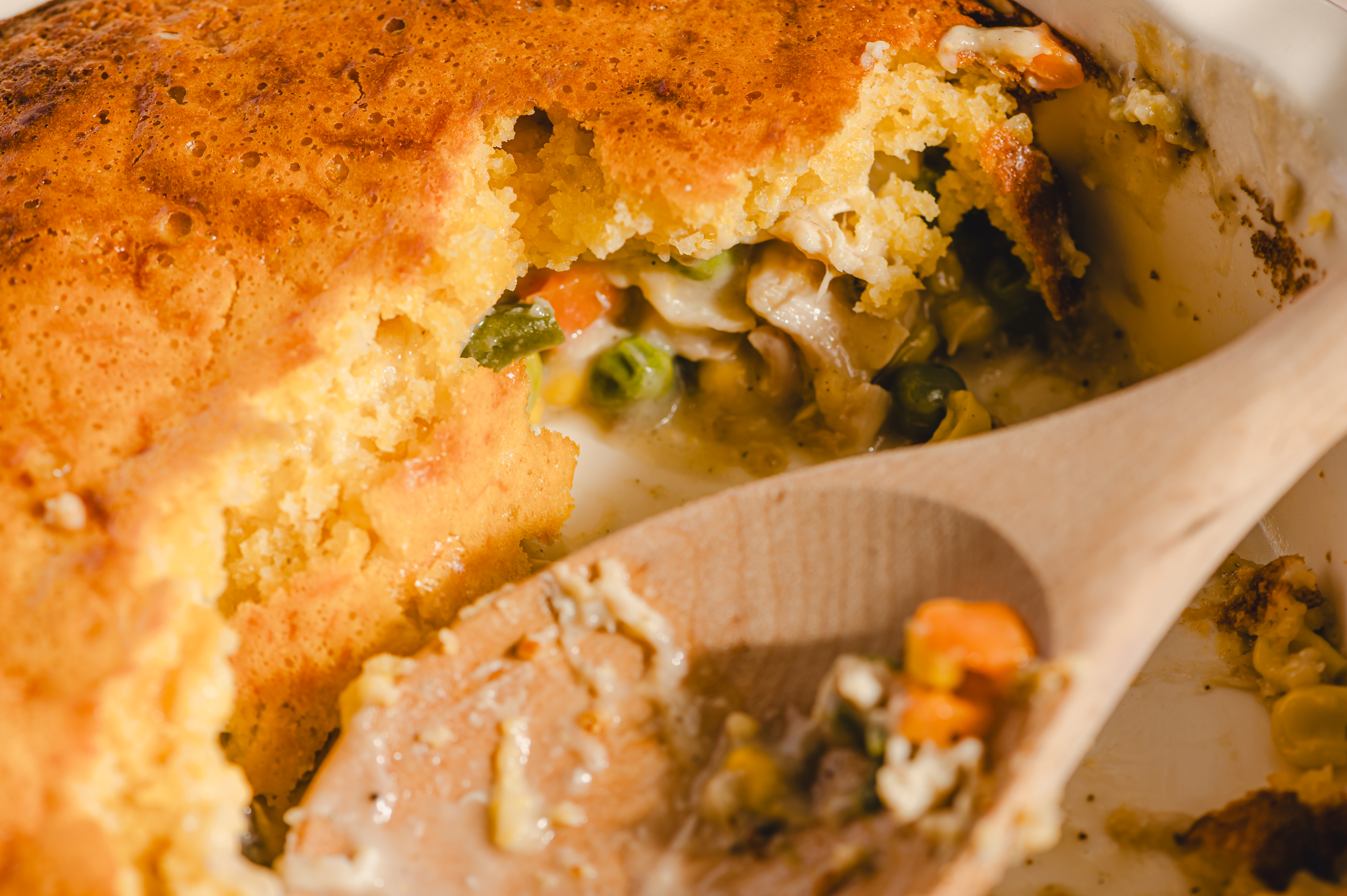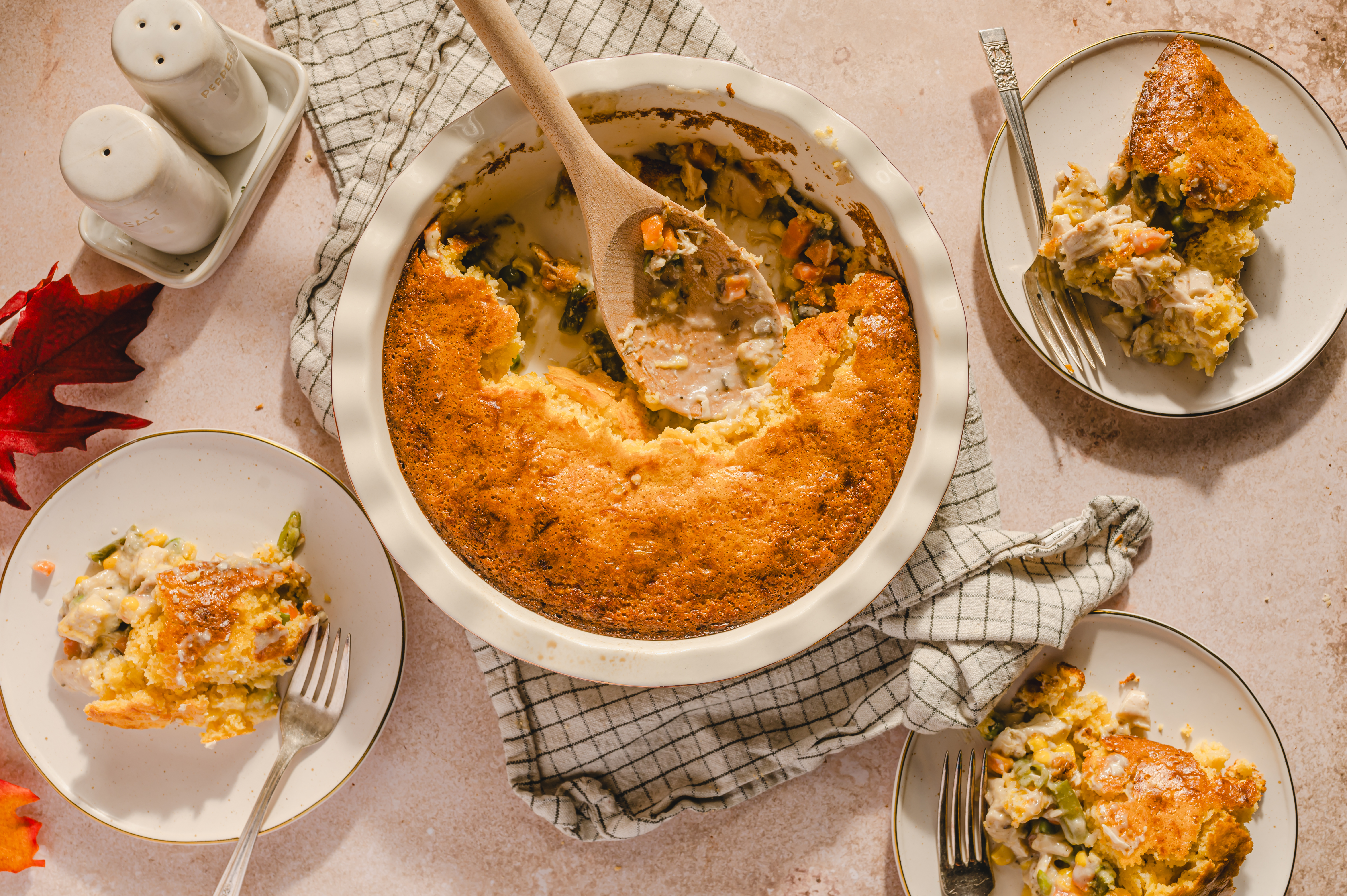 A quick and easy pot pie to make your Thanksgiving leftovers truly delish! Who could say no to that? Not us! Turkey Cornbread Bake has a creamy, savory turkey filling bubbling away beneath a golden and cheesy cornbread. Nothing tastes or feels more festive than Turkey Cornbread Bake! Slice in and savor the joy!